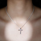 Make a bold move with this simple yet stunning Cross Heart Necklace adorned with beauty and brilliance. This lovely Cross Faith Necklace has a striking design that really catches the eye. It features double elements, with a heart charm intertwined with the cross symbol. The heart, which has an open center, is the centerpiece where the horizontal and vertical arms of the cross meet. Tiny round cut Moissanite stones are set in pave setting on the heart, adding a sparkling touch. The rest of the Religious Cross Necklace is crafted from plain 14k white gold plated silver, and its hung on a cable chain made from the same metal. Make a statement with this beautiful Christian Necklace that blends quality craftsmanship with a stylish design. Its smooth and flowing look gives a soft feel against the neckline, ensuring a seamless touch. The hidden bail connects the Cross Locket to the chain without disrupting the overall aesthetic. This design offers effortless style and comfort. You can wear it solo or layer it with another necklace for a trendy look. Add this shining religious symbol to your everyday wardrobe to elevate your style with a bit of sparkle.