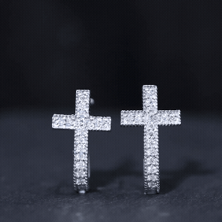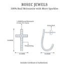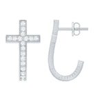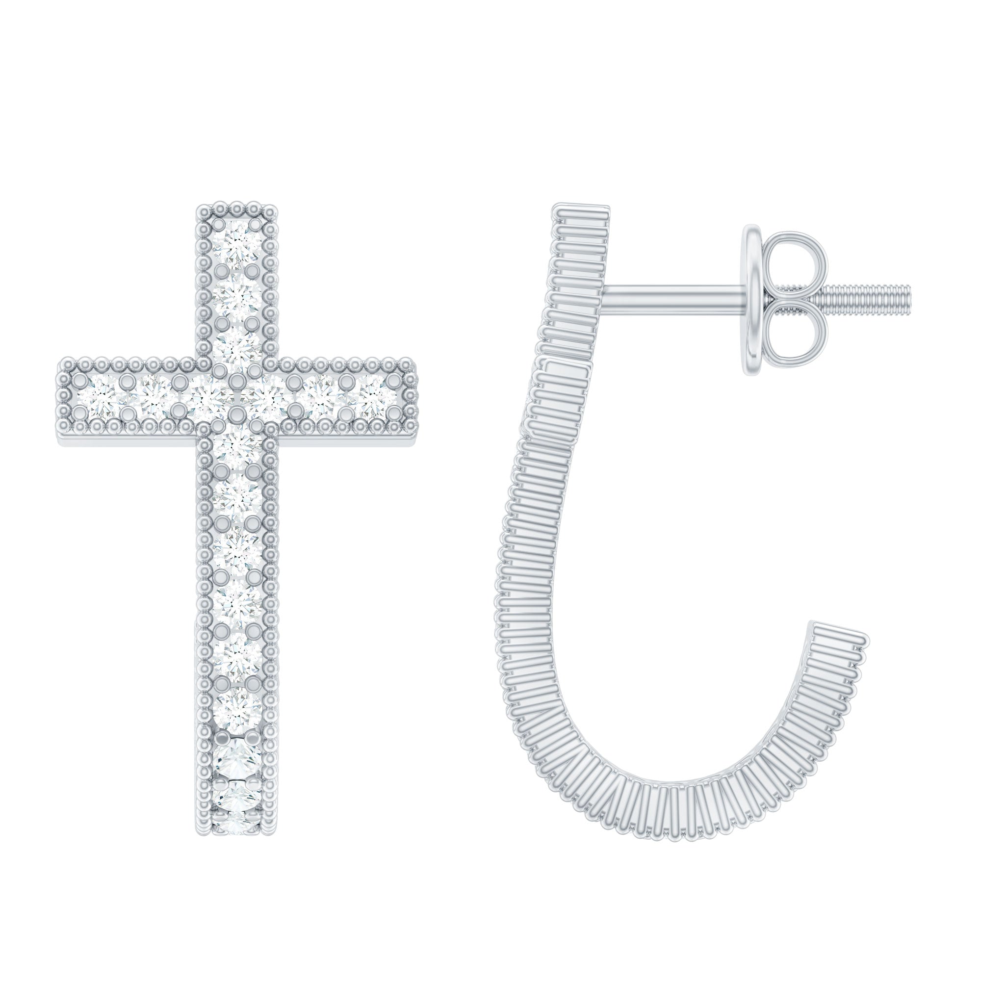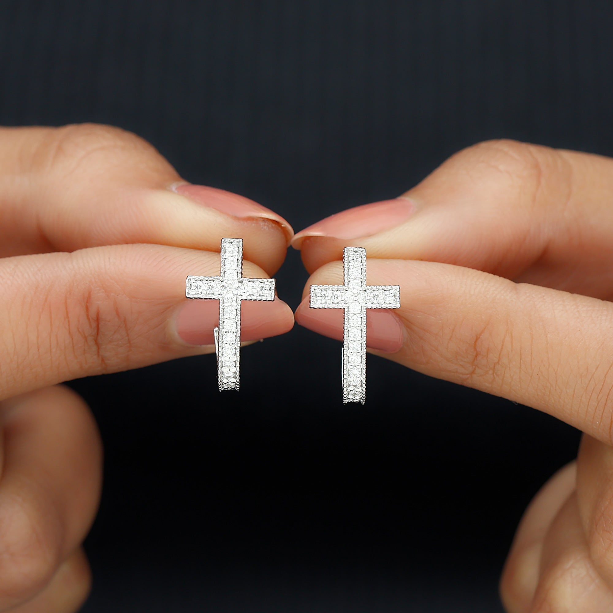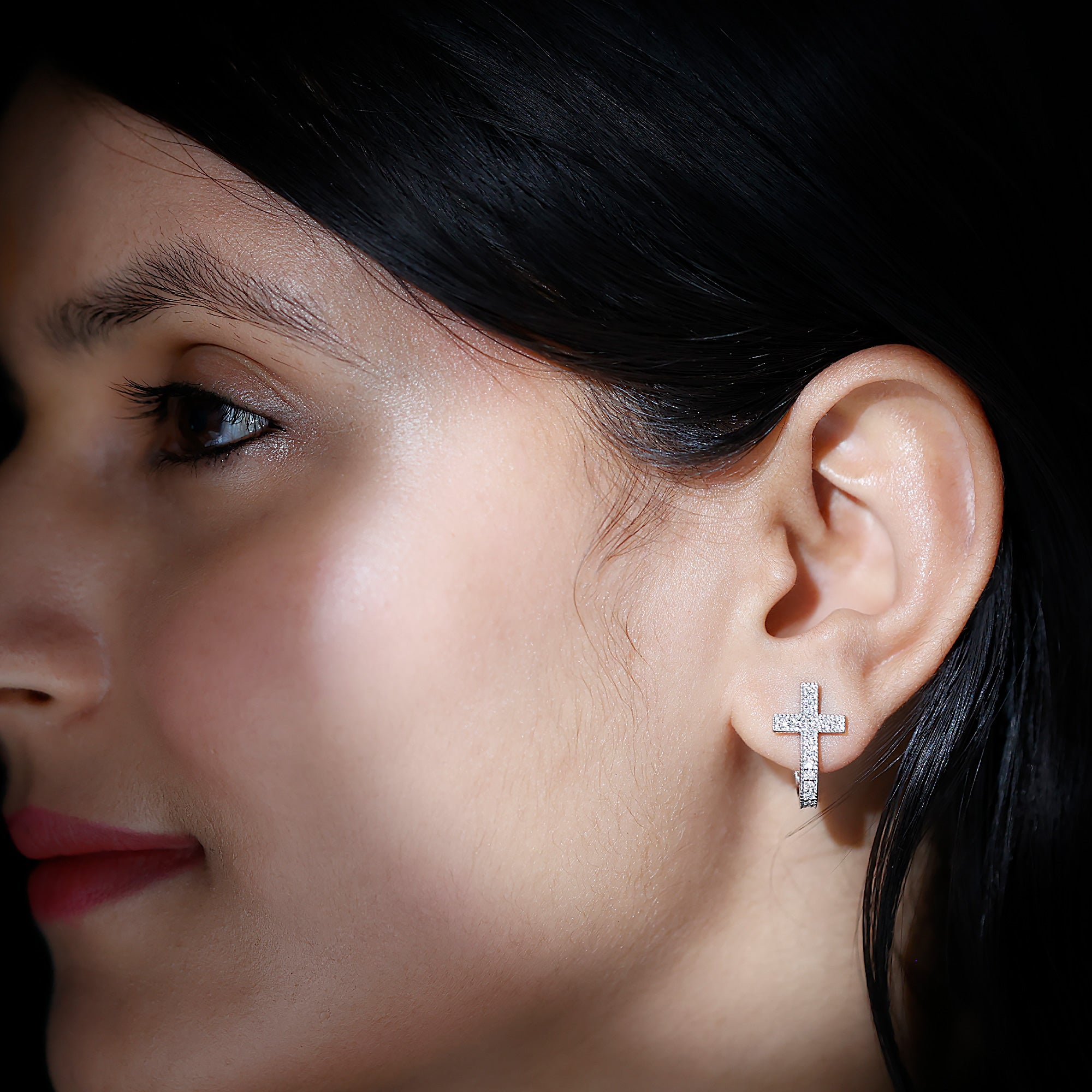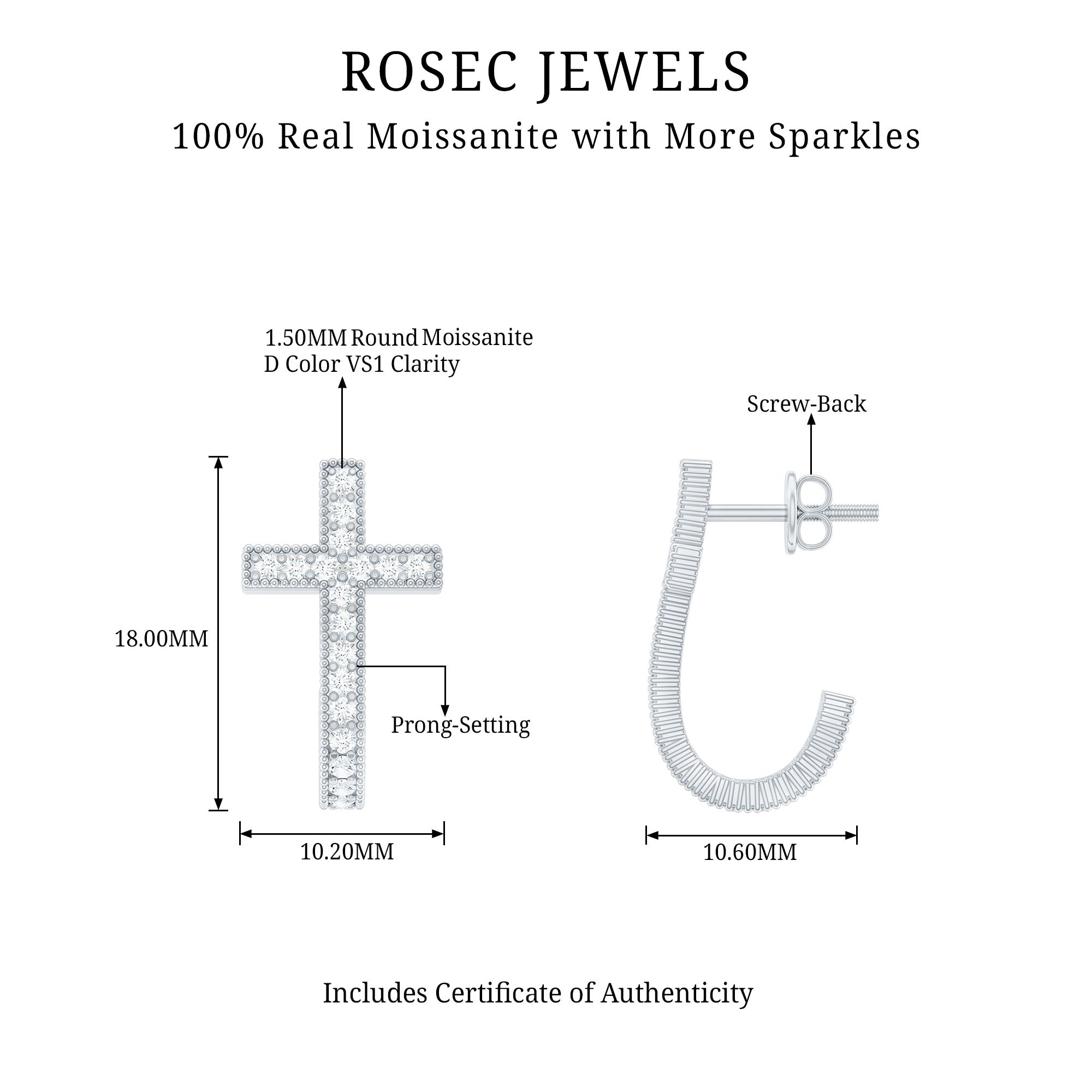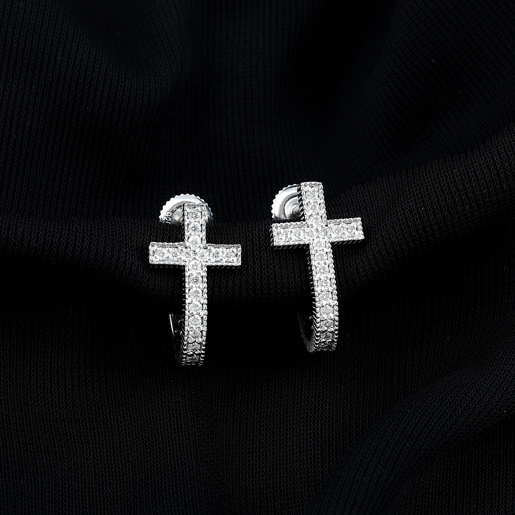 Let your faith shine bright with these stunning Cross Hoop Earrings. These elegant Silver Cross Earrings are adorned with round cut Moissanite stones set in prong setting. The cross features a charming beaded border that gives it a vintage vibe. With a secure screw back closure, these J hoops are perfect for any occasion. Our Christian Cross earrings are ideal for everyday wear, showcasing a meaningful symbol of faith. Their sleek and modern look adds a touch of elegance to any outfit. Whether youre dressing up for a special event or just want to add a little sparkle to your daily style, these Moissanite Faith Earrings are the perfect choice. Suitable for weddings, engagements, and festive occasions like Christmas, Easter, and Good Friday, this versatile pair is a must-have for your jewelry collection.
