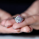 Looking for a perfect ring to make your lady happy, weve got your back with this Moissanite Ruby Designer Ring crafted precisely with 14K White Gold Plated Silver. The ring features an 8 MM Round Shape Moissanite securely placed in Prong Setting and encircled by smaller round shape Moissanite and Lab Grown Ruby secured in Bezel Setting. This Halo Engagement Ring beholds the classic shine of D-VS1 Quality Moissanite and AAAA quality Lab Grown Ruby, which makes it perfect for the celebration of love. This Large Engagement Ring will be delivered to you in a velvet pouch for storage, along with the certificate of authenticity.