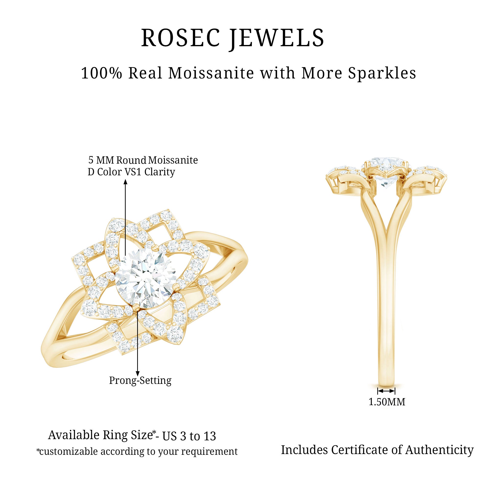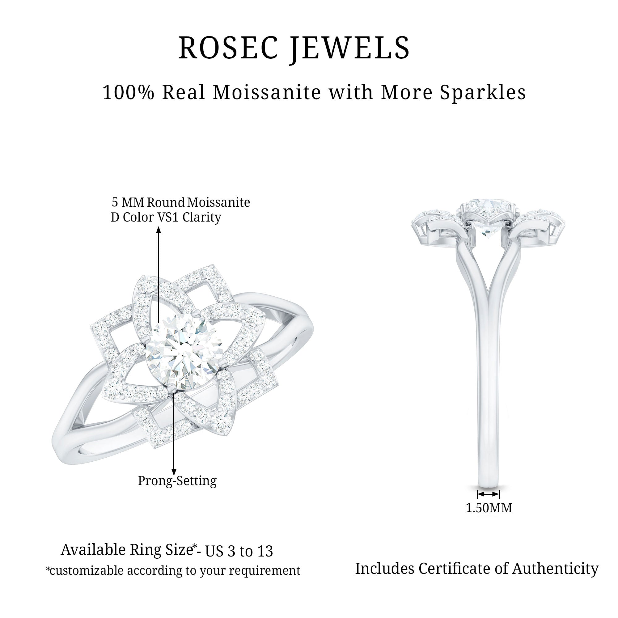 This stunning Moissanite Flower Ring is a unique blend of artistry and sparkle, designed to make every moment feel special. At the center, a brilliant 5 MM round cut moissanite securely held by prong setting. Surrounding the center stone is a floral halo, creatively crafted from small round moissanite stones arranged like delicate petals. The design gives the Flower Engagement Ring a refined yet bold character that feels elegant and fresh. The split shank adds an open, airy feel that balances the detailed floral setting. The overall look is a mix of modern structure and floral softness, ideal for someone who appreciates fine design with a personal touch. Whether you are choosing it as an engagement ring or wearing it as a statement cocktail piece, this Moissanite Engagement Ring stands out effortlessly. The flower motif adds a romantic feel, while the split band and precise stone placement give it a unique, contemporary edge. The D-VS1 quality moissanite stone offers brilliant sparkle and is known for its durability, making this Cocktail Ring perfect for everyday wear or special occasions. It is a great way to express individuality and style through something meaningful and beautifully made.