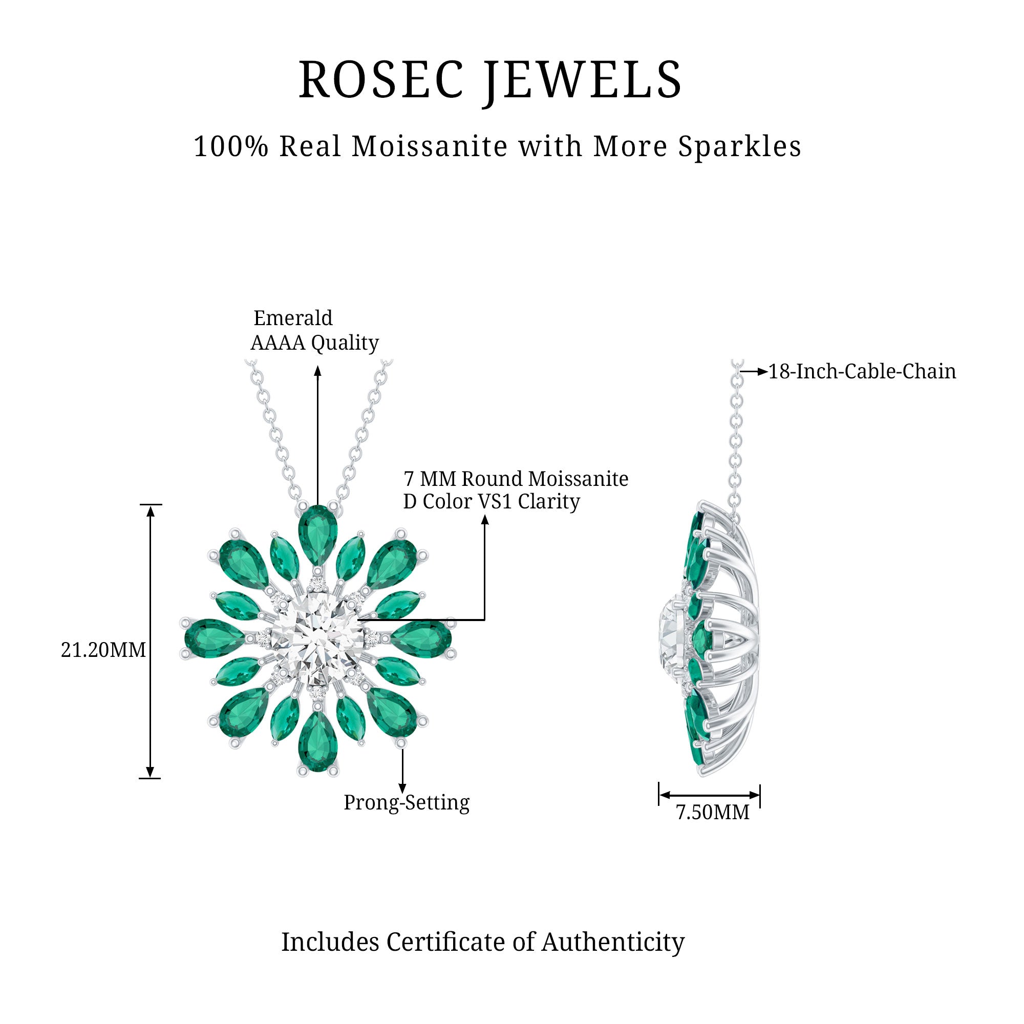 Bring floral elegance to life with this enchanting Statement Flower Necklace, a show-stopping piece inspired by the beauty of nature in full bloom. At the heart of this radiant design sits a brilliant 7 MM round moissanite of D Color and VS1 Clarity, meticulously set in prong setting. Encircling the center stone is a classy arrangement of round cut dainty moissanites and vivid green lab created emeralds, thoughtfully placed in a stunning combination of pear and marquise cuts. These emeralds mimic the elegance of flower petals, extending outward in a vibrant burst of color that evokes the look of a blossoming bloom. Every element of this Moissanite and Emerald Necklace has been crafted to reflect harmony, balance, and grace. The interplay between the vivid green emeralds and the brilliant cut moissanites gives this piece a luxurious look. Perfect for special occasions, glamorous evenings, or anyone looking to make a bold style statement, this piece effortlessly captures attention and admiration. Whether you are gifting it to someone who appreciates bold, beautiful jewelry or adding a floral flourish to your own collection, this Moissanite Necklace for Women is a celebration of beauty, sparkle, and timeless charm - designed to bloom forever.