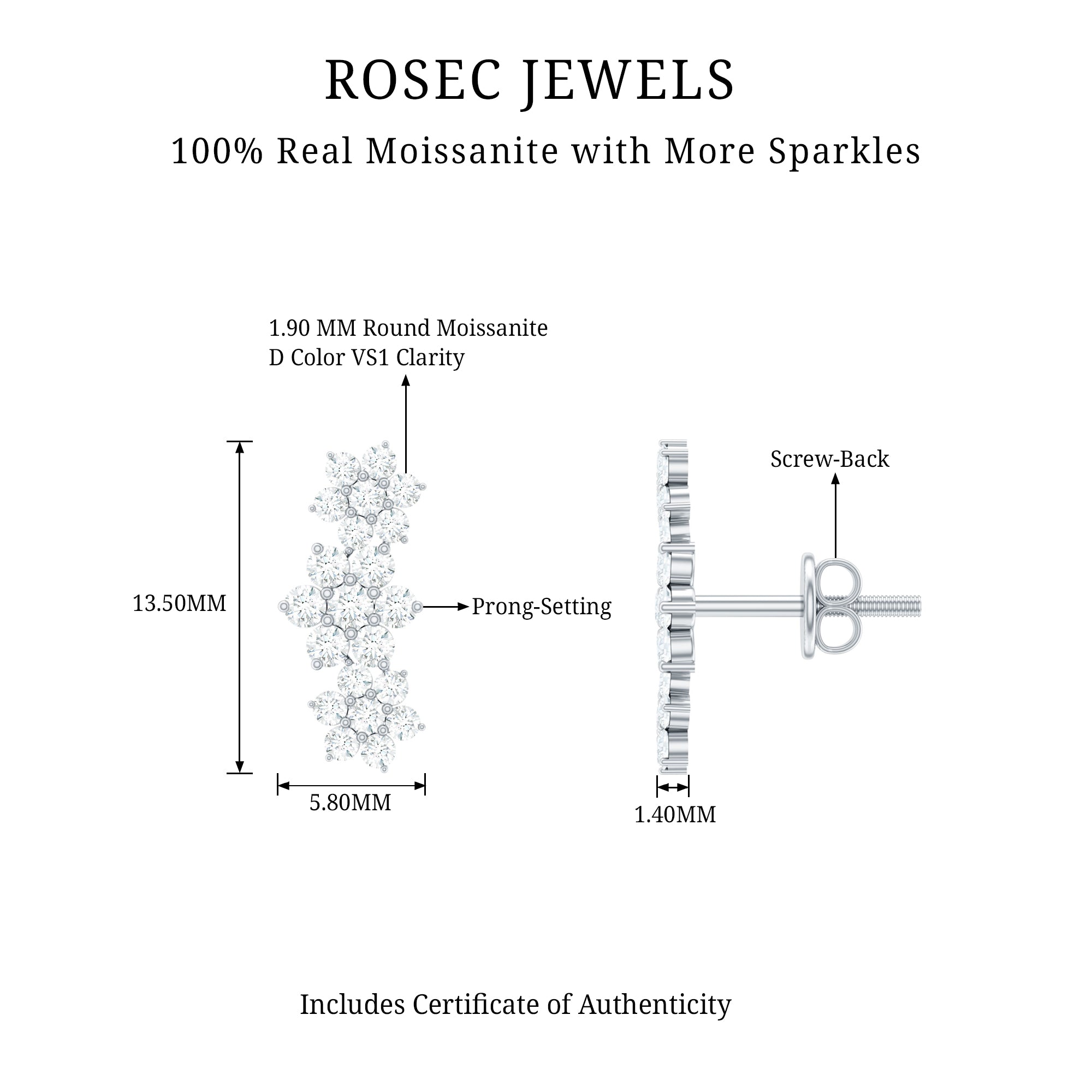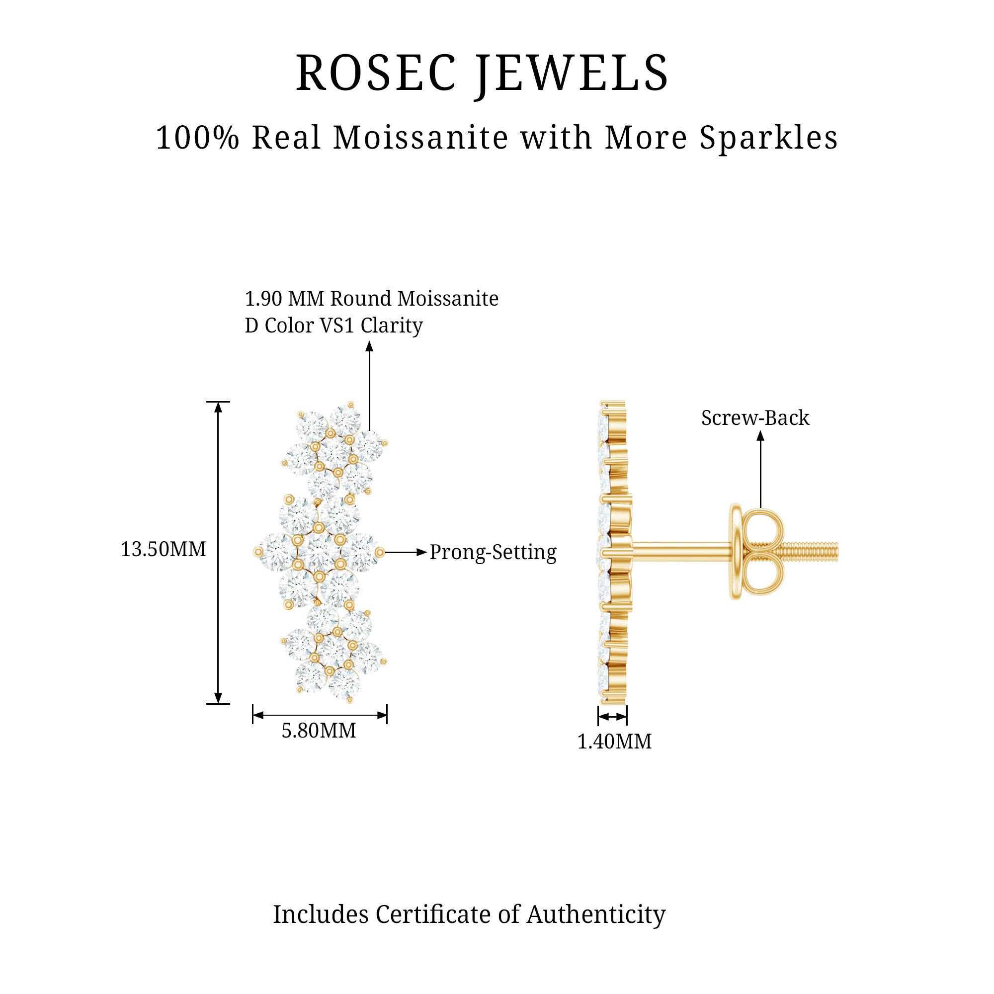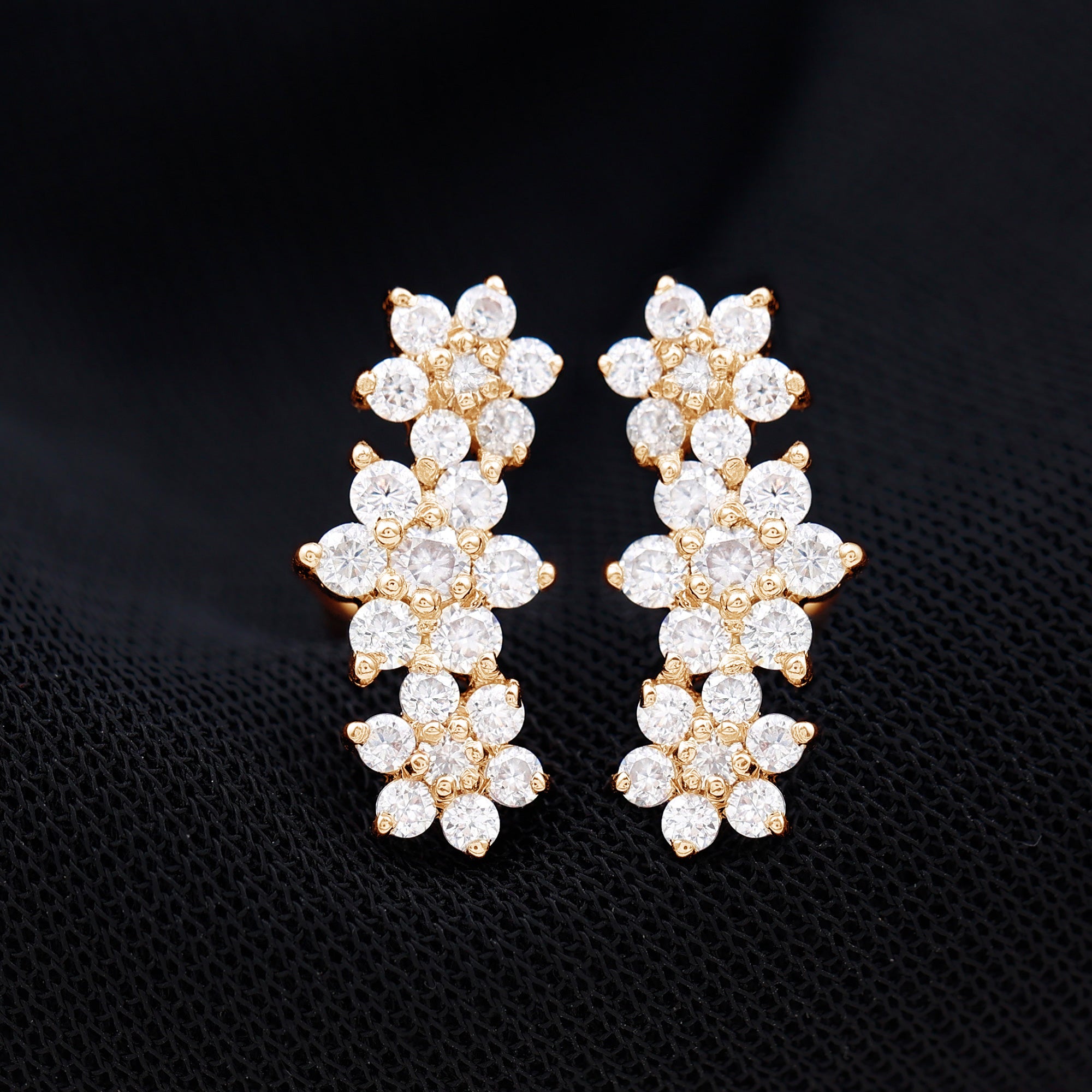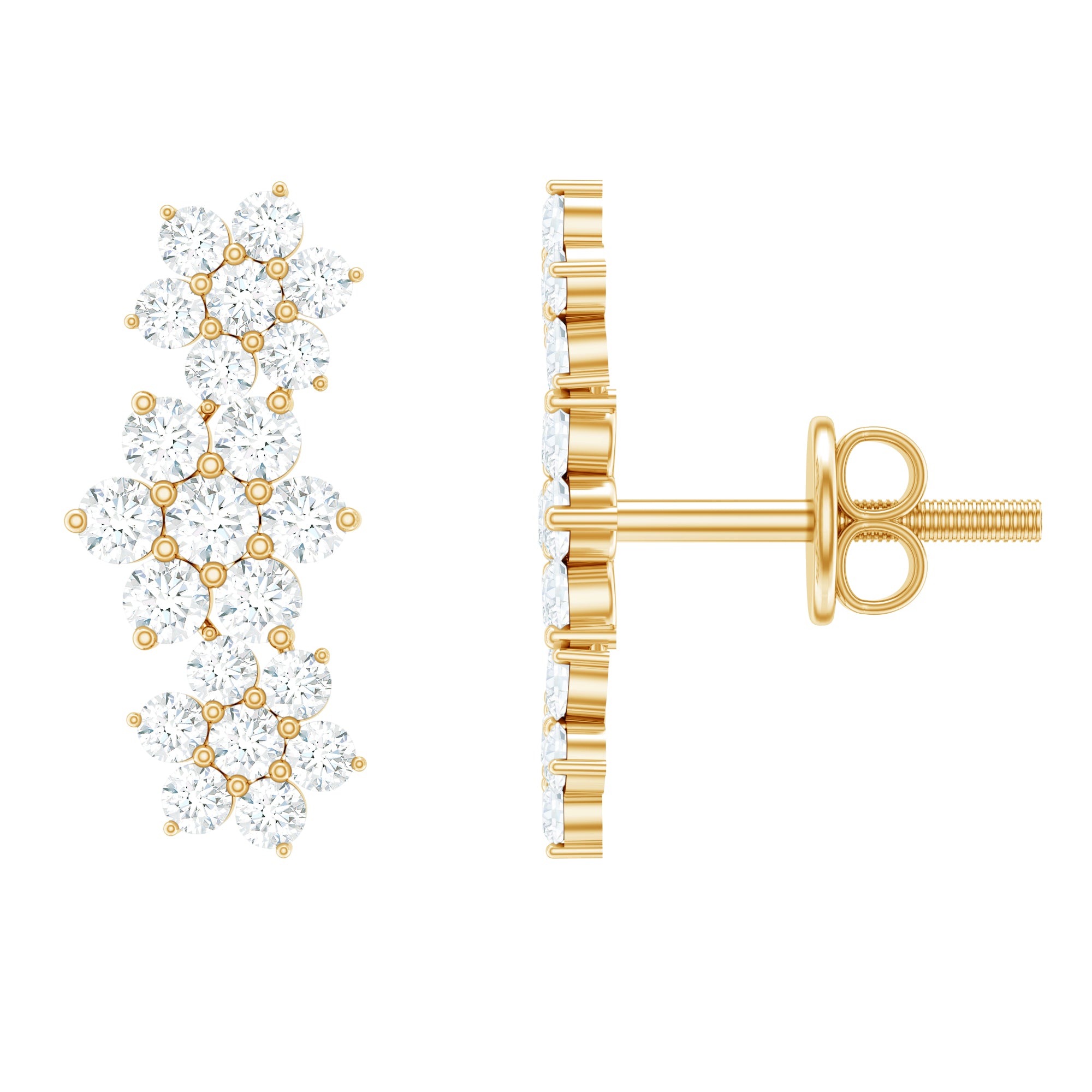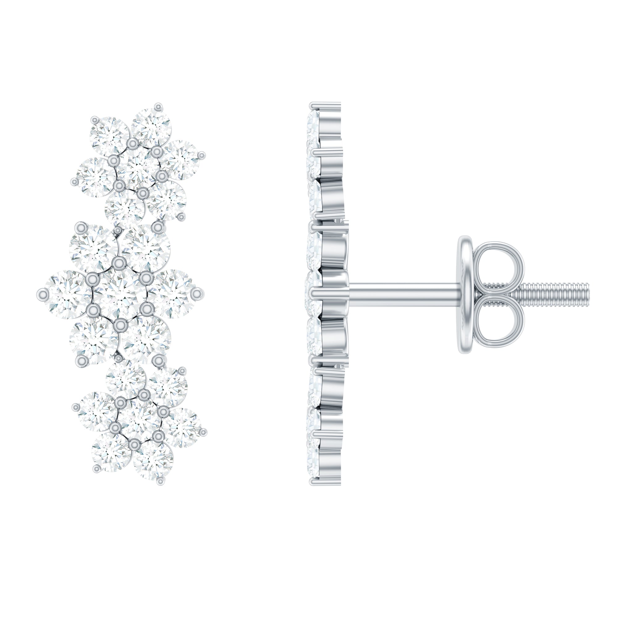 A perfect addition to your Jewelry Collection, these Moissanite Ear Crawler Earrings effortlessly blend elegance. Crafted with perfection, delicate floral motifs are adorned with sparkling Round Shape Moissanite gemstones that gently climb the earlobe, creating a stunning cascading effect. Their versatile design is perfect for both from day to night look, adding a touch of sophistication to glamour to any outfit. Secured with Screw Back Closure, these Moissanite Floral Earrings exude timeless charm.
