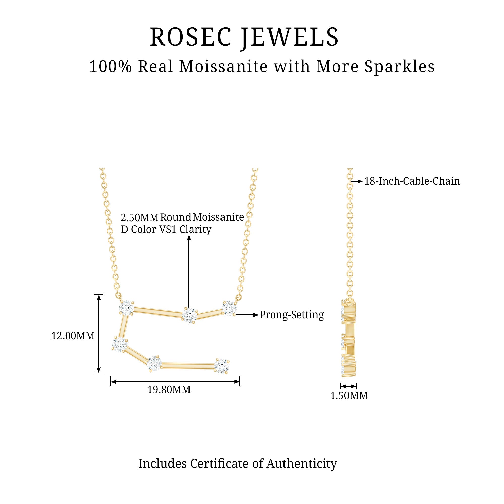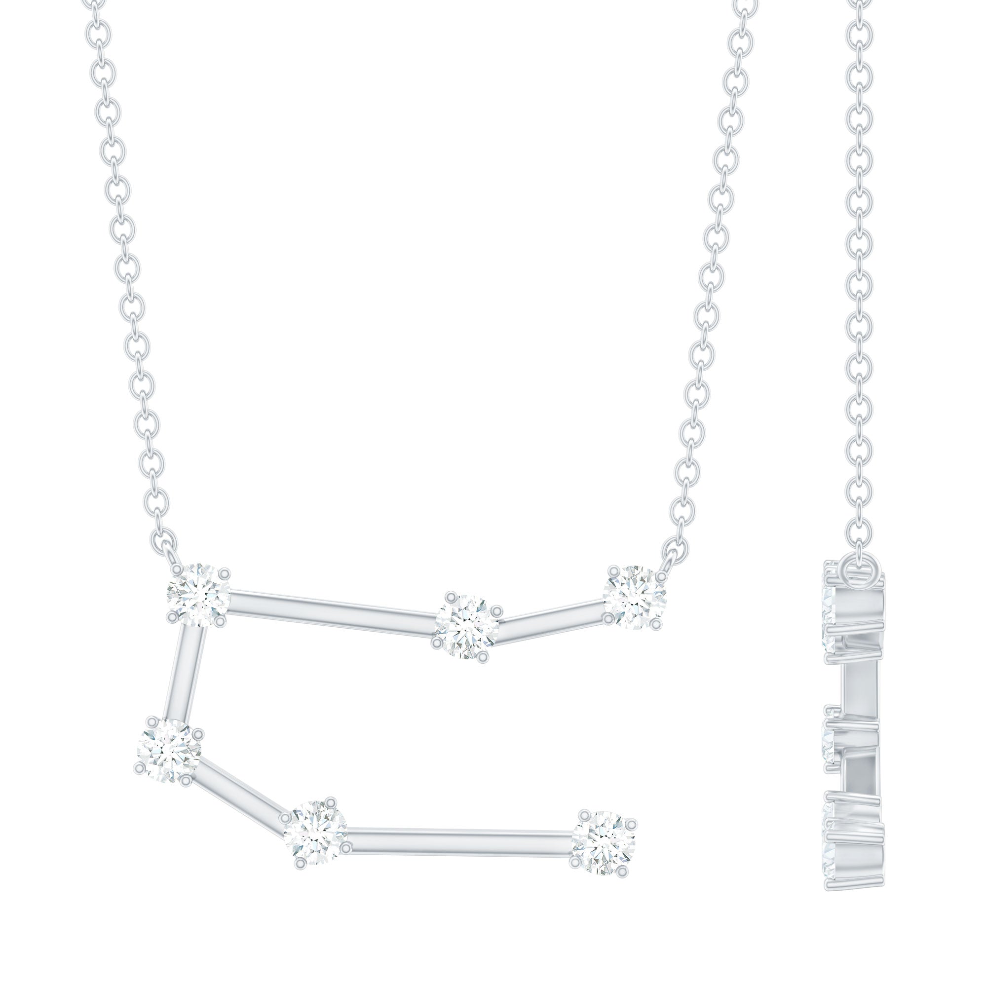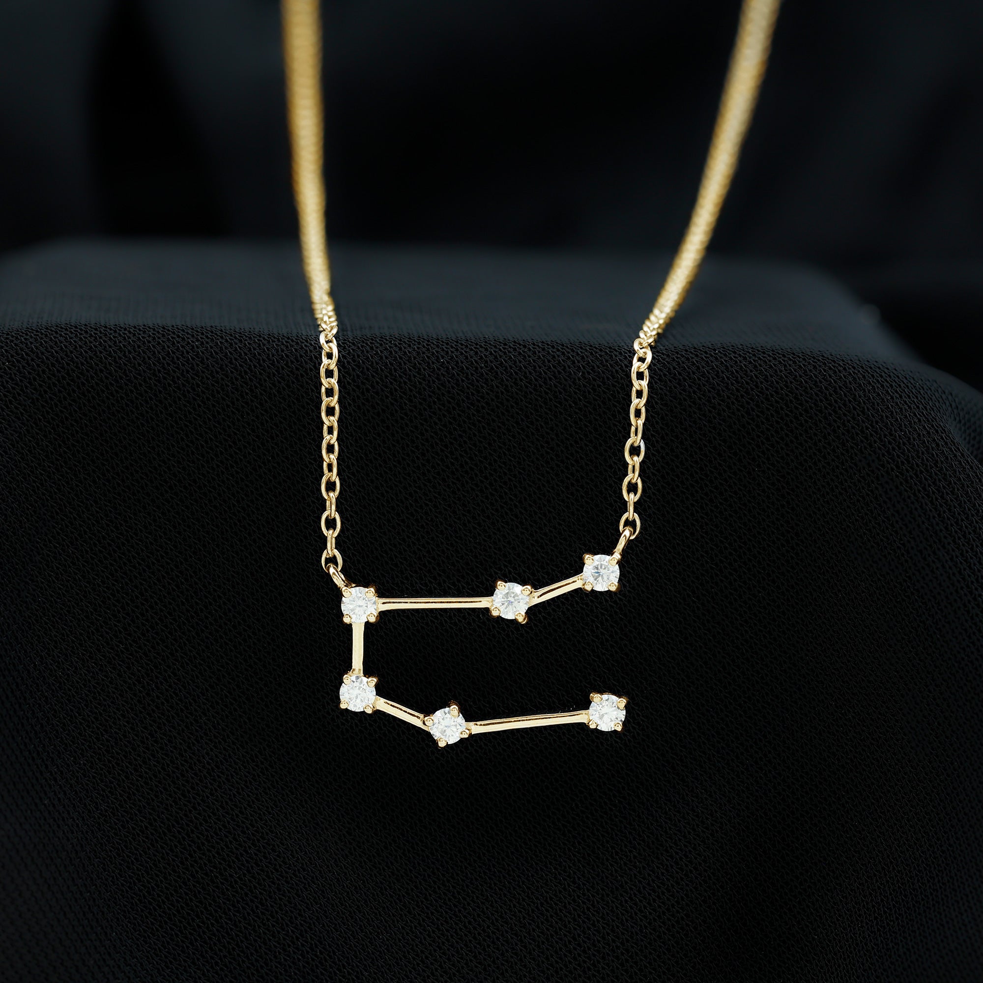 Add a meaningful touch to your jewelry collection with a piece designed for Gemini personalities. The Gemini Zodiac Necklace features the constellation of Gemini, crafted with sparkling round brilliant cut moissanite stones set in secure prongs. Each stone is carefully connected with delicate metal bars, forming the shape of the Gemini constellation, representing versatility, curiosity, and intelligence. Designed for both everyday wear and special occasions, the Gemini Moissanite Necklace adds a subtle sparkle to any outfit. Its elegant design pairs easily with casual or formal styles, making it a versatile accessory that highlights your zodiac identity. The D color VS1 clarity moissanites bring brilliance and radiance, creating a timeless piece that draws attention with understated sophistication. Ideal as a thoughtful birthday gift, a meaningful keepsake, or a personal statement piece, this Constellation Necklace symbolizes personality, charm, and self-expression. Hanging gracefully from a delicate cable chain, it ensures comfort throughout the day while making a celestial statement.