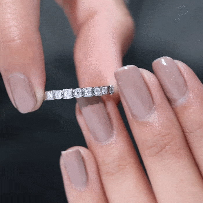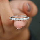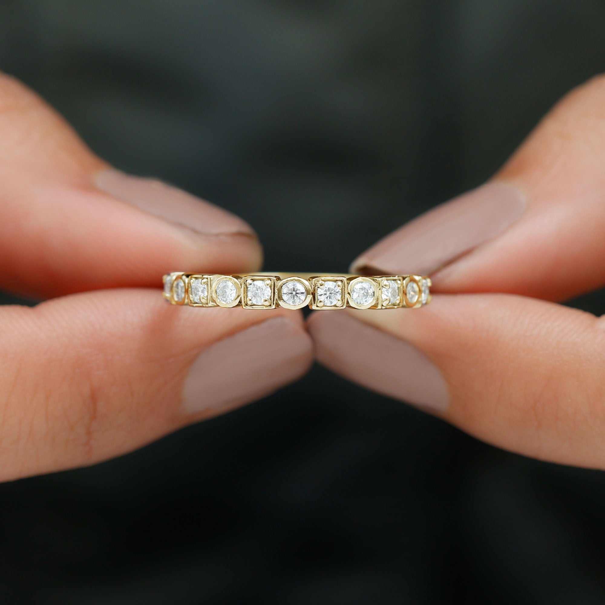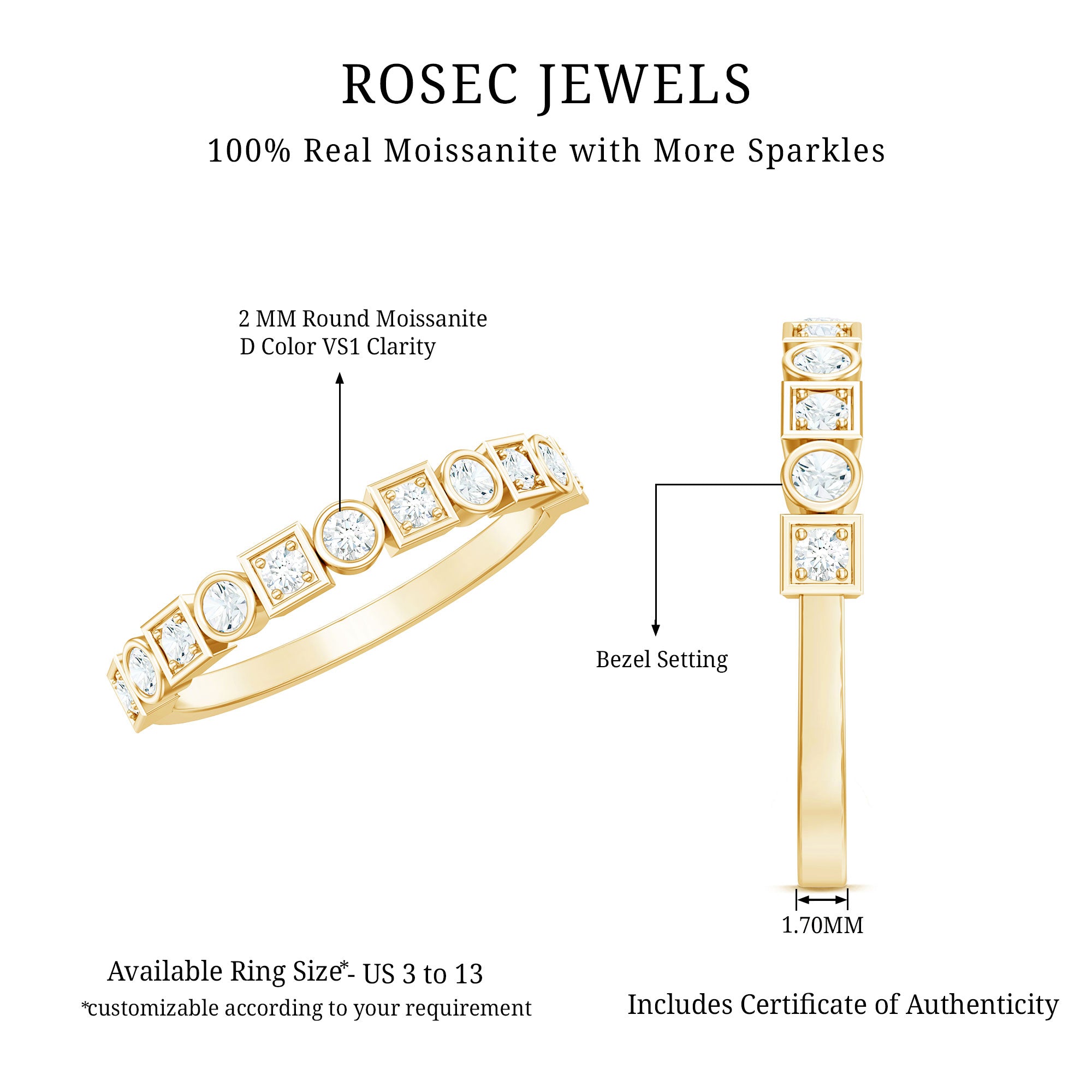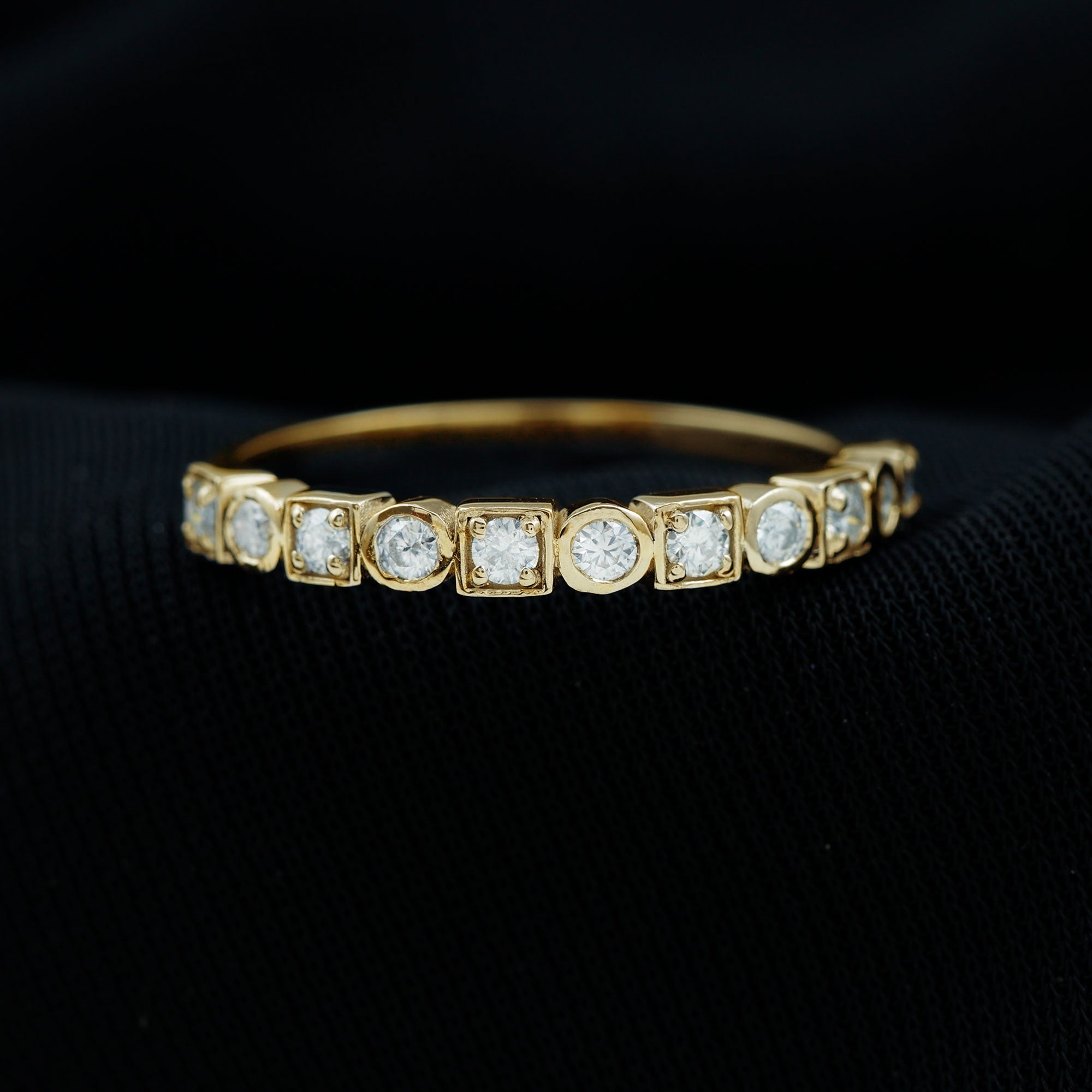 Bold symmetry meets timeless sparkle in this Moissanite Half Eternity Band, a stunning piece that redefines elegance with a modern edge. Designed for the contemporary bride or style-savvy woman, this Stackable Ring features an eye-catching pattern of alternating square and round geometric shapes, each housing a brilliant round cut moissanite that radiates fire and brilliance from every angle. The moissanite stones, known for their D color and VS1 clarity, are ethically sourced and offer a dazzling alternative to traditional diamonds. Each stone is securely nestled in its own geometric frame, creating a mesmerizing sequence of light and form that flows seamlessly across the Eternity Wedding Band. This Moissanite Wedding Band beautifully captures the idea of everlasting love while leaving room for comfort and flexibility. Its stackable style makes it a versatile addition to your jewelry collection, whether worn solo for a minimalist look, paired with an engagement ring, or stacked with other bands for a bold, layered statement. Crafted with attention to detail and designed for both visual impact and everyday wear, this Anniversary Ring is a celebration of individuality and enduring connection.