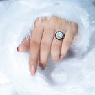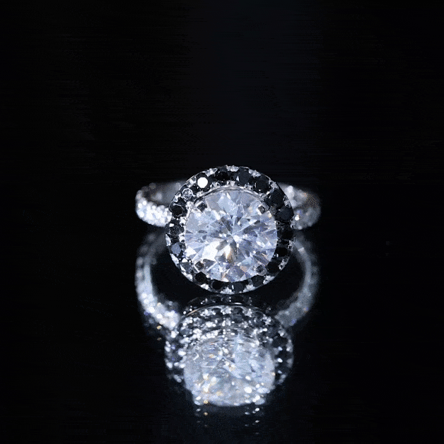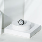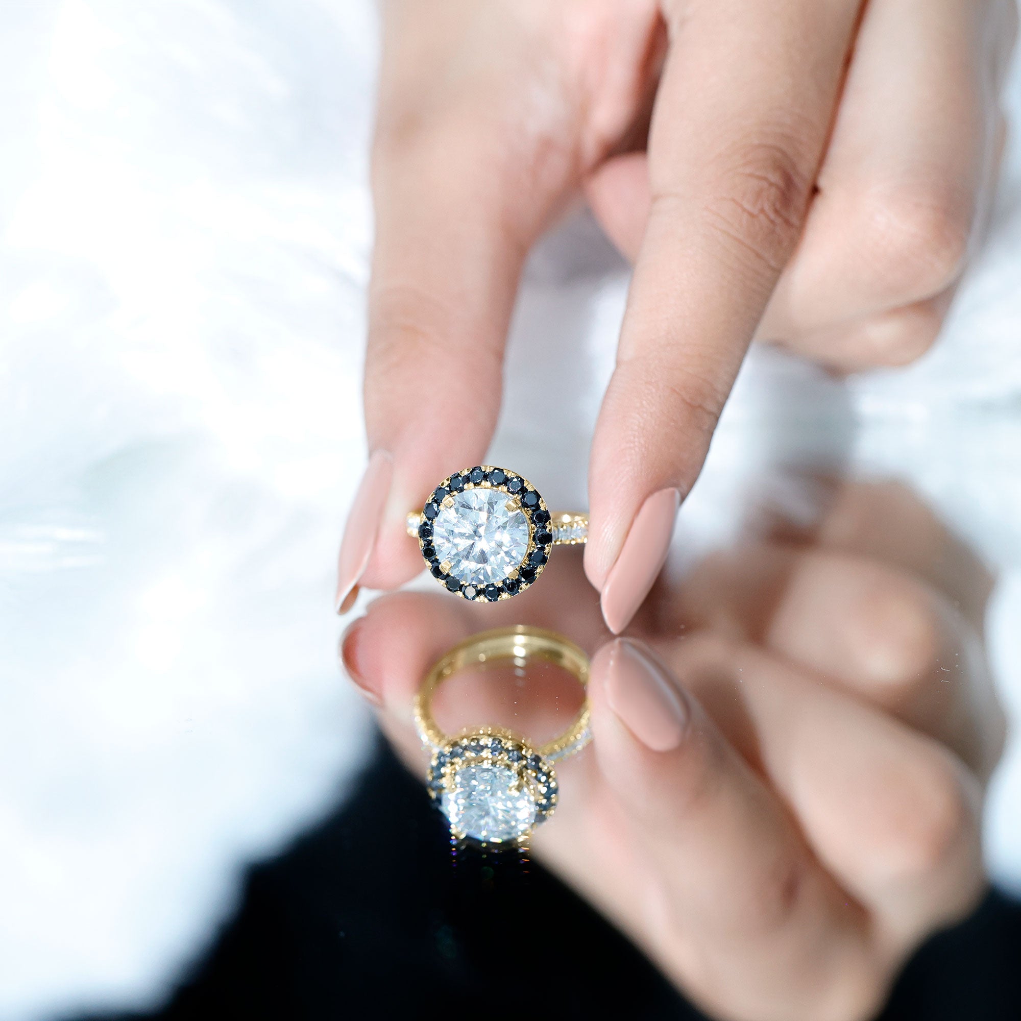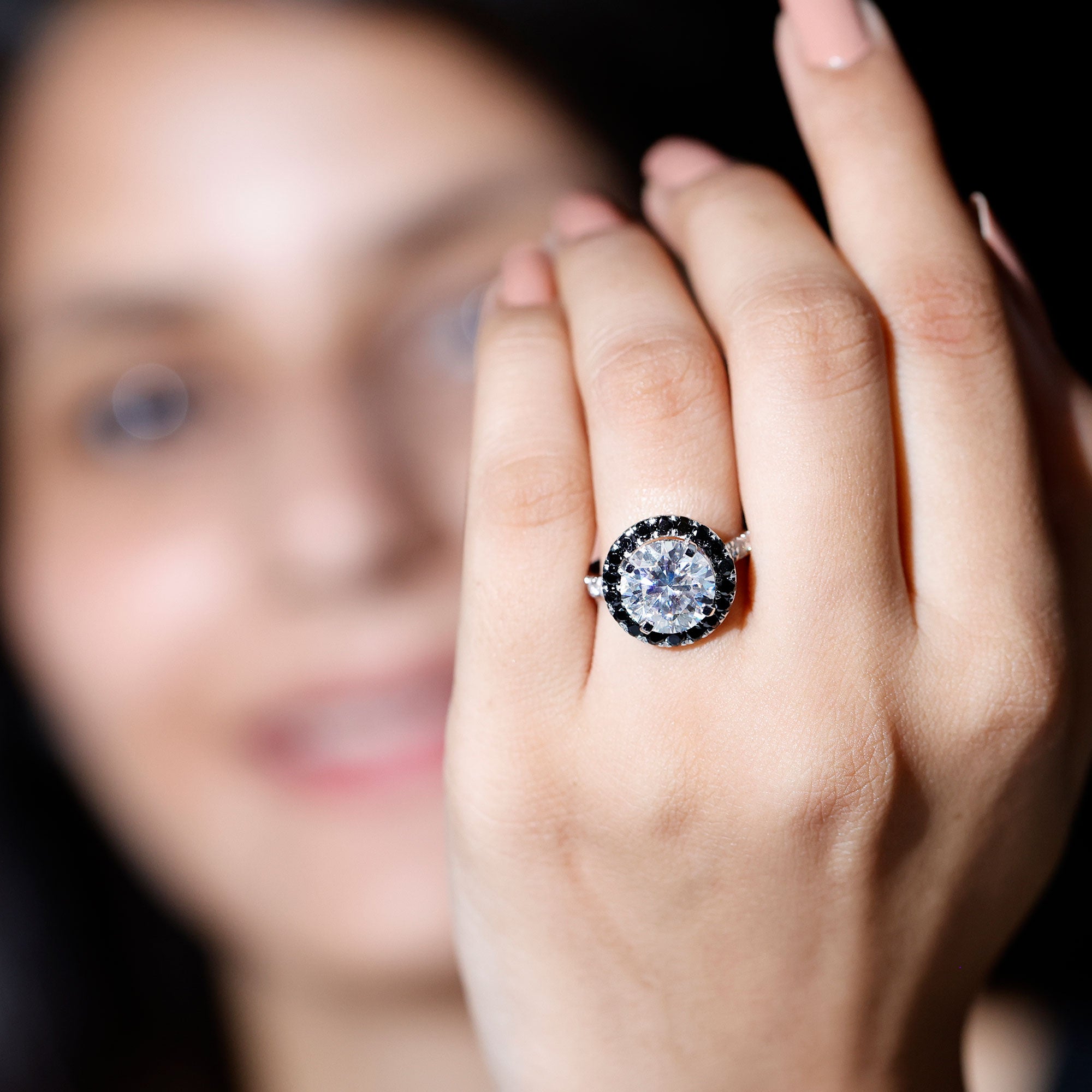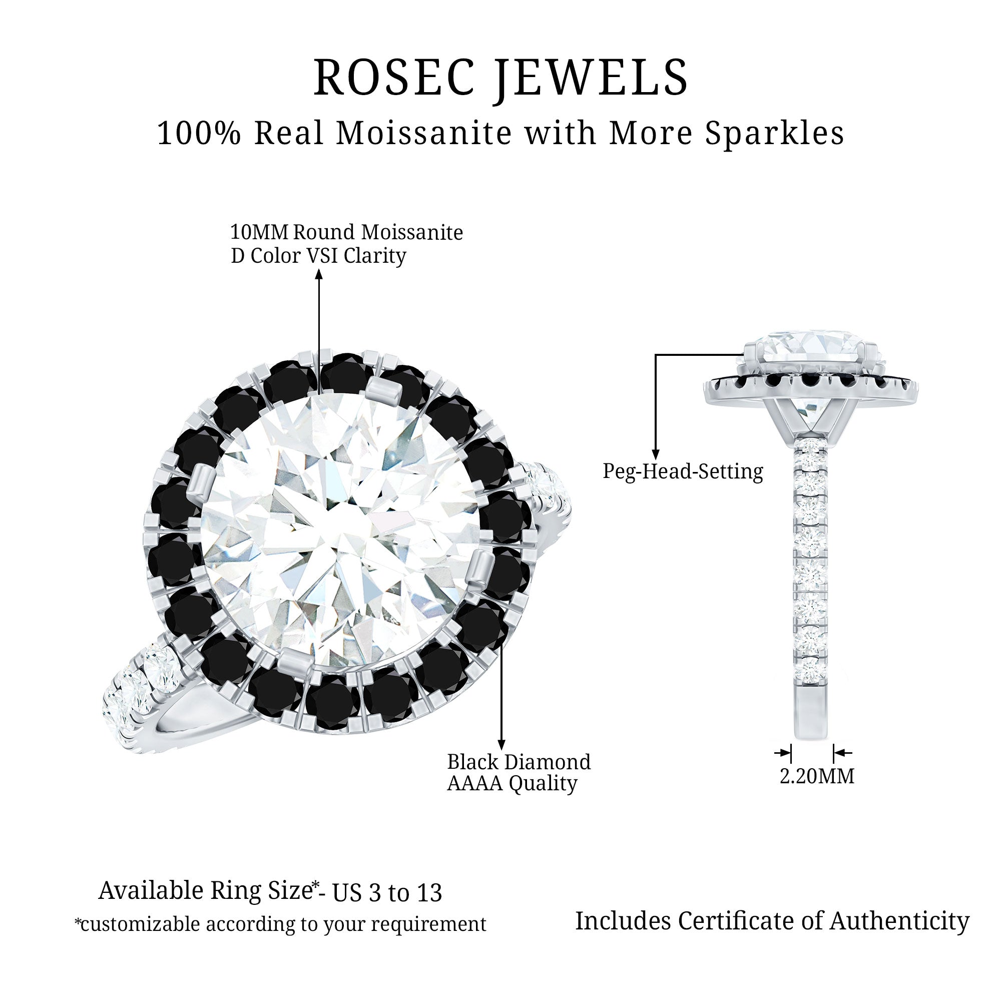 This striking Moissanite Engagement Ring is a bold and modern choice for every bride-to-be. The captivating 10 MM Round Shaped Moissanite in Peg head Setting with a mesmerizing Lab Created Black Diamond Halo creates an enigmatic allure capturing the essence of contemporary romance. While enhancing its brilliance are the Round Moissanite as Side Stones that creates a captivating contrast of amplifying the deep, rich tones. Crafted with precision this Halo Engagement Ring showcases an impeccable design with a commitment to ethical luxury. With its unique combination of darkness and light, this Moissanite Cocktail Ring is a powerful statement of love which is a symbol of your forever, allowing it to take center stage with elegance and flair. The AAAA Quality Lab Black Diamond and D-VS1 Quality Moissanite exemplify its brilliance, by adding a touch of sophistication.