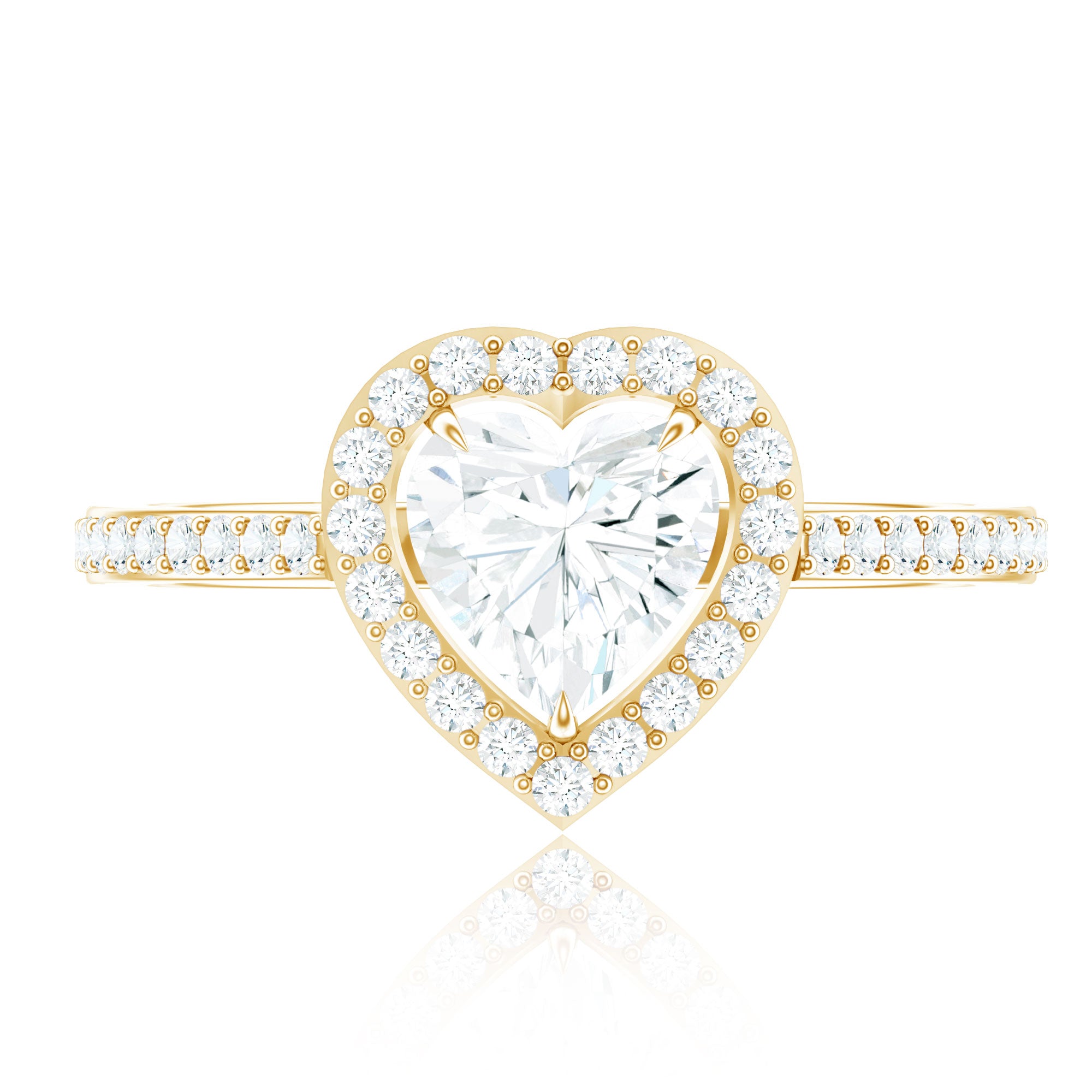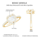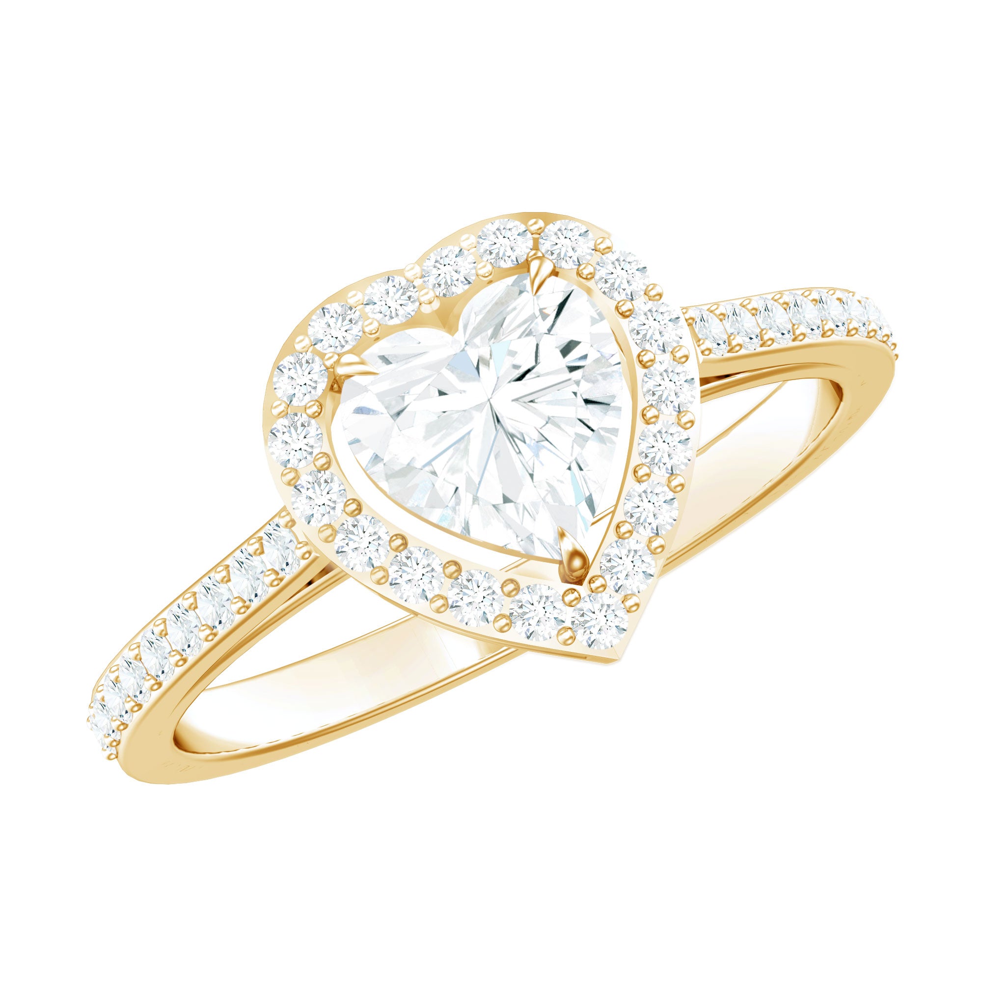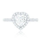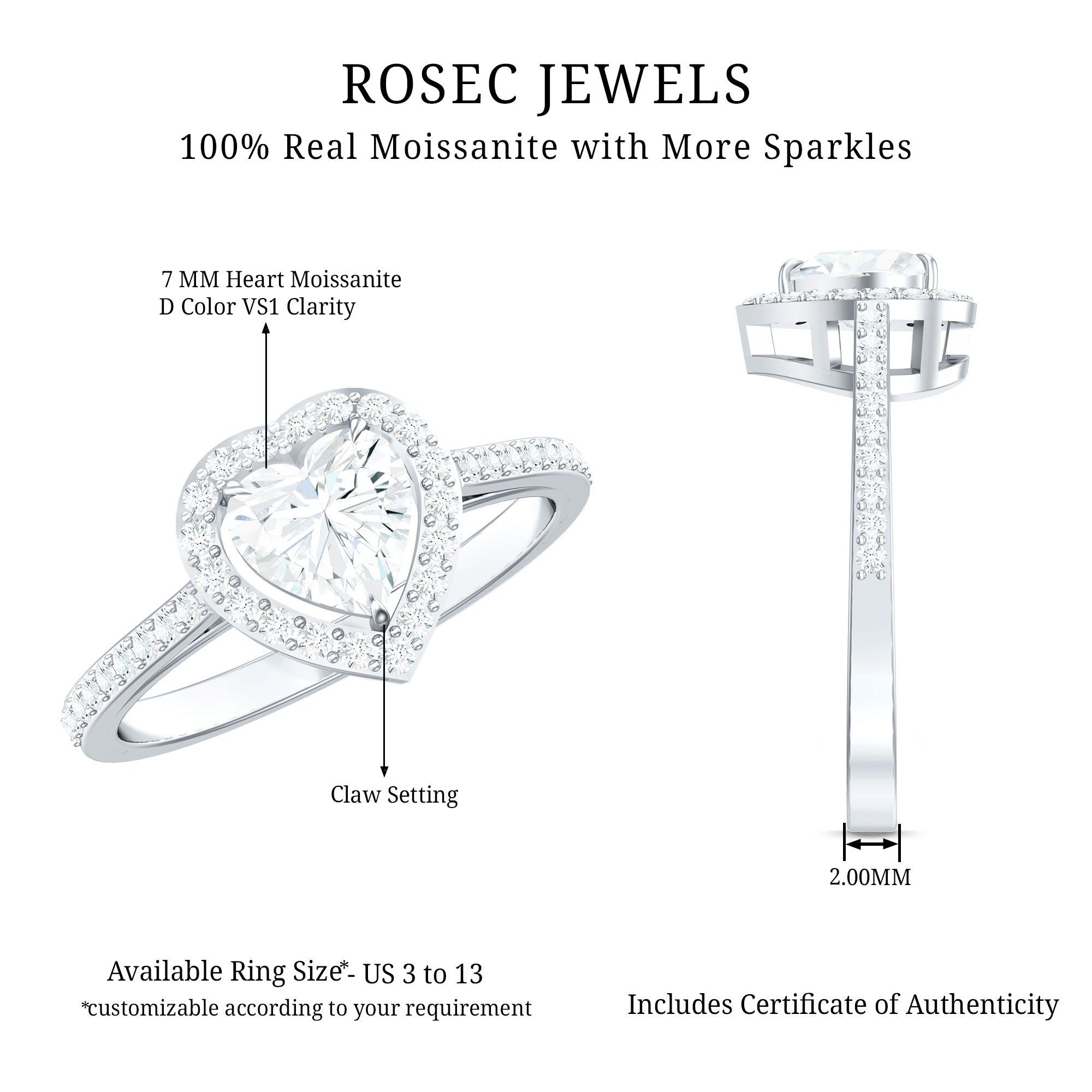 Take a look at this stunning Moissanite Engagement Ring that perfectly combines classic elegance with a modern flair. This Heart Engagement Ring symbolizes romance, designed to embody the essence of forever in one memorable piece. At the center of this captivating design is a 7 MM heart shaped moissanite set in claw setting and sparkling with brilliance, fire, and exceptional clarity. Its romantic shape is elegantly surrounded by a floating halo of delicate round moissanite stones, enhancing the shine of the center gem while providing a gentle, radiant sparkle from every angle. The band features a line of extra round moissanite gems, positioned to catch the light with every movement and add a graceful sparkle to her hand. This Heart Shaped Moissanite Ring is an ideal symbol of commitment for your one true love. Carefully crafted and thoughtfully designed, this Moissanite Halo Engagement Ring comes in various sizes to ensure a perfect, comfortable fit. Whether you are planning a magical proposal or marking a special occasion, this Moissanite Heart Ring is sure to make her heart skip a beat.