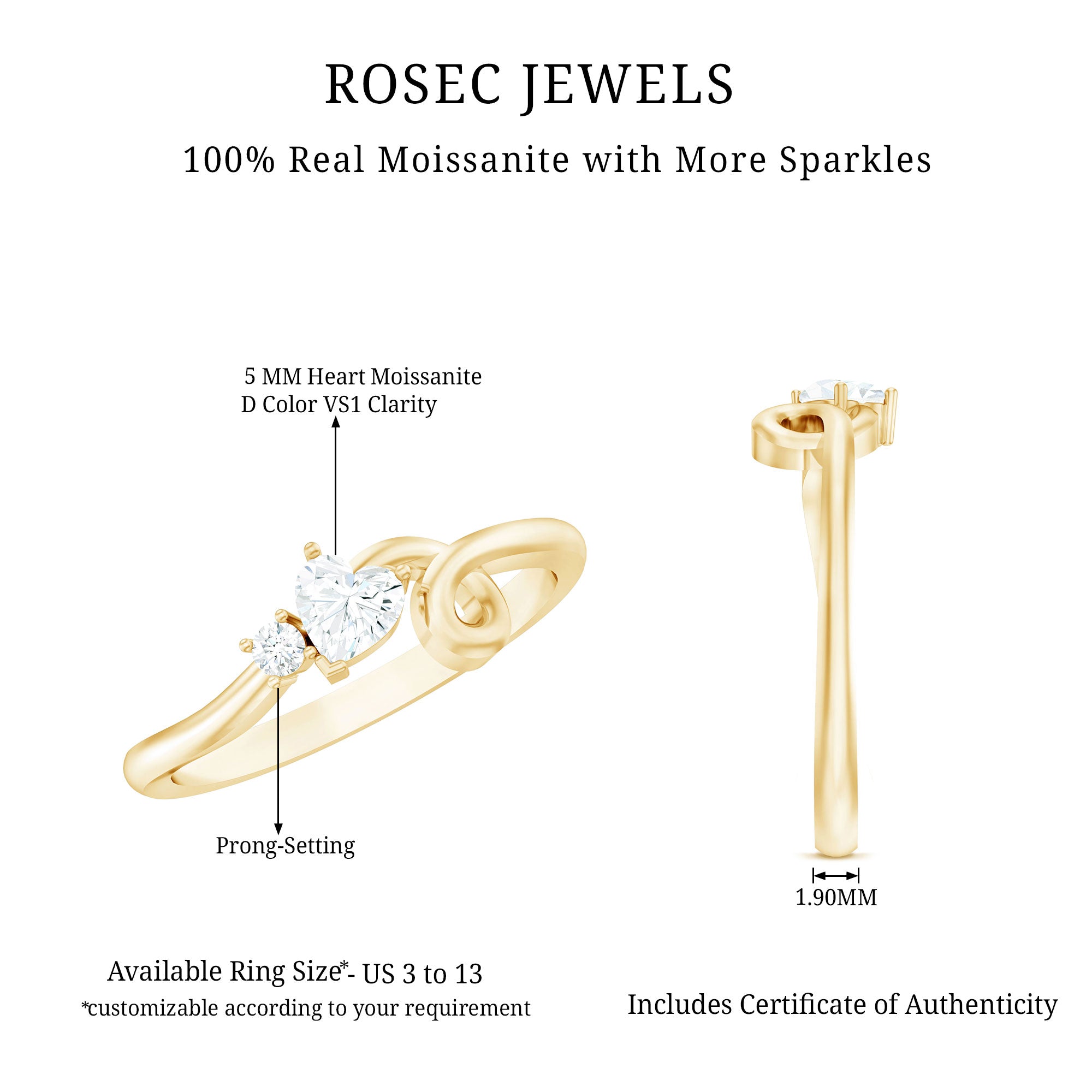 Some promises deserve more than just words, and this Heart Shaped Moissanite Ring is one of the most beautiful ways to show it. Designed to symbolize commitment, care, and connection, this Promise Ring for Her features a sparkling 5 MM heart shaped moissanite at the center. With its D-VS1 quality, the stone reflects light with intense brilliance, standing out in a way that feels both personal and meaningful. One smaller round moissanite sits closely beside the heart, adding just the right amount of extra shine without stealing the spotlight. What makes this design stand out is the elegant twist in the band, a subtle, graceful curve that adds movement and charm. It represents how two lives can come together and grow stronger through every twist and turn. It is not just stylish, it carries a quiet message of unity. Whether you are gifting it to your partner, giving it as a pre engagement ring, or simply celebrating a moment of emotional significance, this Heart Promise Ring is a beautiful symbol. It is also a lovely choice for Valentines Day, anniversaries, or special moments that matter. Crafted with careful attention to detail, this Moissanite Ring balances sentiment and simplicity. It can be worn every day or saved for special occasions. In every way, this heart ring is a small but powerful reminder that love is meant to last and grow.