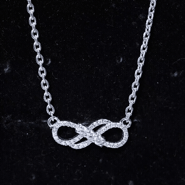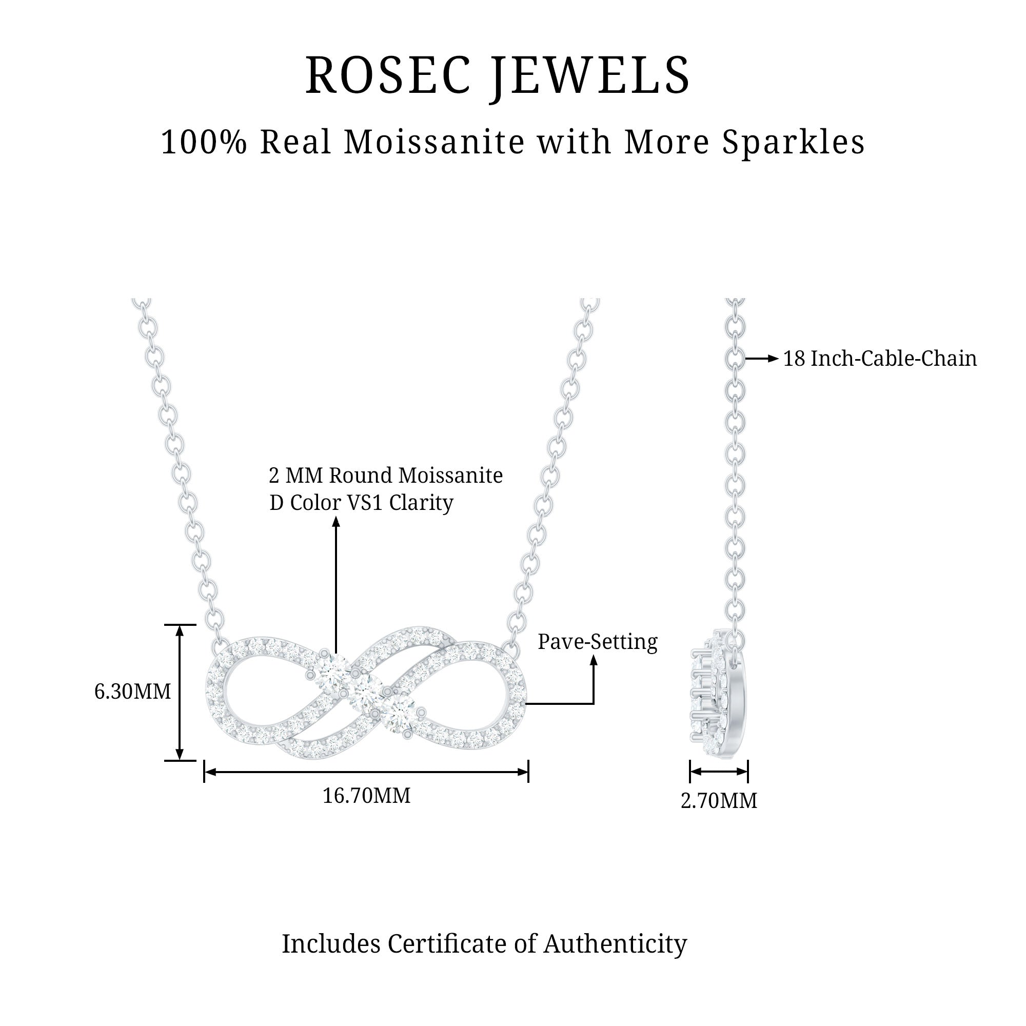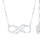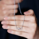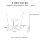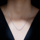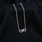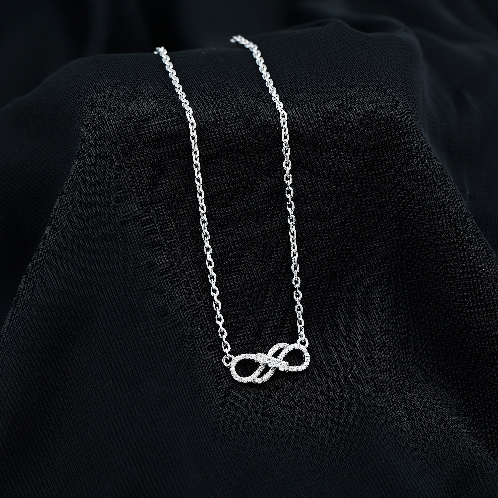 Make yourself the talk of the town with this Moissanite Love Knot Necklace. Handcrafted with care, this Unique Pendant features a sleek, intertwined infinity sign, skillfully designed in 14k white gold plated sterling silver. Sparkling round cut moissanite stones of D-VS1 quality are set in prong setting all over the Double Infinity Necklace. It hangs from a delicate cable chain, ensuring it rests gracefully around her neck. Our minimalist pendant necklace is a symbol of forever love, perfect for gifting on special occasions such as Valentines Day, Anniversaries, Birthdays, New Year, Christmas, and many more.