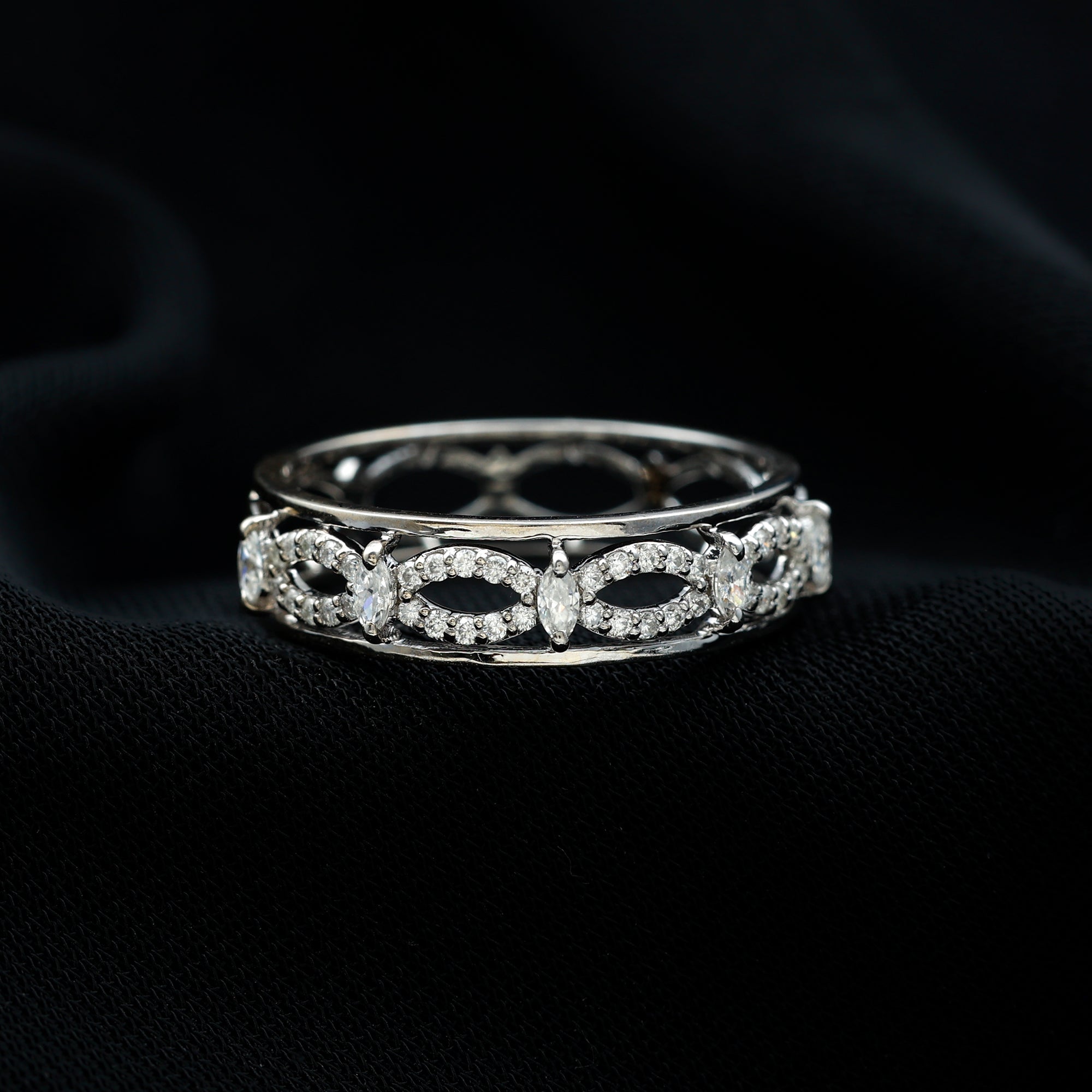 Celebrate love that knows no bounds with this Moissanite Infinity Wedding Band - a stunning symbol of forever. Designed with intricate detail, this Half Eternity Band features a graceful infinity pattern formed by shimmering round moissanite stones, representing eternal connection and unbreakable unity. Furthermore, the infinity loops are decorated with sparkling marquise cut moissanite stones, creating a rhythmic elegance that flows beautifully across the finger. Whether worn alone as a wedding band, stacked for a layered look, or paired with an engagement ring, this Moissanite Eternity Band delivers brilliance with every movement. Each stone is carefully prong set for security and maximum sparkle, ensuring it stands the test of time, just like your love. A meaningful gift for anniversaries, vow renewals, or a chic everyday statement, this Moissanite Wedding Band Ring is more than just jewelry, it is a lasting promise wrapped in radiance. To make your special moment even better, this Moissanite Band comes in a premium storage box, ensuring a luxurious presentation for your gift.