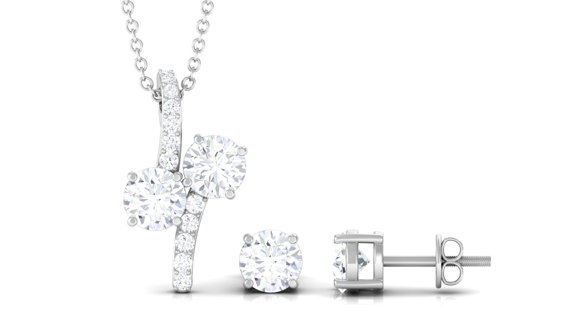 Unique and classy this Moissanite Pendant Necklace and Stud Earrings Set is a special treat for yourself or for your loved ones. The two Round Cut Moissanite in Prong Setting, decorated on the bail gives it a mesmerizing touch to your pendant necklace with a solitaire round Moissanite on earrings in Prong Setting with Screw Back closure keeping it secured for all day long.
