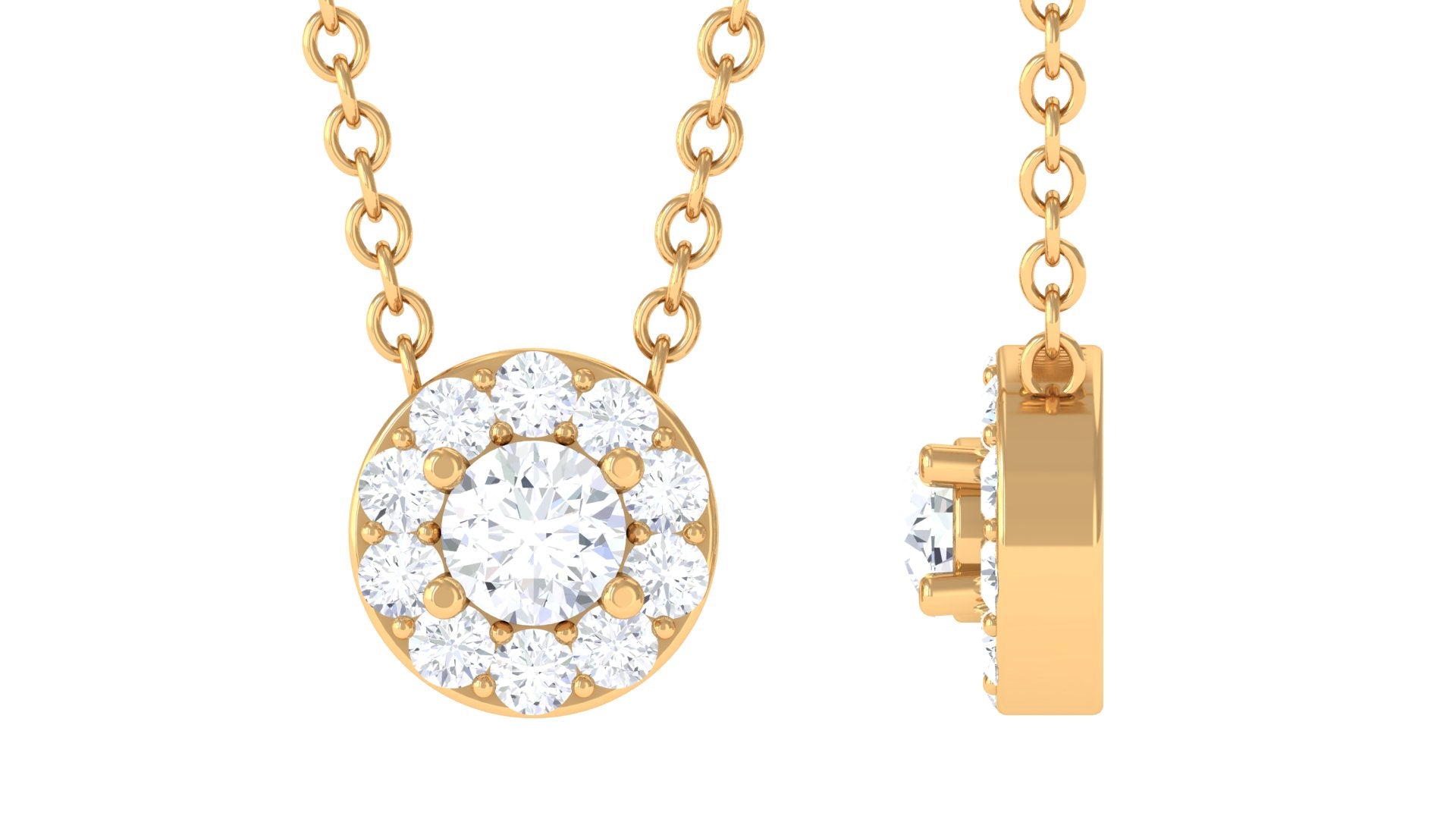 Adorn your neckline with this Moissanite Pendant which perfectly beautifies the overall look. The pendant features a 3 MM Round shape Moissanite securely placed in Prong Setting and encircled with the smaller stones which adds grace to the pendant. For an added layer of sophistication pair this pendant with other necklaces to get a classic look. This Halo Necklace beholds an adorable shine of D-VS1 Quality Moissanite. The pendant will be delivered in a signature jewelry box for the further storage.