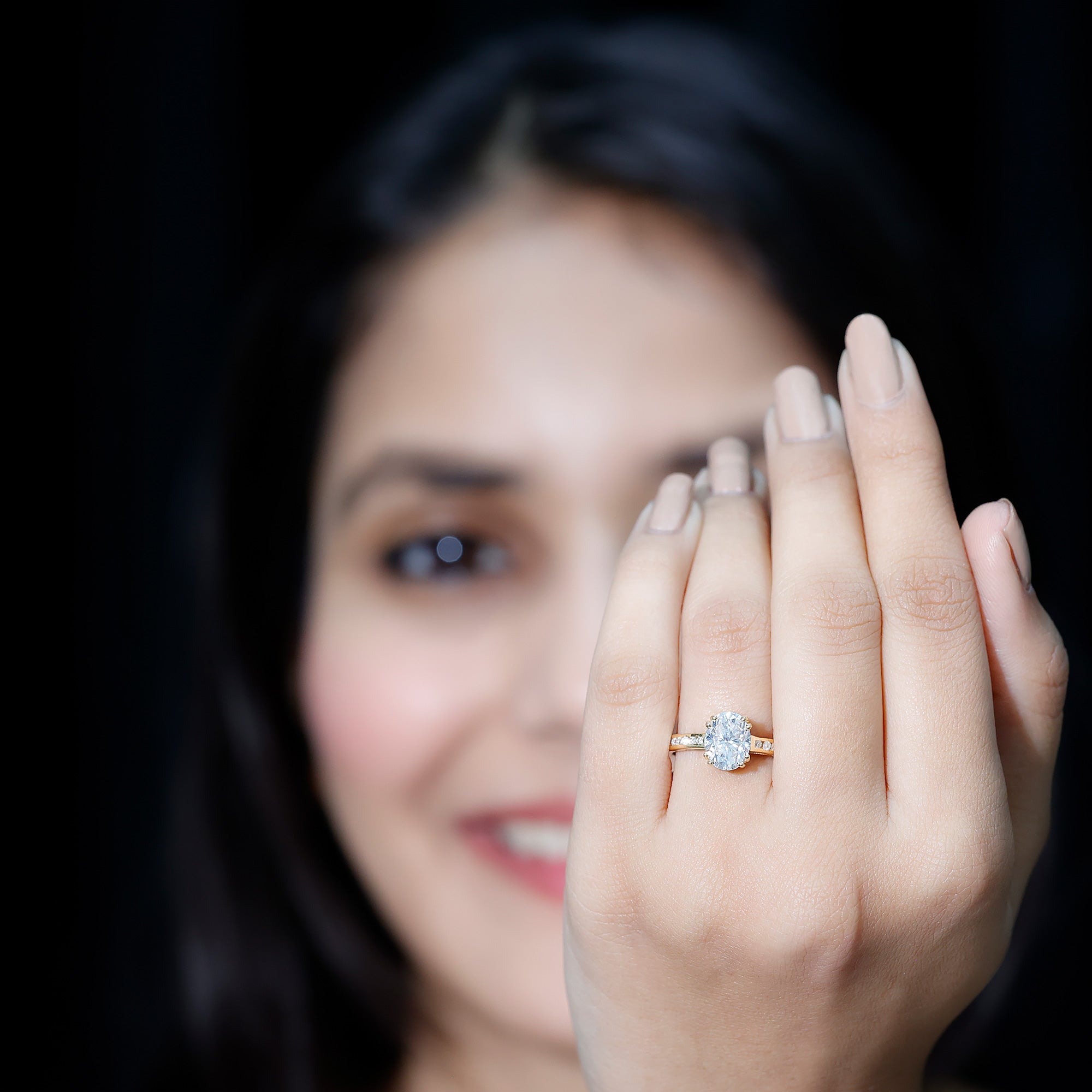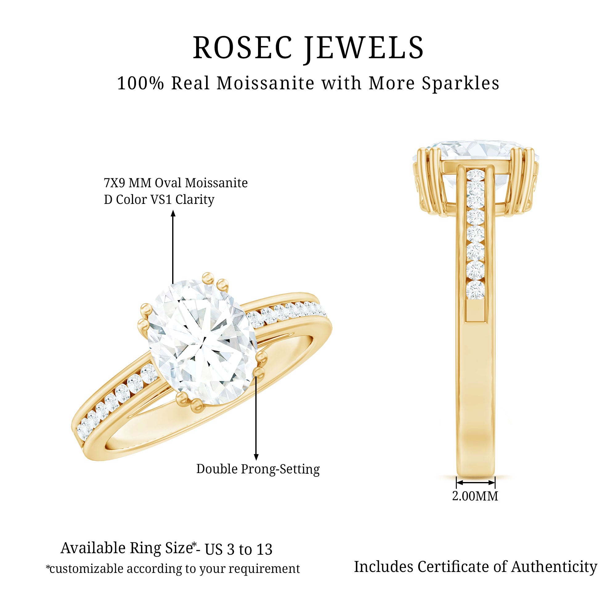 Wow your special someone with the breathtaking charm of our Moissanite Engagement Ring on her big day, which enchants with its elegance and perfectly showcases the center stone. This timeless Oval Shape Engagement Ring features a D-VS1 quality Moissanite, ensuring the fire and brilliance that represent love and commitment. It highlights a 7X9 MM oval Moissanite at its core. The dazzling channel set side stones on the Low Set Engagement Ring provide a striking and captivating look, reflecting your distinct style and character. This Oblong Engagement Ring flaunts a classic brilliant shape that draws all eyes. This ring merges traditional beauty with contemporary flair, delivering a sophisticated look that sparkles with incredible brilliance. We have handcrafted this Solitaire Moissanite Ring in a variety of precious metals, along with options for color and purity. Your 2 Carat Moissanite Ring will be shipped in a premium jewelry box, ensuring safe and secure delivery during transit and for storage afterwards. This timeless piece will surely become a treasured addition to her jewelry collection that she will cherish for a lifetime.