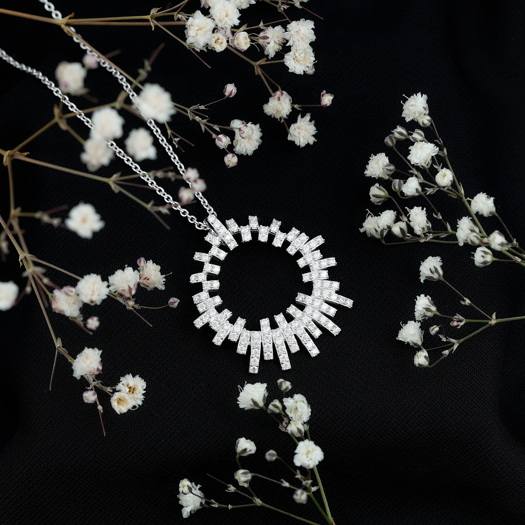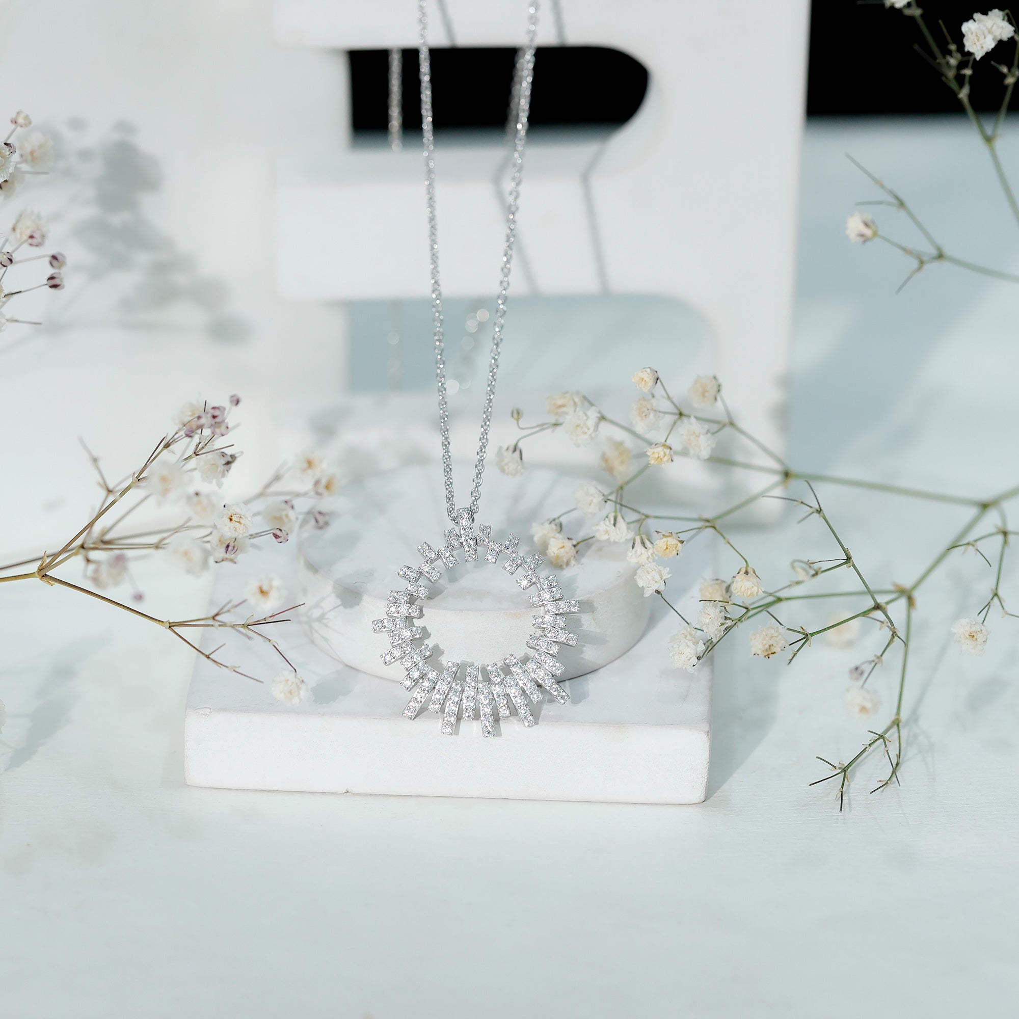 Adorn your neckline with this Moissanite Pendant Necklace crafted with 14K White Gold Plated Silver. The Circle Pendant Necklace features smaller Moissanite which are securely placed in Prong Setting. This Eternity Necklace beholds the classic shine of D-VS1 Quality Moissanite, which makes it a perfect jewel to beautify our neckline. The inner radiance of Moissanite will not only make you look complete but also give you the confidence to slay. This pendant is suspended from a sturdy cable chain, which makes it perfectly sit on the neckline. The pendant is a classic statement jewel, which is perfect to complete your look.