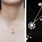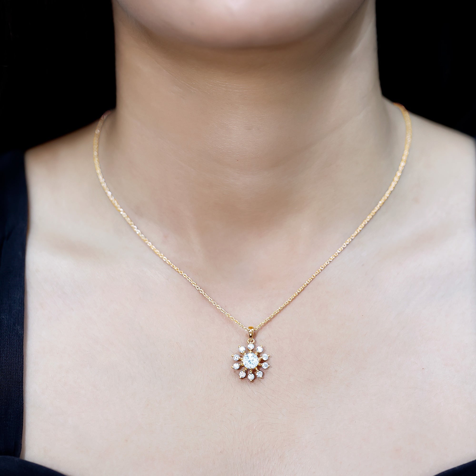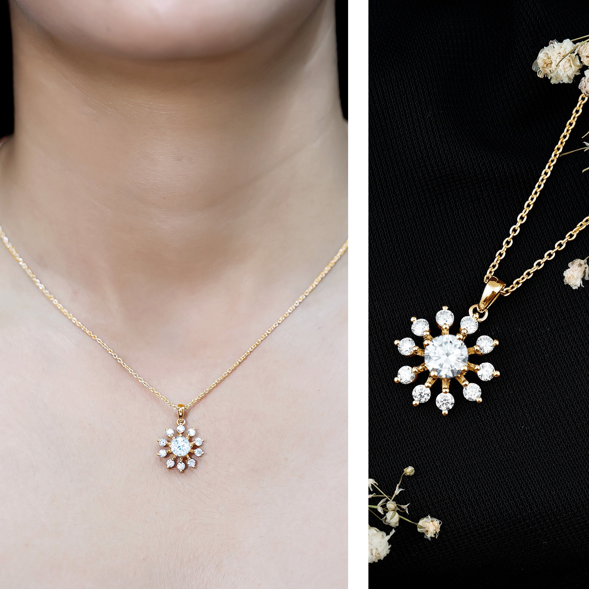 Inspired by the gentle charm of falling snow, this Moissanite Snowflake Necklace embodies the beauty of winter in a classic piece of jewelry. Made from yellow gold plated silver with precision and a keen eye for detail, this unique snowflake design features stunning round cut moissanite stones of D-VS1 quality, securely set in prongs. Each moissanite is meticulously placed to highlight the natural allure of a snowflake, reflecting brilliance from every angle. It makes for the perfect birthday gift for her, a lovely Valentine’s Day surprise for your girlfriend, or a considerate Christmas gift for mom - this Snowflake Pendant Necklace is guaranteed to bring smiles. This Moissanite Pendant is versatile enough to match any outfit, whether you are in a casual dress or a glamorous gown. Grab yours today and elevate your style! Plus, all the stones are certified, and you will receive a certificate of authenticity with this Winter Necklace. This Snowflake Jewelry is a timeless addition to your collection that will be treasured for years ahead.