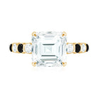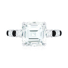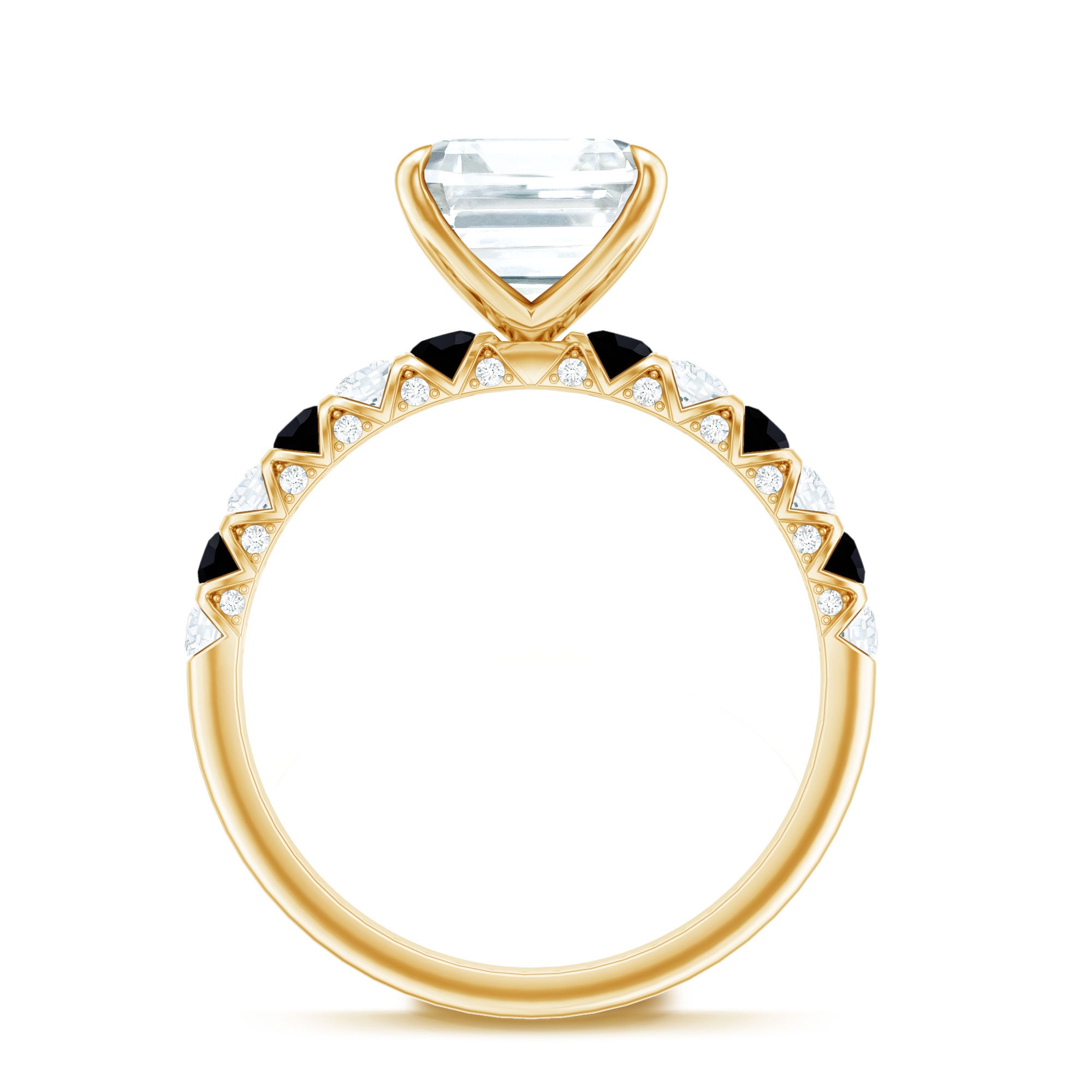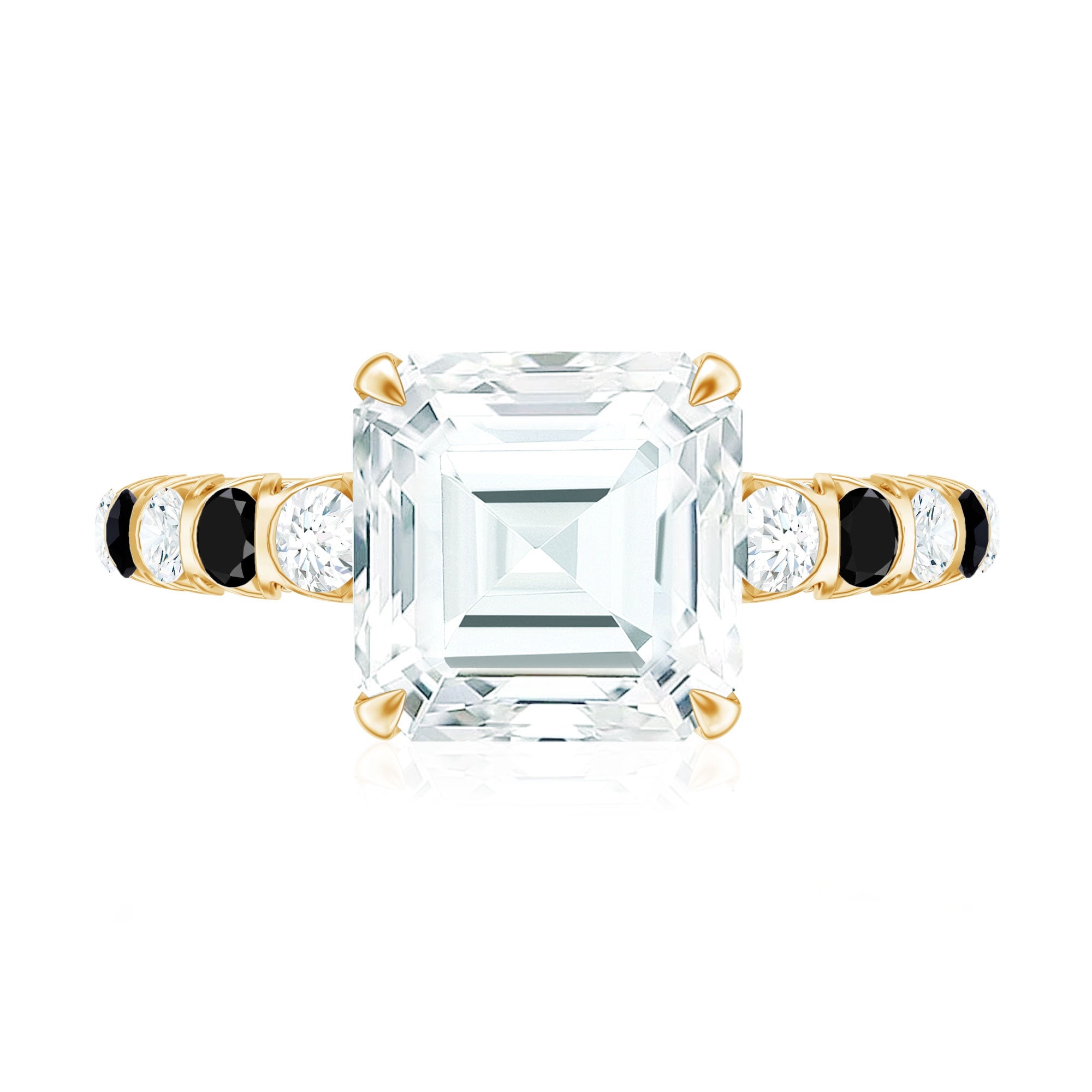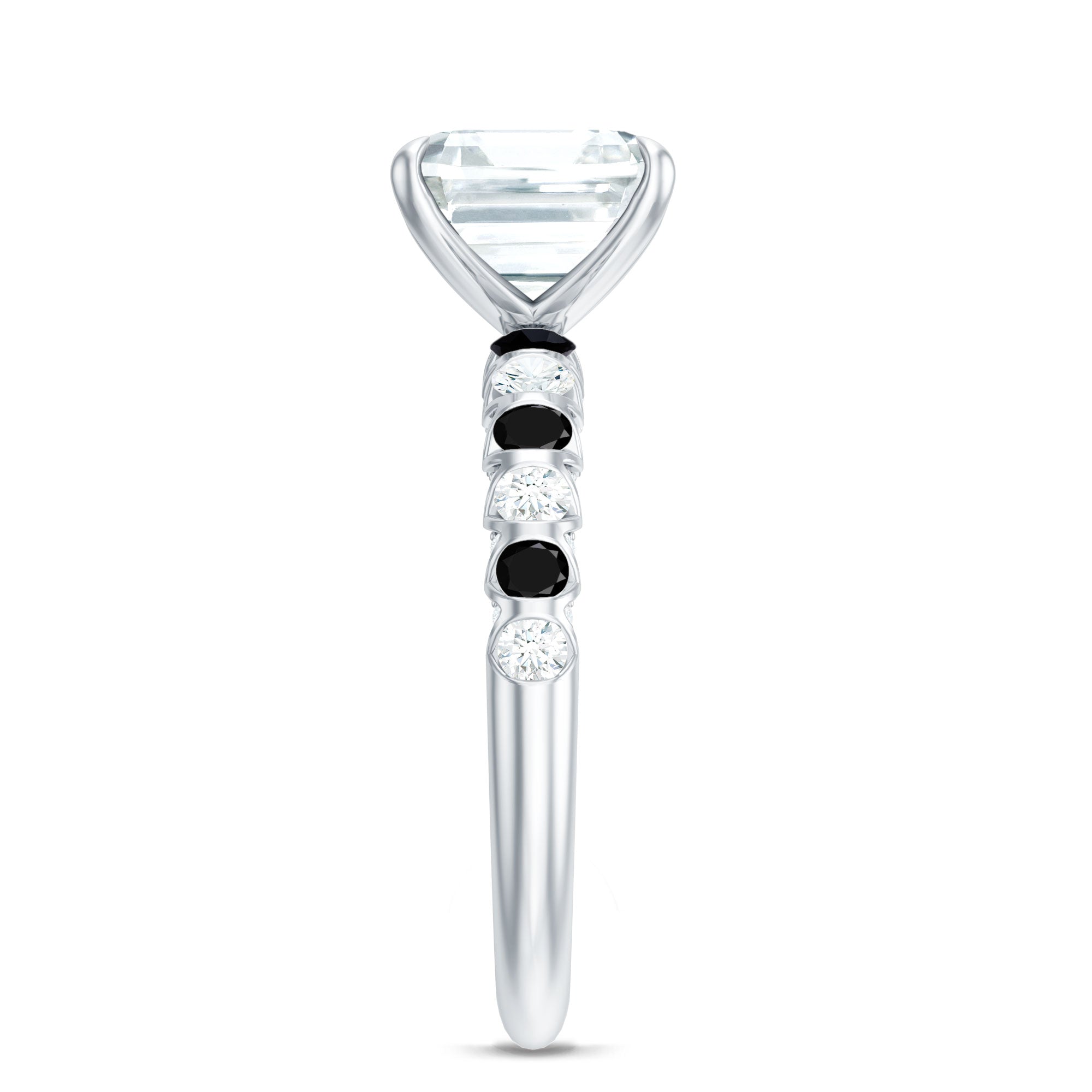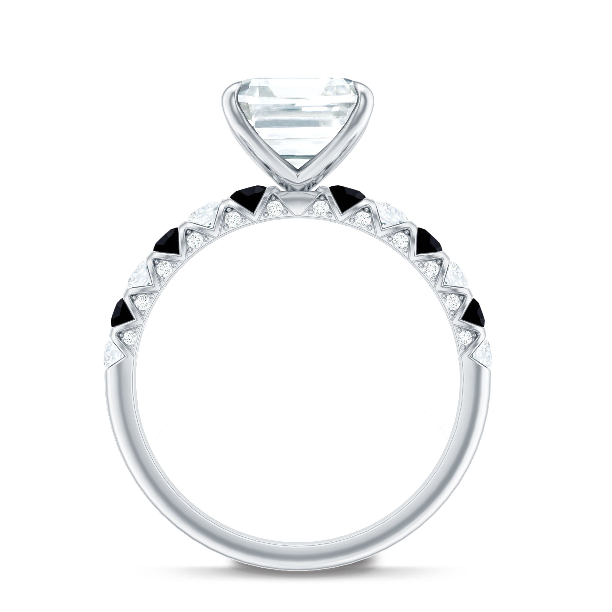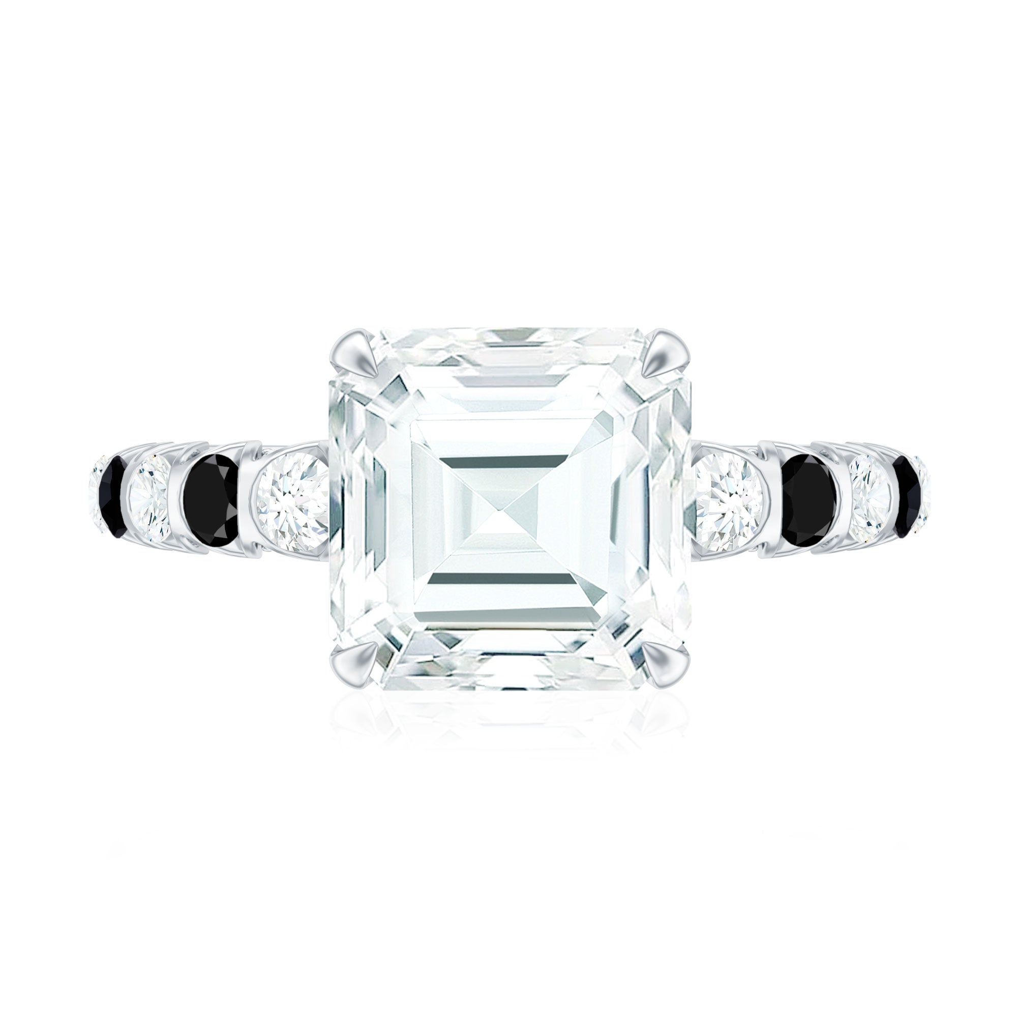 Get this Moissanite Engagement Ring that is as special as your lady love. Adorned with asscher cut moissanite claw set in the center, the shank is lined with created black diamond and moissanite making this ring a captivating piece of jewelry that deserves to be in her jewelry wardrobe. Crafted with proper care and precision, the D-VS1 Moissanite boosts the quality and adds an extra touch of elegance and charm. Celebrate this wedding anniversary or present the moissanite ring to your beloved and show her how much you love her.