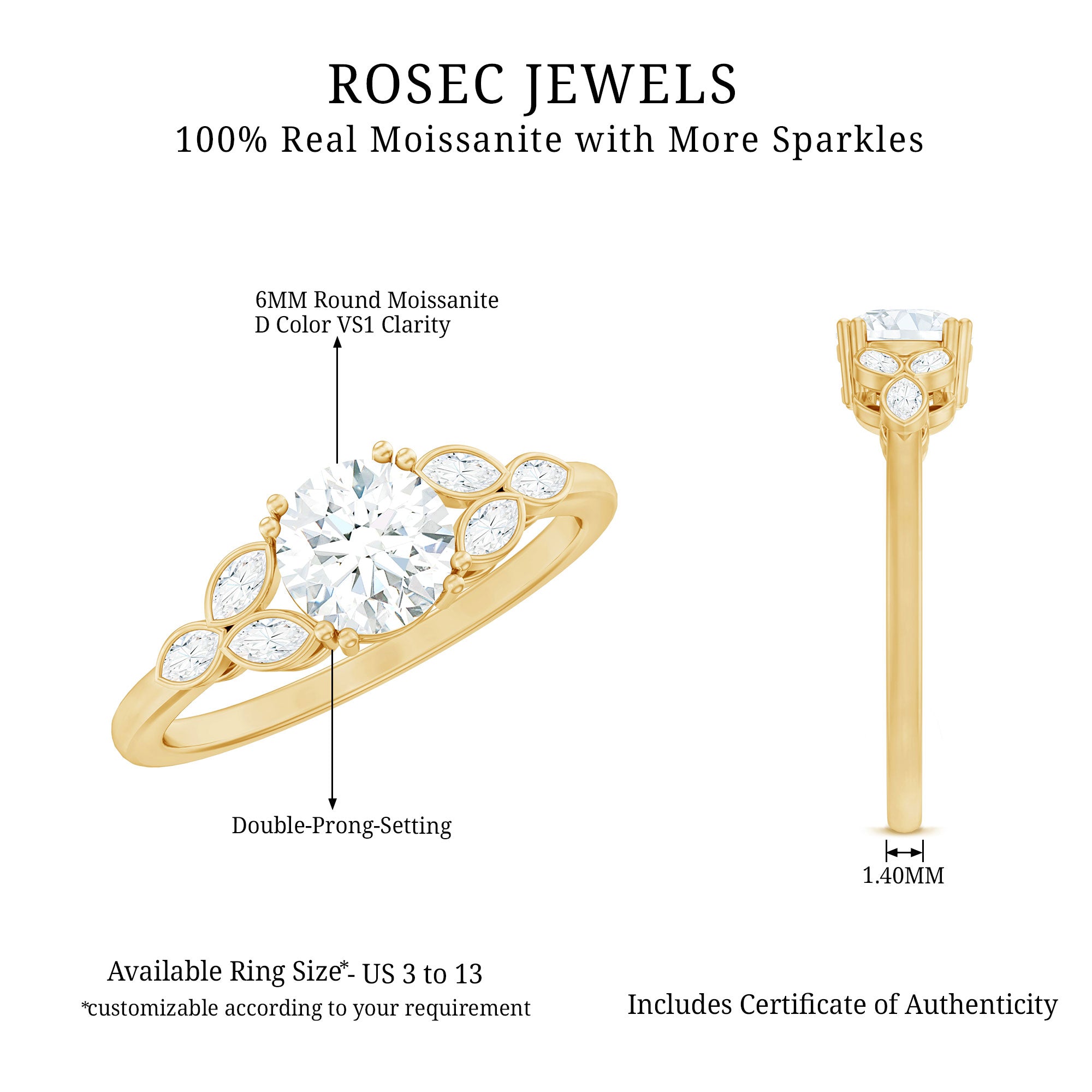 If you are on the hunt for a ring that is equal parts classic and whimsical, this Moissanite Solitaire Engagement Ring might just be the one. This elegant piece features a 6 MM round brilliant cut moissanite at its center, securely held in double prong setting. Flanking the central moissanite on either side is a trio of marquise cut moissanites, creating a graceful look. These marquise stones are bezel set, adding both a touch of timeless charm and structural elegance to the overall design. The trio arrangement gives the ring a balanced, symmetrical look while enhancing the visual presence of the center stone. This design of the Round Engagement Ring has just the right amount of flair while still keeping it timeless. Whether you are into romantic styles or just love something a little different from the usual solitaire, this Moissanite Engagement Ring ticks all the boxes. So whether you are ready to pop the question or just treating yourself to something meaningful and sparkly, this 1 Carat Moissanite Ring brings charm, fire, and a lot of heart. It is the kind of ring that will make you smile every time you glance at your hand.