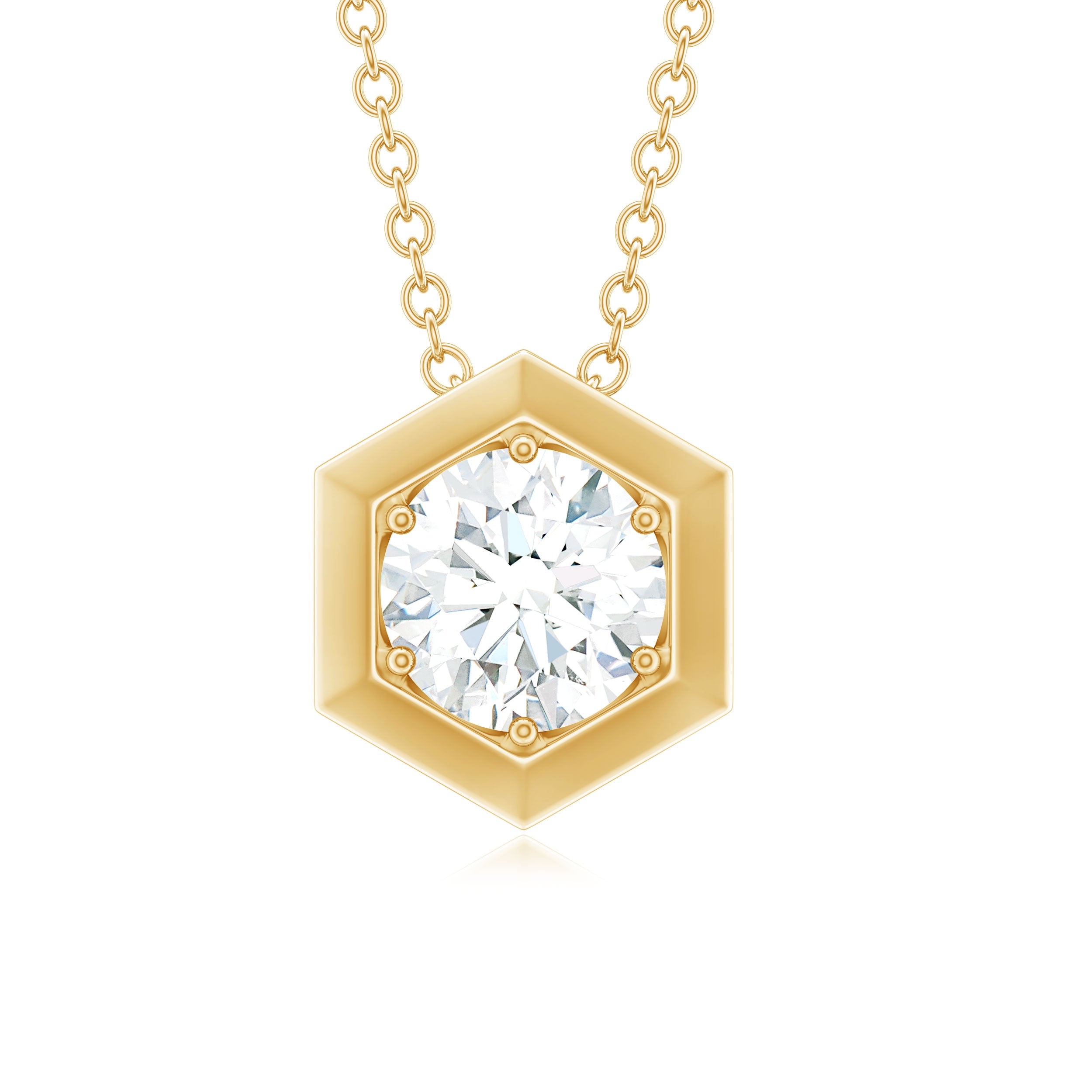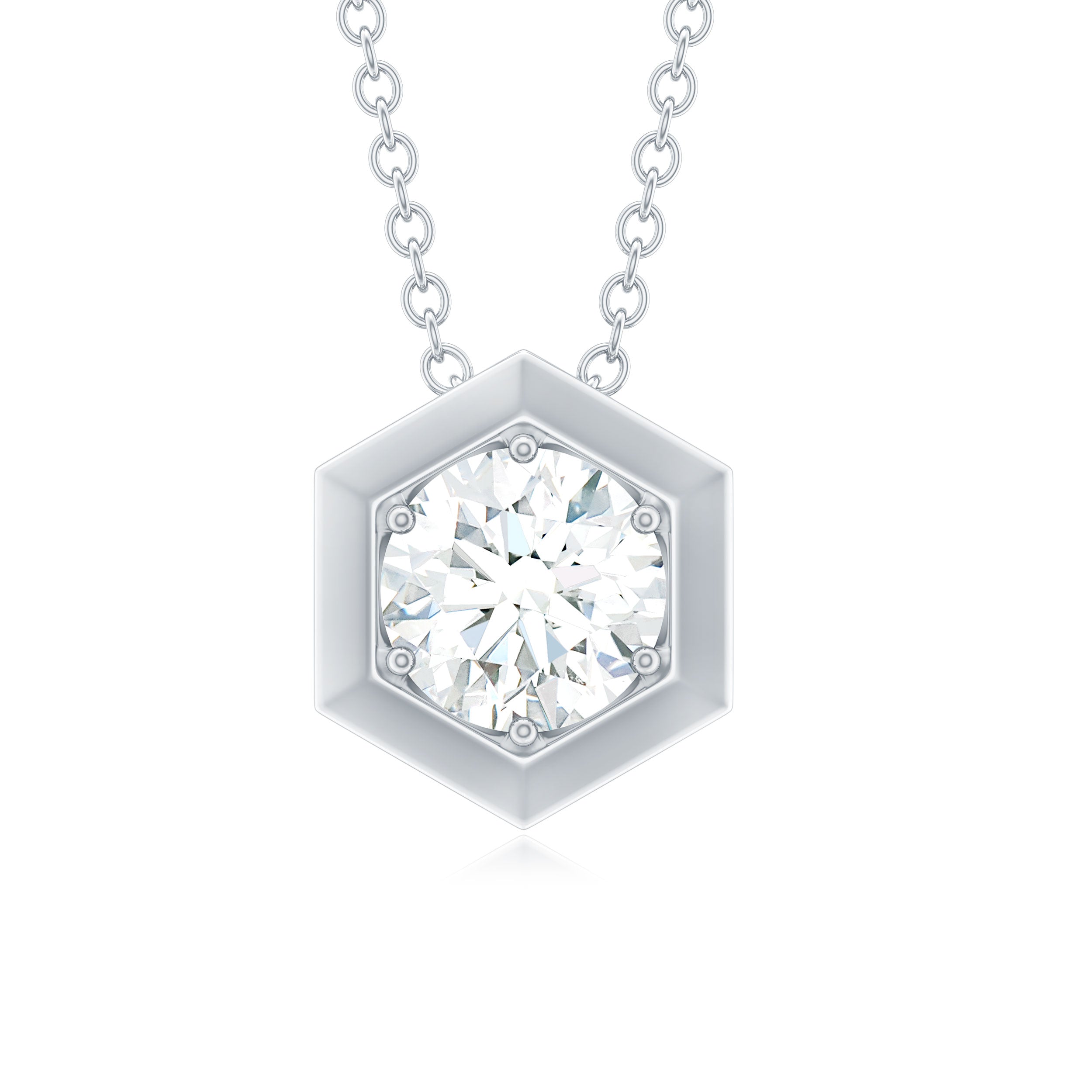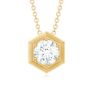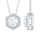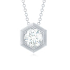 Be party-ready with this glamorous Moissanite Pendant Necklace. It features a 6 MM Round Shape Moissanite encased in a hexagonal metal frame and secured in a 6-prong setting, the single centerpiece steals all the limelight with its exceptional brilliance and sparkle in this glistening pendant. This Hexagonal Pendant exudes the classic shine of D-VS1 Quality Moissanite making it perfect to complete the party look. The pendant will be delivered to you in the premium quality jewelry box.