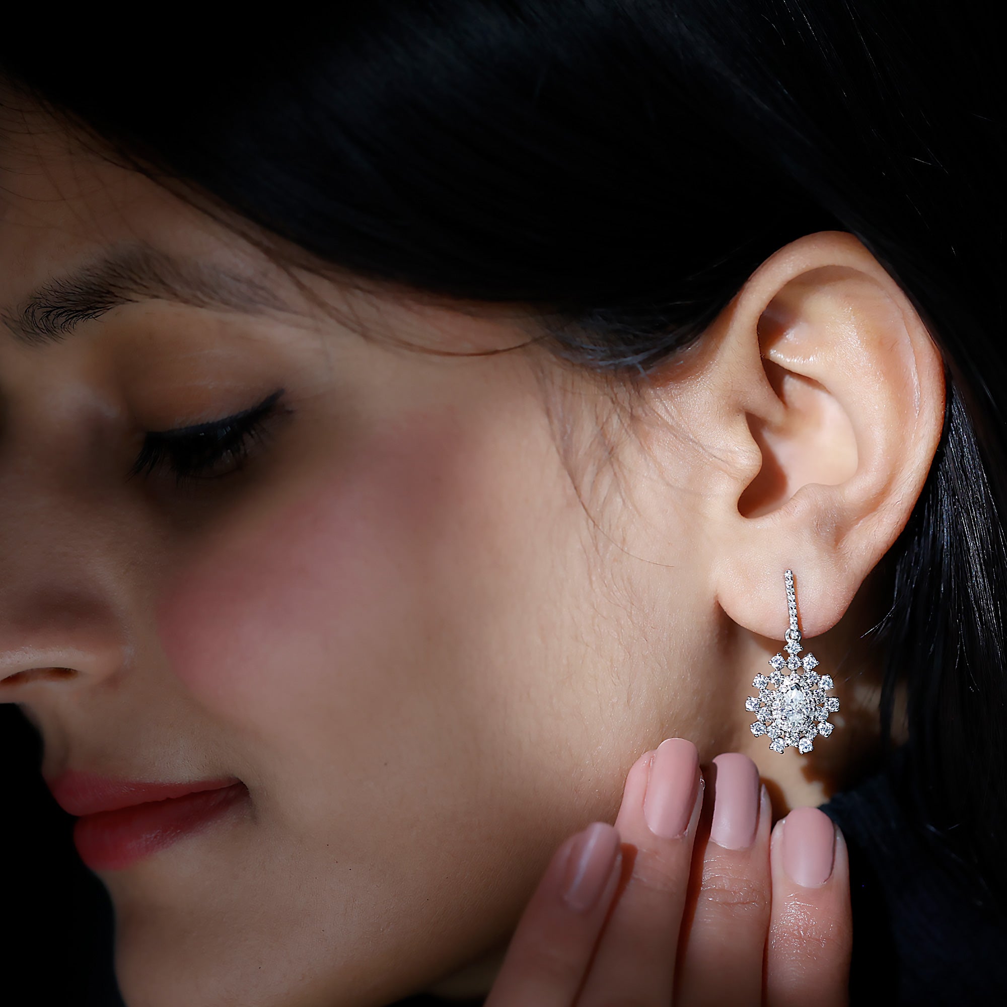 Complete your look for D-Day with these Moissanite Earrings, precisely handcrafted with 14K White Gold Plated Silver. These earrings feature a 4X6 MM Pear Shape secured in Prong Setting and decorated with petite stones that embrace the beauty of the earrings. The striking shine of D-VS1 Quality Moissanite makes it perfect to pair with the wedding jewelry set. These Drop Earrings dangle with a stone studded metallic bar, which makes it a perfect statement piece.