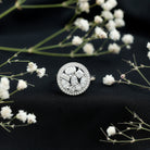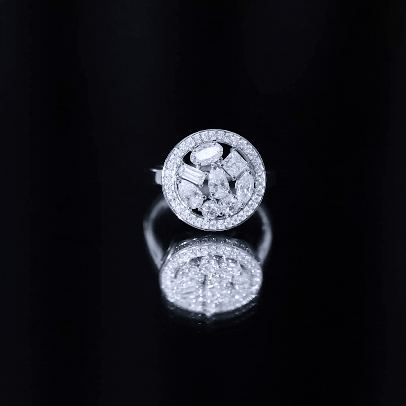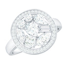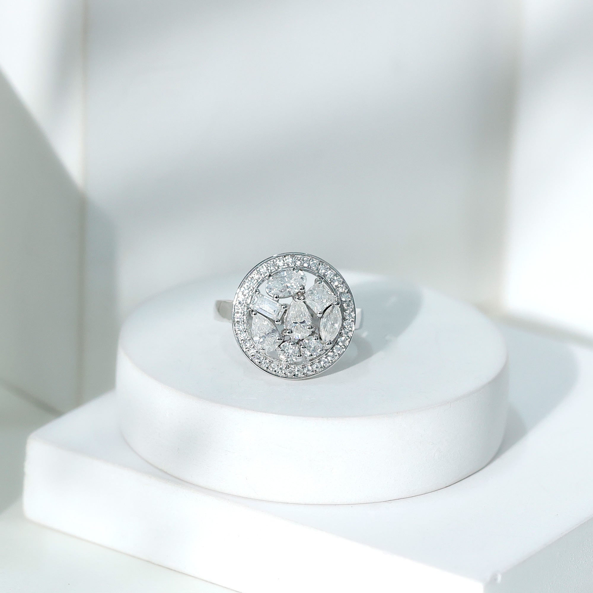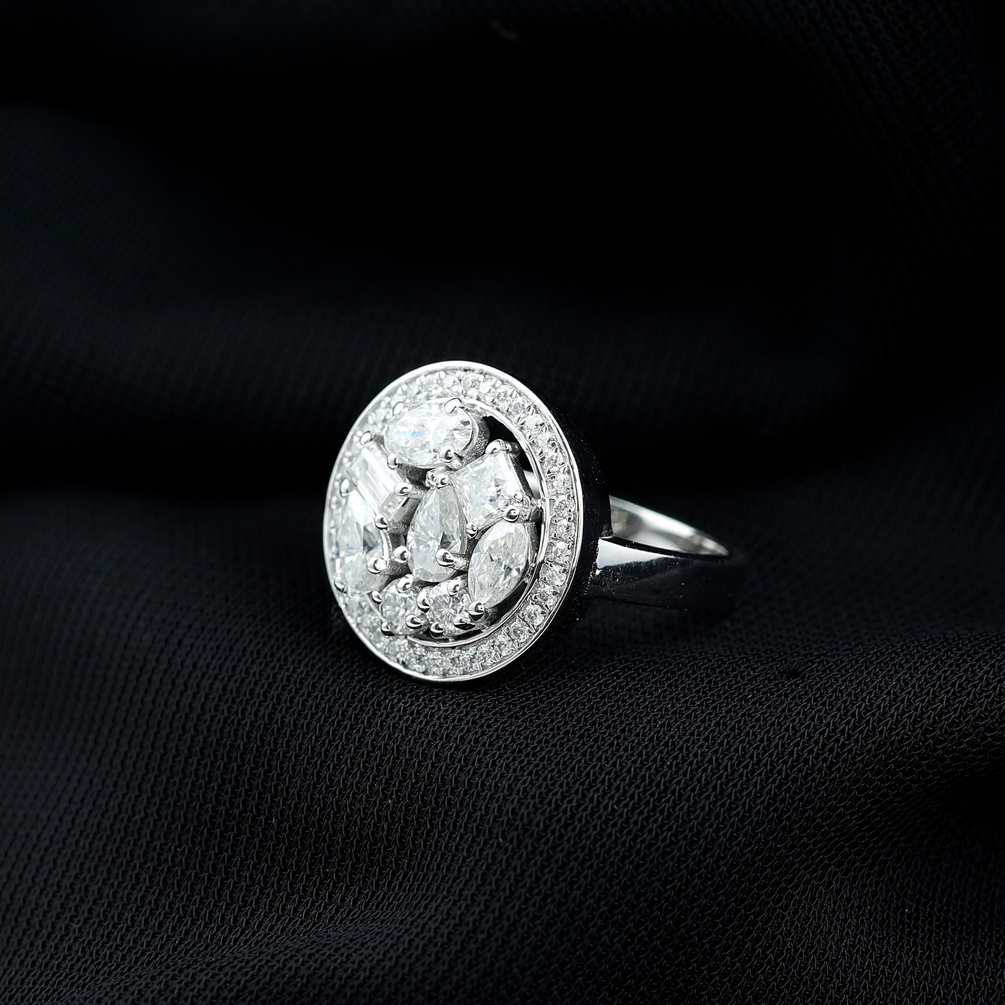 Our Cocktail Engagement Ring is a true masterpiece, designed to turn heads and steal hearts. Curated in 14K White Gold Plated Silver, the design showcases a unique cluster of shimmering moissanite stones in a variety of shapes. At the center, you will find an eye-catching arrangement of baguette, marquise, oval, round, and princess cut moissanite stones, forming a luxurious cluster that sparkles from every angle, each stone is set in secure claw setting. Surrounding the center cluster is a delicate round moissanite halo, enhancing the radiance and adding an extra layer of elegance. This Moissanite Statement Ring is ideal for cocktail parties, formal occasions, or even as a standout engagement ring.