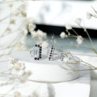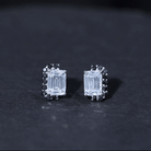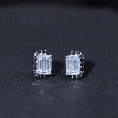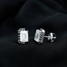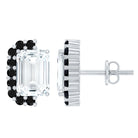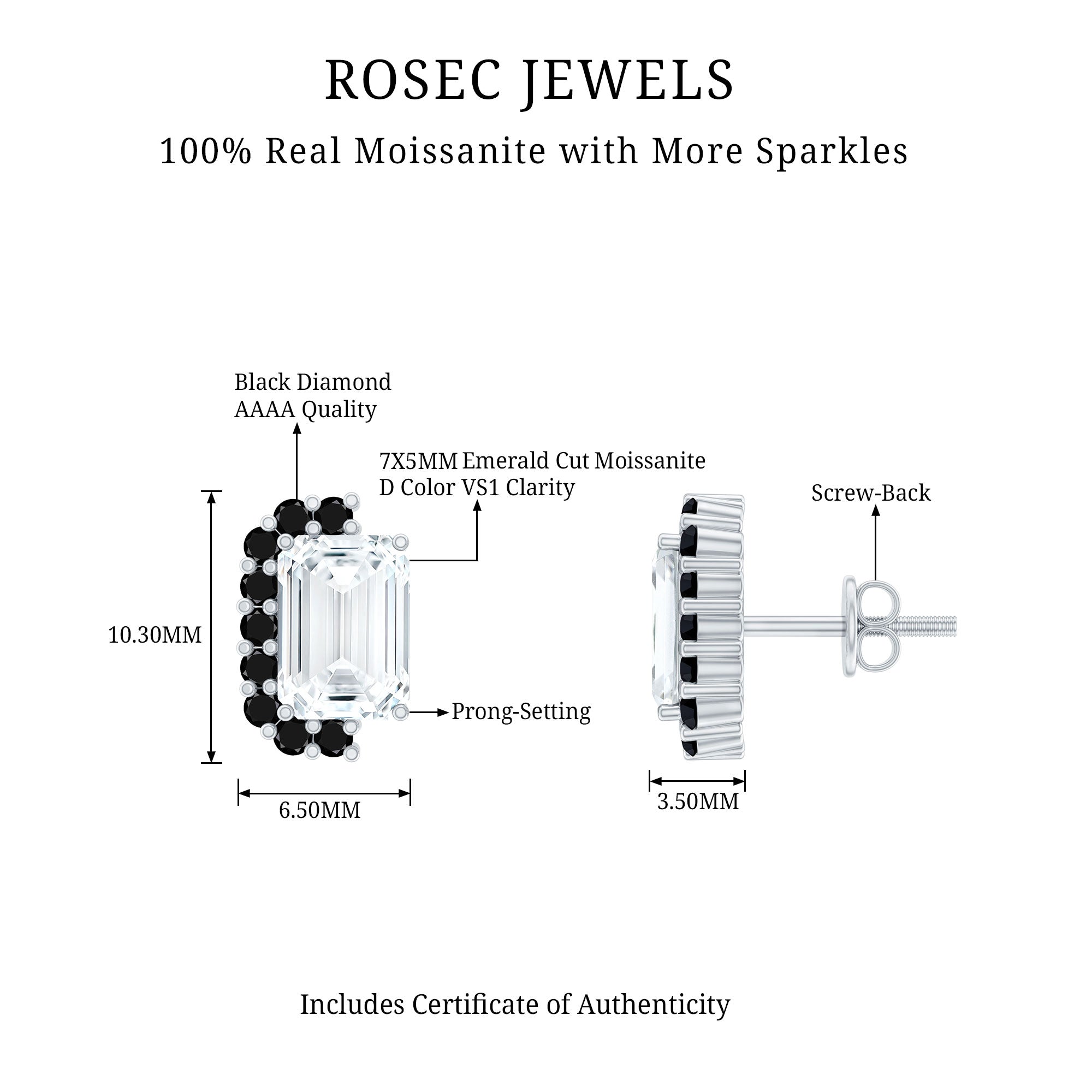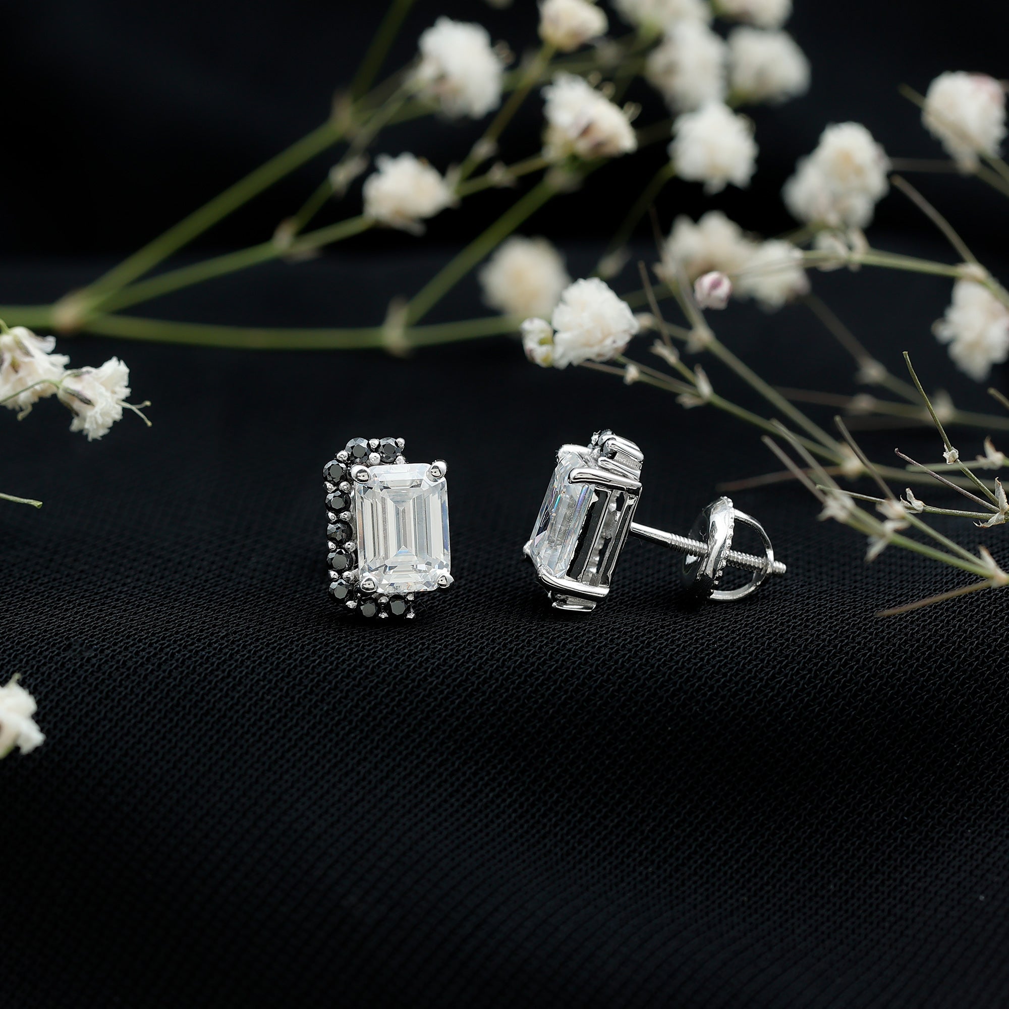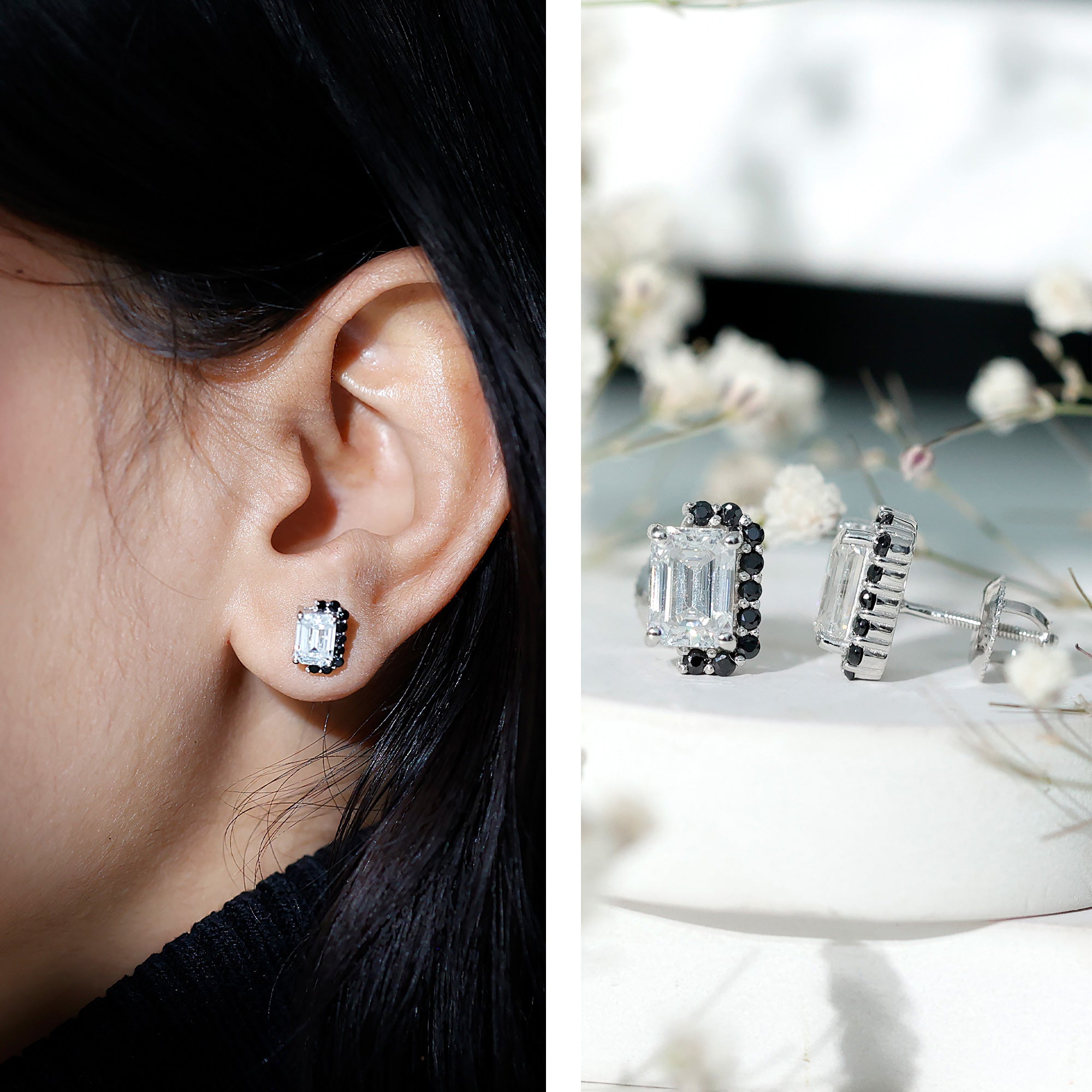 Adorn your ears with these Moissanite Stud Earrings, precisely crafted with 14K White Gold Plated Silver and adorned with the petite Lab Grown Black Diamonds. A 7X5 MM Emerald Cut Moissanite securely placed in Prong Setting and partially decorated with smaller Round Shape Lab Created Black Diamonds. These Earrings with Screw on Backs beholds the classic shine of D-VS1 Quality Moissanite and AAAA Quality Lab Grown Black Diamond makes it perfect to complete your look. These Designer Stud Earrings will be delivered to you in a velvet pouch with a certificate of authenticity.