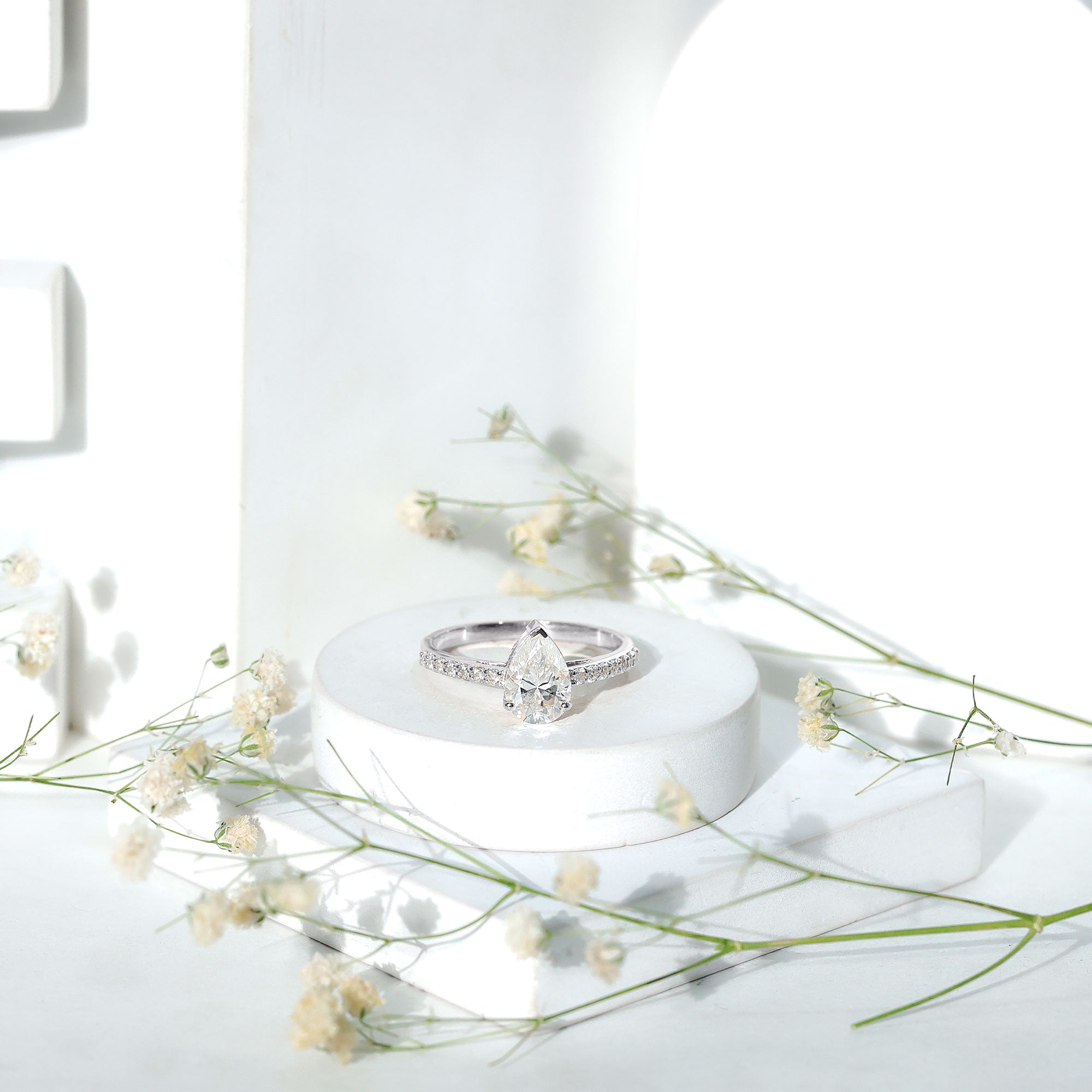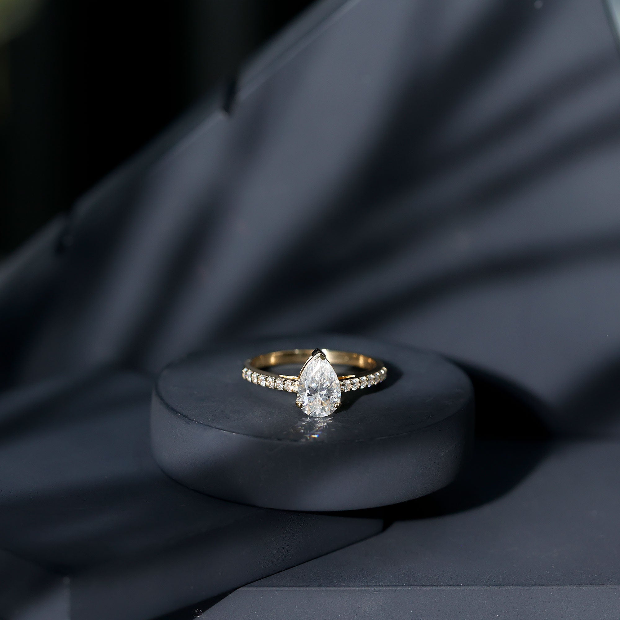 This Moissanite Engagement Ring is a classic piece that will definitely capture her heart for a lifetime. Mark your romantic journey with this Solitaire Engagement Ring, which is a perfect choice for the sophisticated bride. Express the depth of your love with this Teardrop Engagement Ring, leaving a lasting impression that elegantly blends grace and charm. The ring showcases a 7X10 MM Pear Shaped Moissanite set in 3 prong setting as a Solitaire. The band is adorned with round cut Moissanite Side Stones, creating a dazzling look that serves as a beautiful reminder of your forever with every glance. As a gorgeous 2 Carat Moissanite Ring for Women, it ensures you will shine in any crowd. We provide a range of ring sizes for the perfect fit and can send a free ring sizer kit upon request before we dispatch the final product. Whether it is for an Engagement, Mothers Day, Anniversary, Valentines Day, Christmas, or Birthday, this Pear Shaped Engagement Ring is the ideal way to commemorate the wonderful memories of joy and laughter shared throughout your journey.