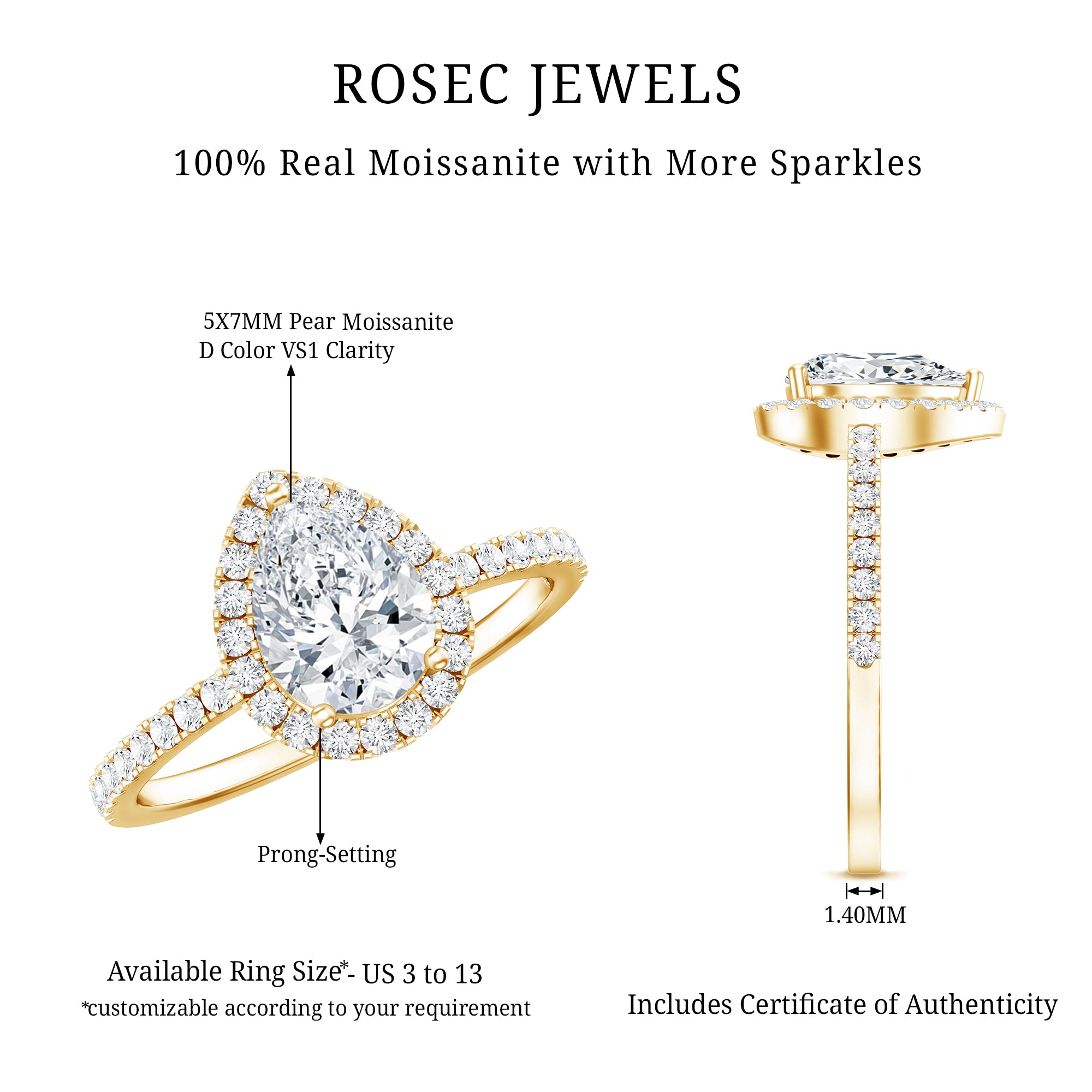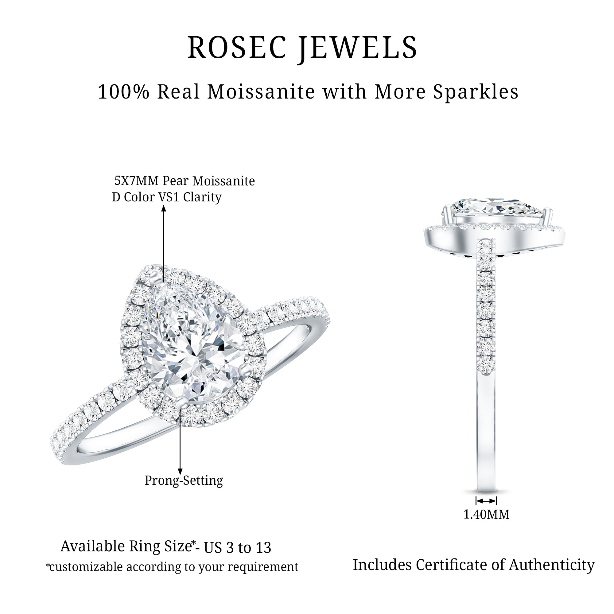 This Moissanite Teardrop Ring is a beautiful and elegant piece of jewelry that would make a perfect gift for your love. The Halo Engagement Ring features a stunning 5X7MM Pear Cut Moissanite gemstone set in 3 Prong Setting with a delicate halo of smaller round cut stones. The band is embellished with additional shimmering round shaped moissanites, creating a bold and radiant look that draws attention from every angle. This Pear Shaped Moissanite Ring blends classic charm with a touch of modern sophistication. Carefully crafted with precision and love, it comes in various sizes to ensure the perfect fit. Every detail of this piece reflects love, artistry, and commitment. Let it tell your love story with brilliance and elegance, because she deserves nothing less than extraordinary. This Moissanite Engagement Ring is a meaningful and cherished addition to any jewelry collection.