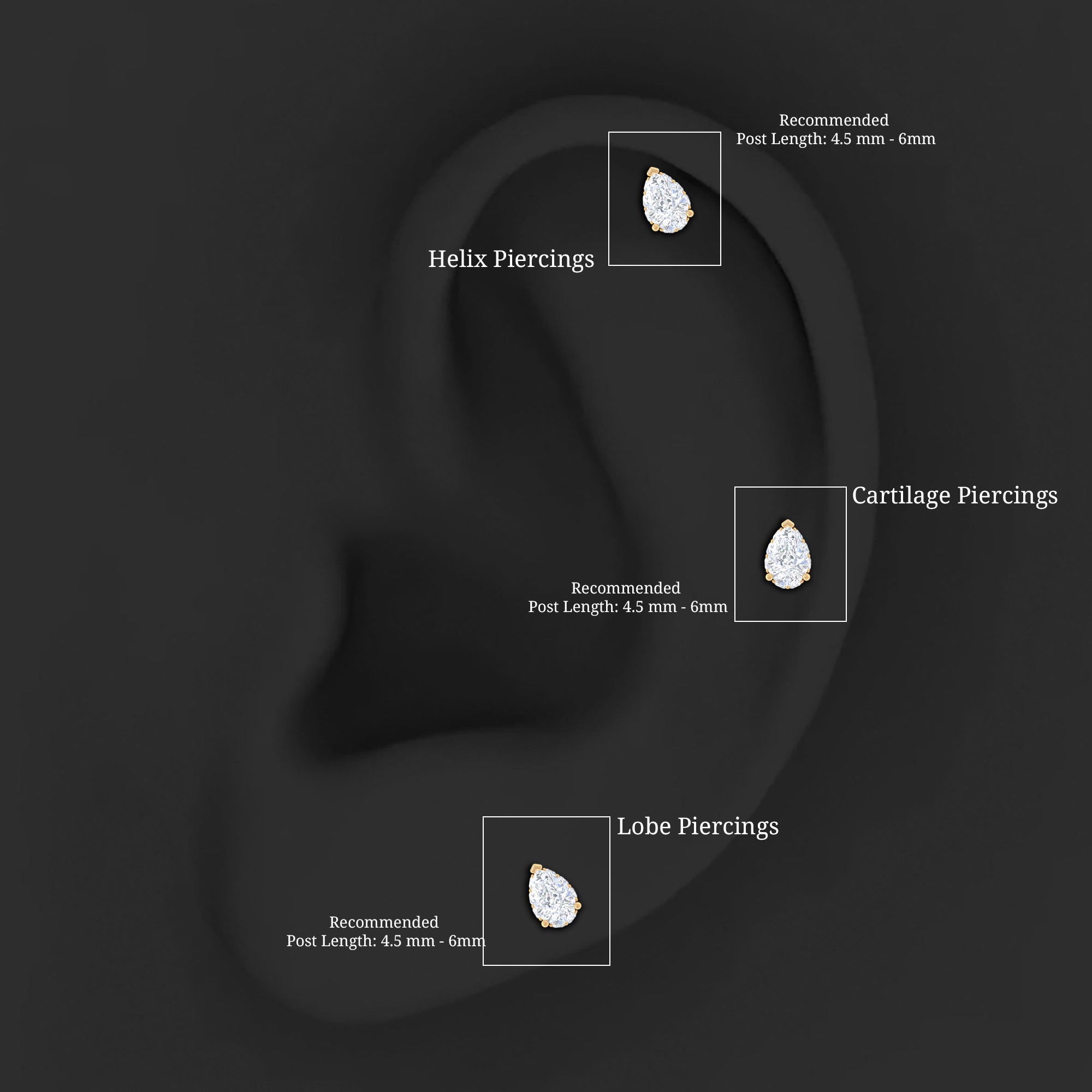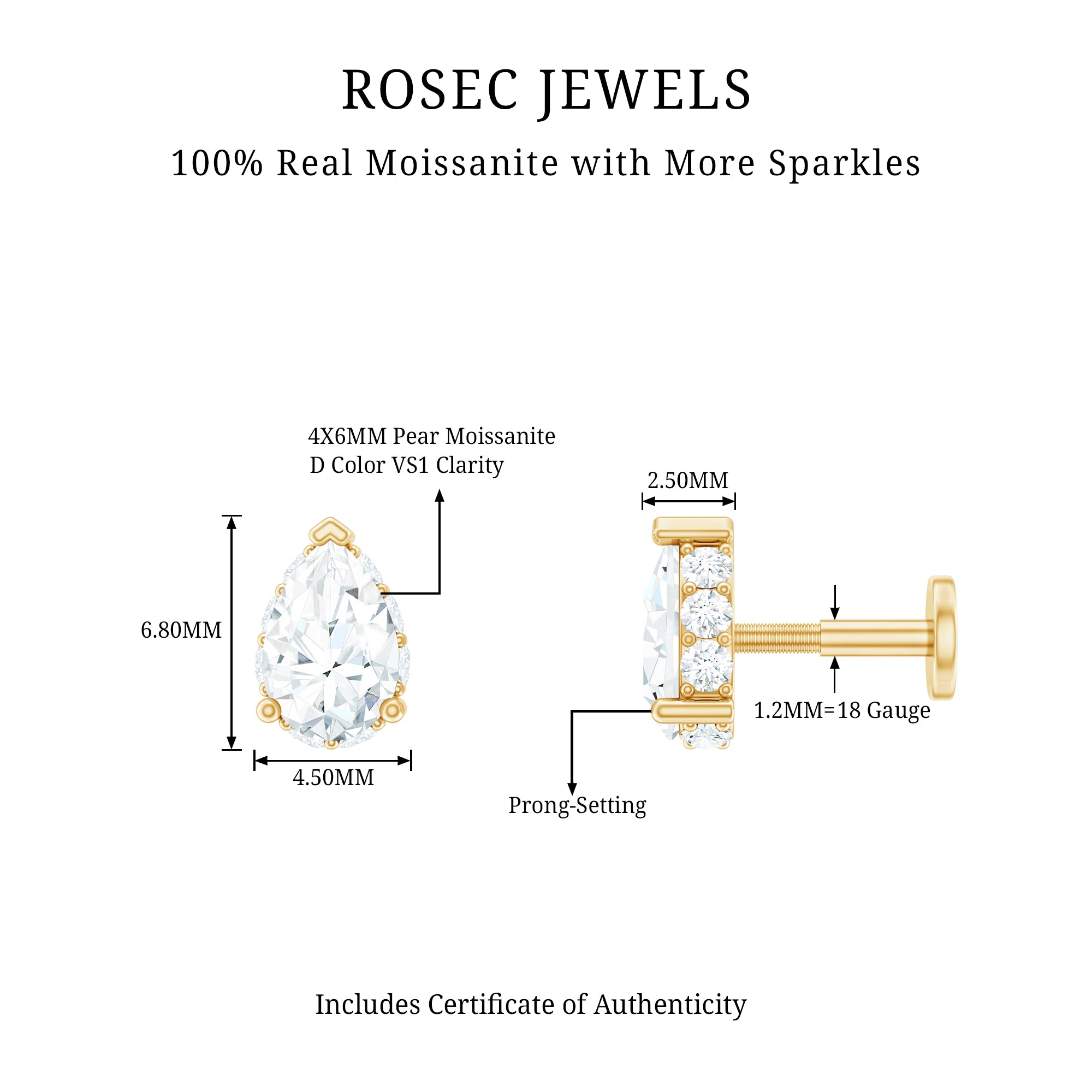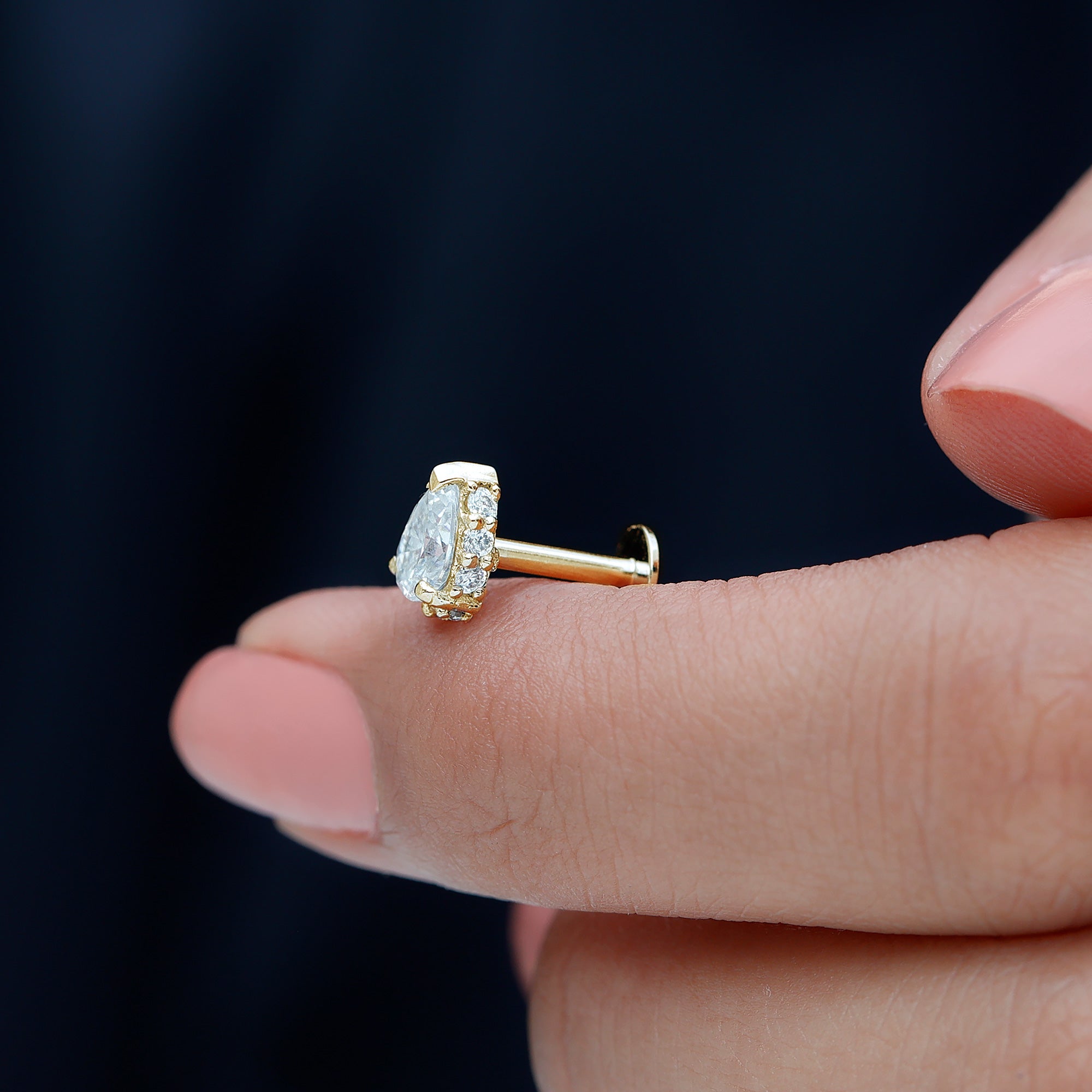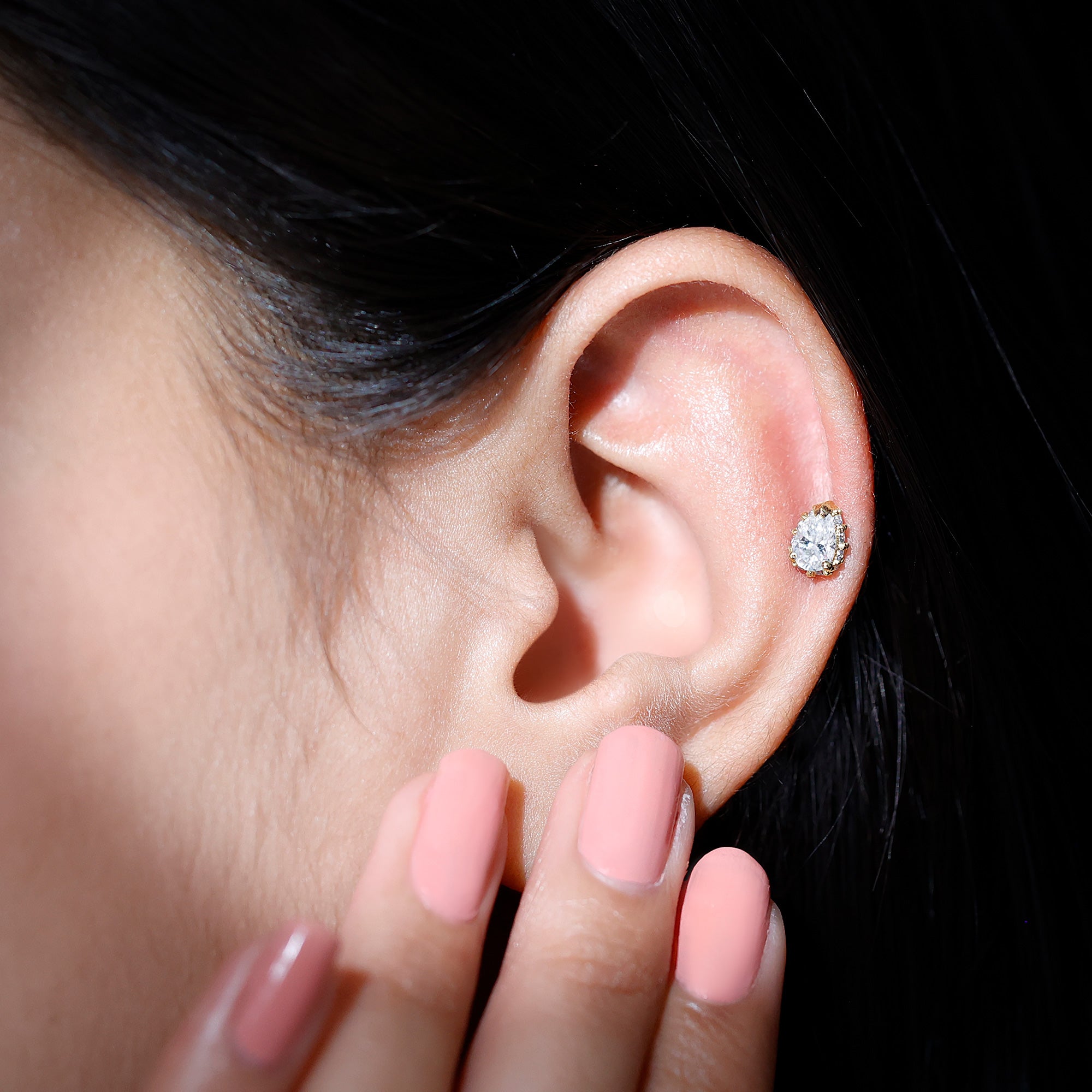 Indulge in luxury with our exquisite Moissanite Teardrop Earring, featuring a dazzling Pear Cut Moissanite in Prong Setting, accented with Round Cut Moissanite on the sides. This Tiny Earring is crafted in Gold and can be worn on your Helix, Tragus, Conch, Cartilage, or Upper Lobe Piercing. The Flat Back Closure ensures a comfortable and secure fit, making it the perfect choice for everyday wear or special occasions. Treat yourself or your loved one to this stunning piece of jewelry.