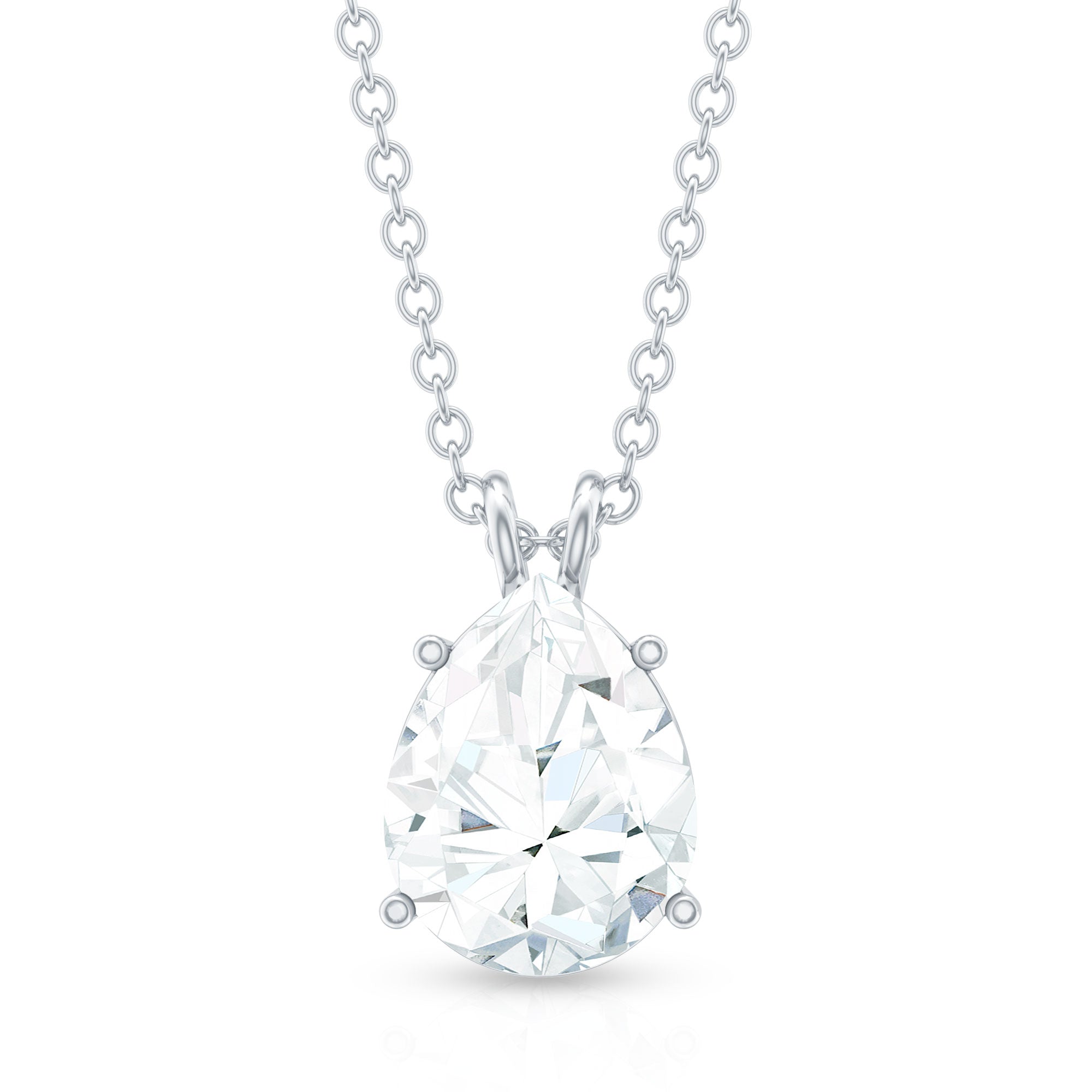 A pear shaped moissanite is the focal point of this teardrop solitaire design that looks simply gorgeous. It is set with prongs for an optimal sparkle and beauty. Linked to a bail for a lustrous look. Wear it short or long depending upon the look you intend to achieve.
