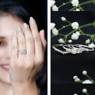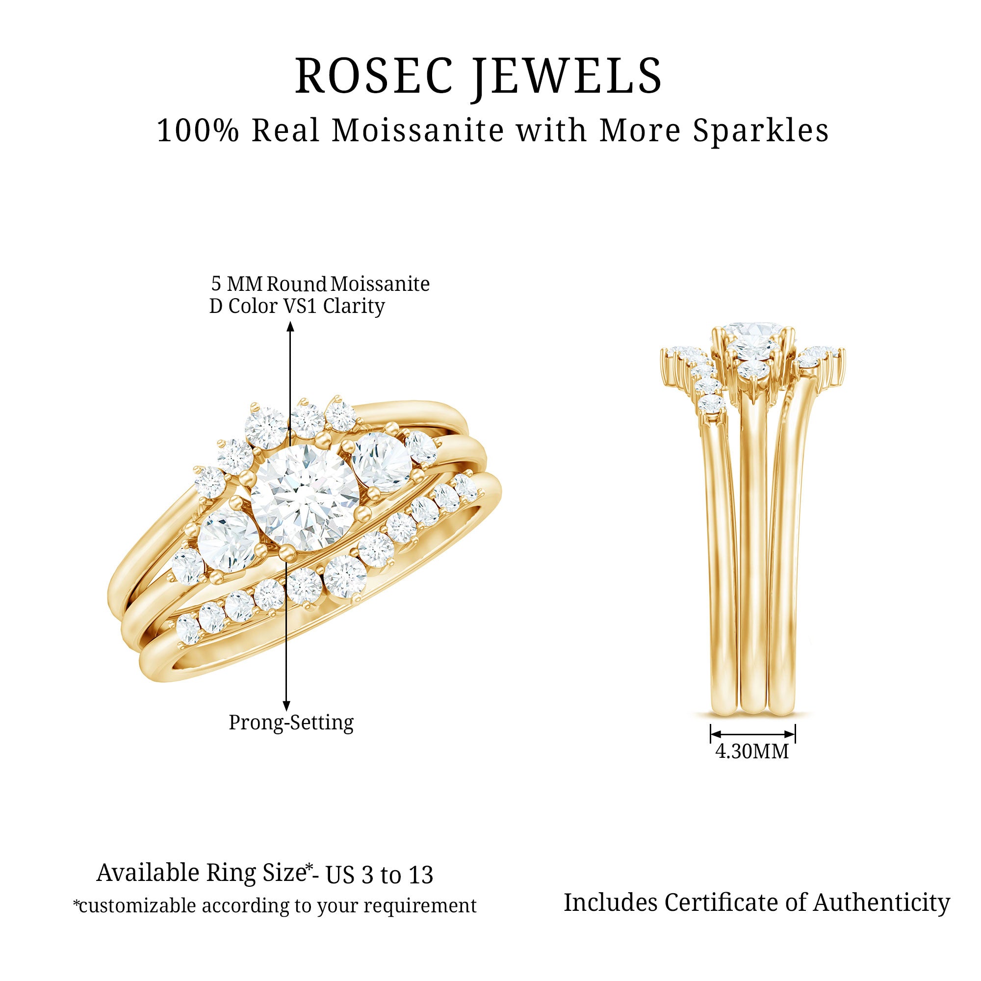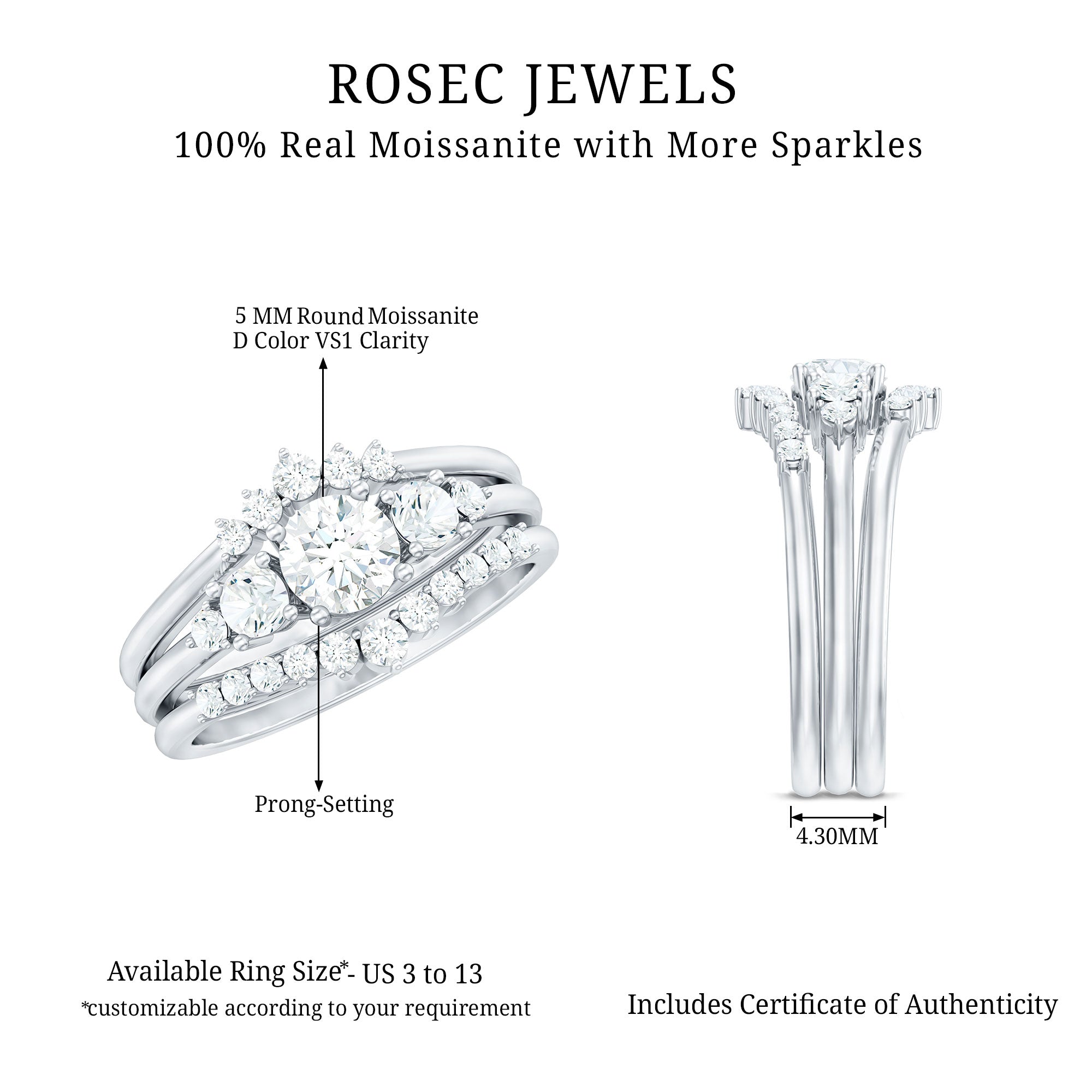 Celebrate a lifetime of love with this dazzling Moissanite Bridal Ring Set, designed to shine beautifully through every chapter of your story. The engagement ring features a brilliant 5 MM round cut moissanite held securely in prong setting. Graduated moissanite side stones flow gracefully along the band, adding even more radiance and creating an elegant look. For your wedding day, the Moissanite Engagement Ring Set includes two matching curved bands that frame the engagement ring perfectly from both sides. Each band is adorned with smaller round moissanites, adding soft shimmer and completing the trio with harmony and style. Together, the three rings form a stunning and meaningful Trio Wedding Set that symbolizes unity, devotion, and everlasting commitment. This versatile set can be worn all together for a luxurious appearance or worn separately for a more subtle and everyday style. Whether you are dressing up for a celebration or enjoying a quiet day, the rings adapt effortlessly to any moment.