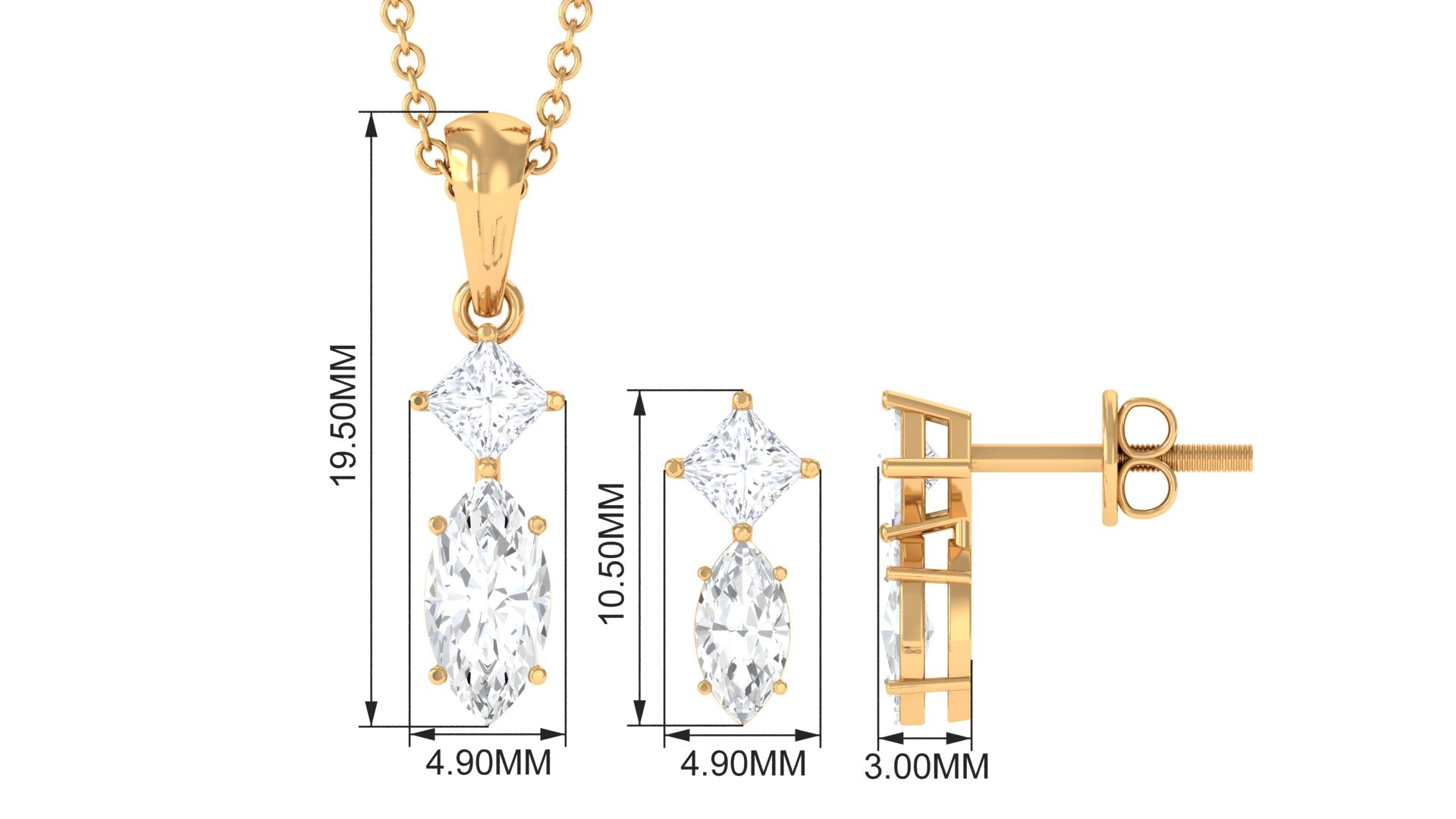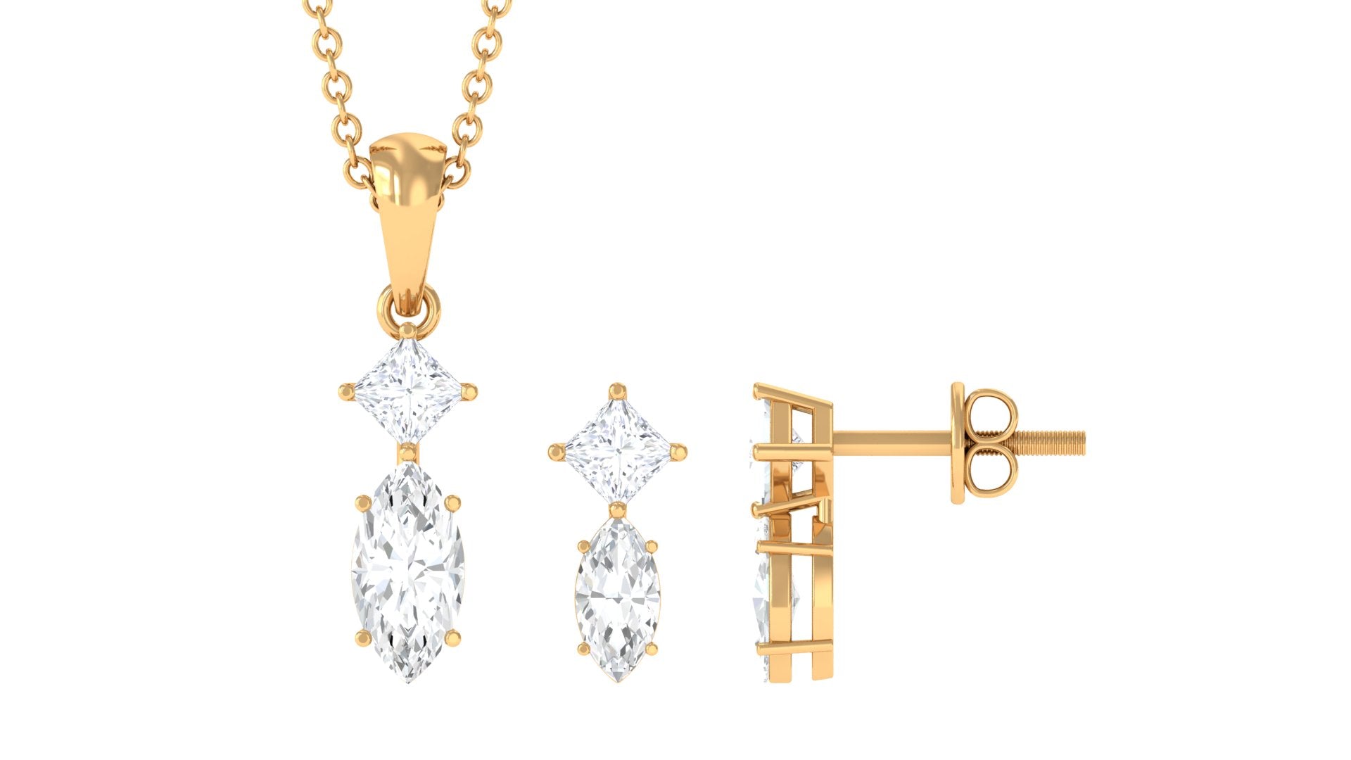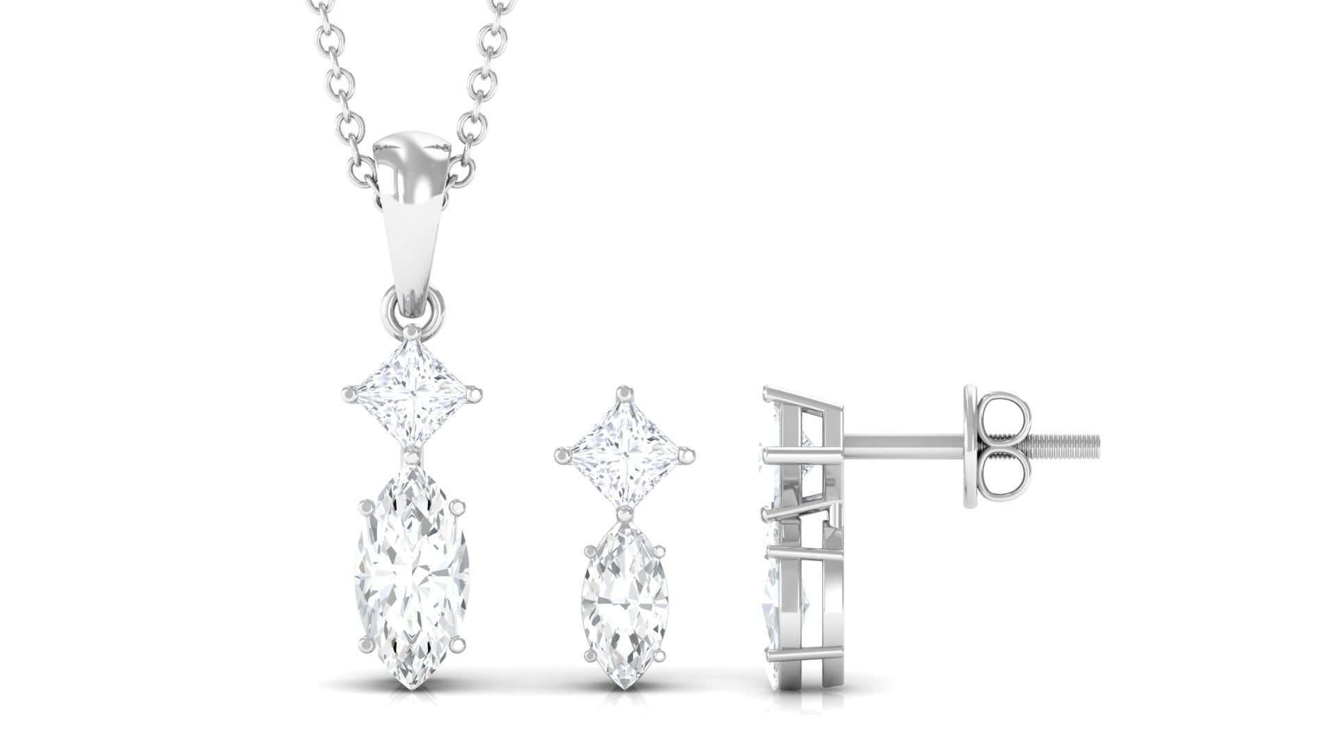 Experience divine grace with our two-stone pendant earrings set. Handcrafted with princess and marquise cut moissanite for a luxurious appeal.