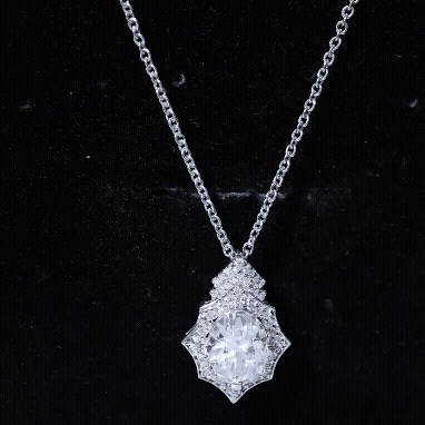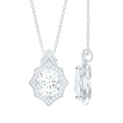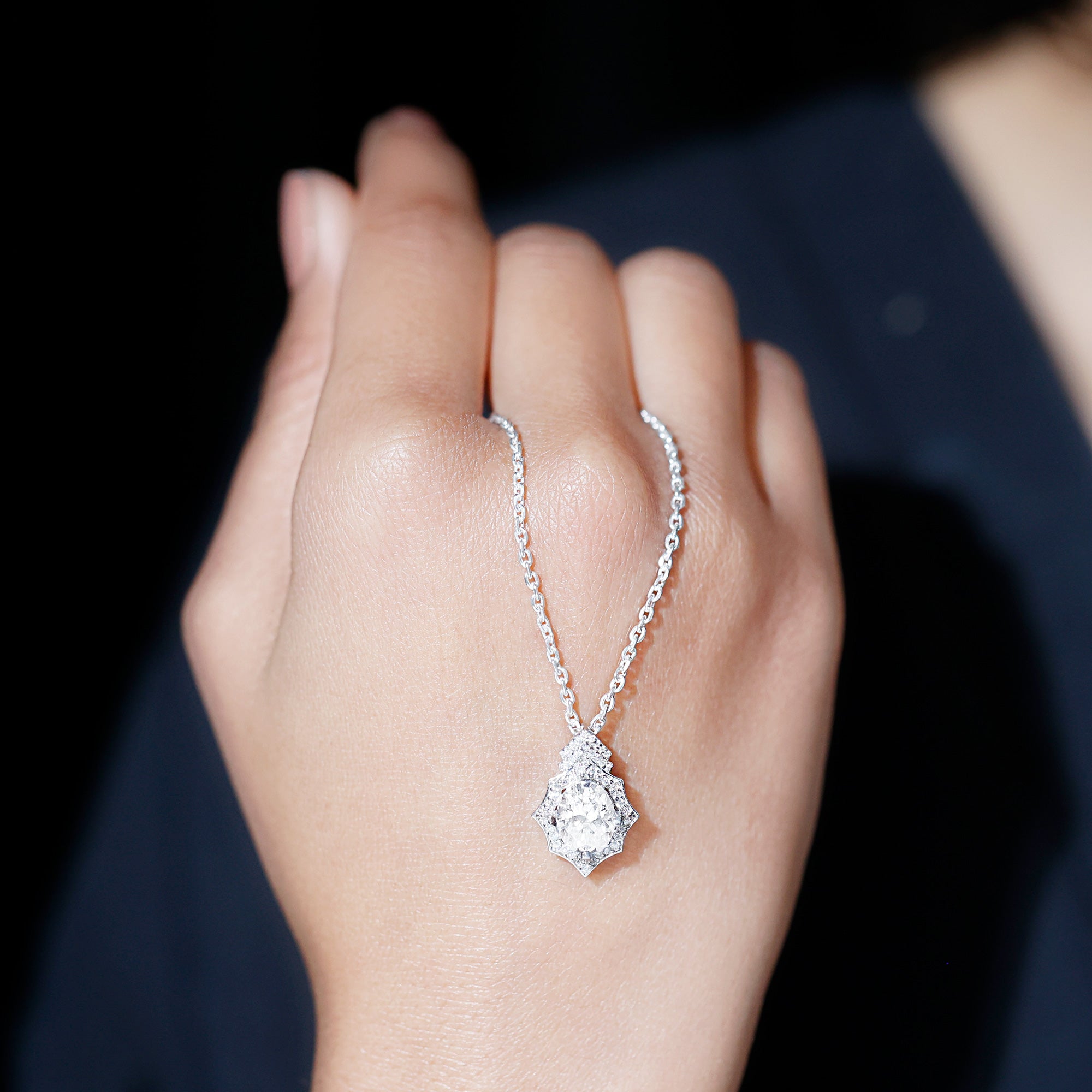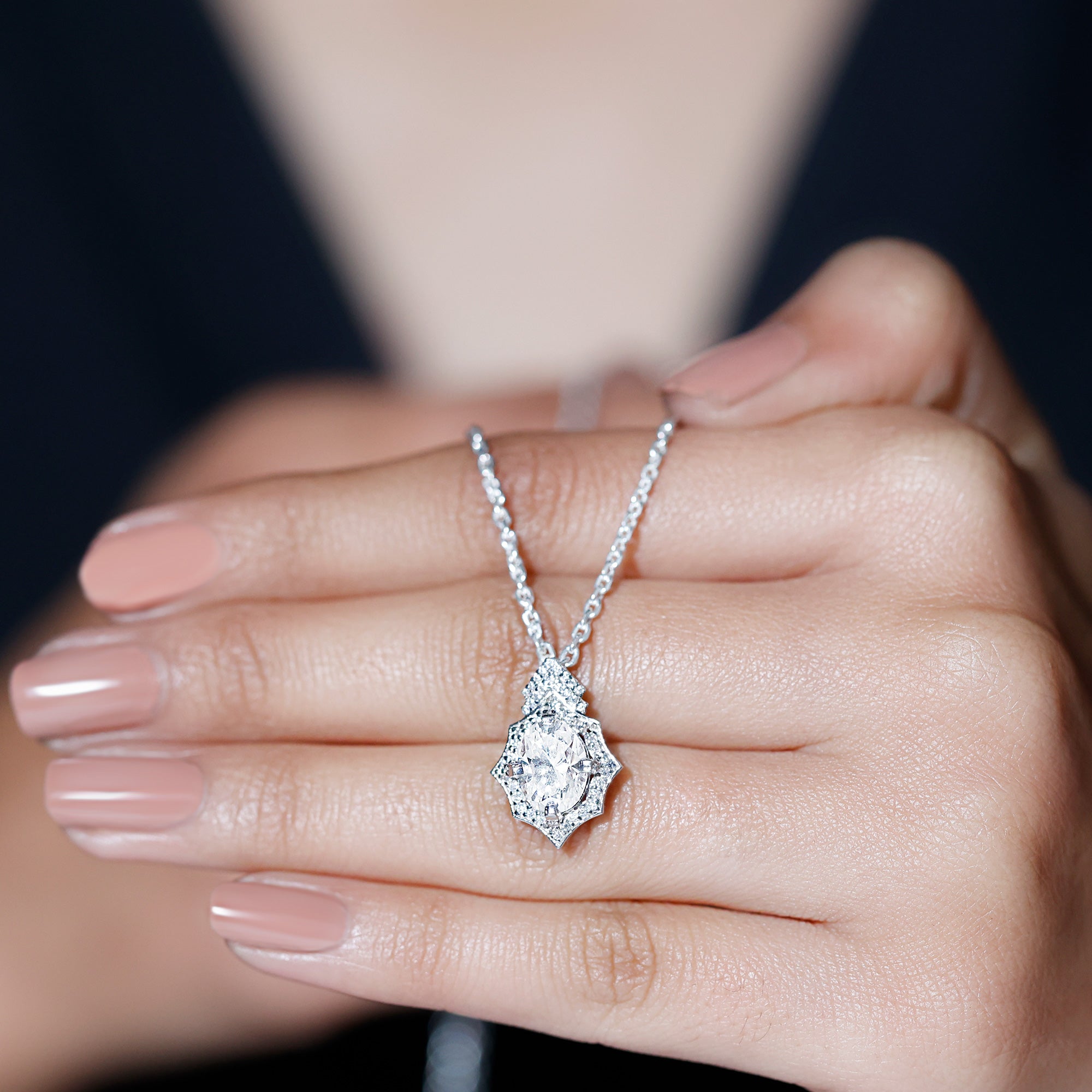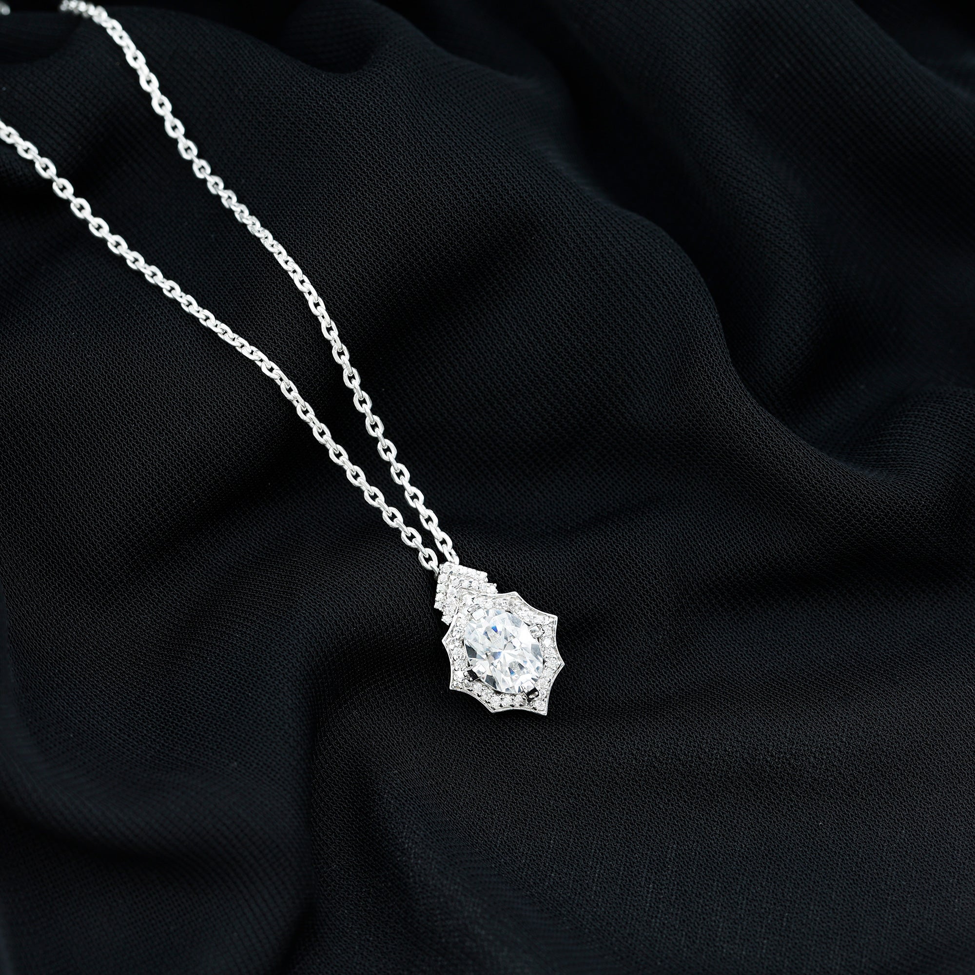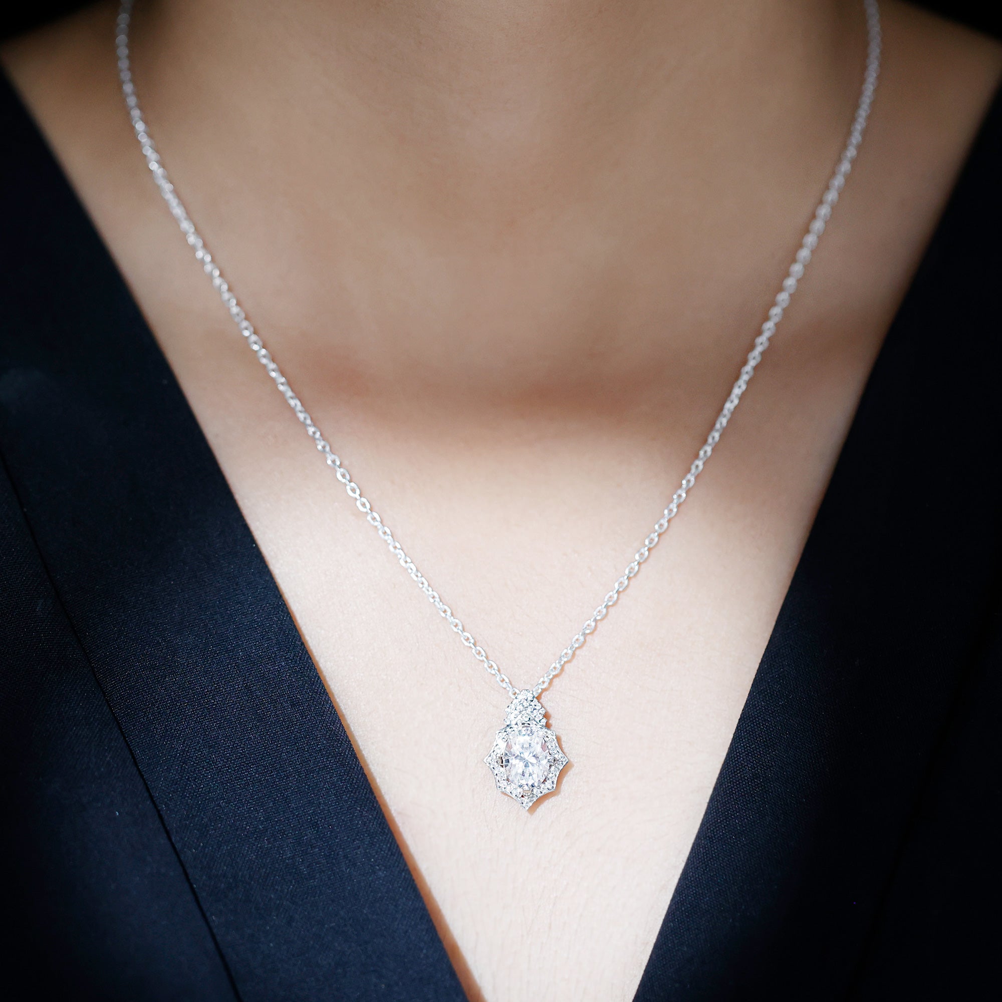 This Vintage inspired Moissanite Vintage Necklace will beautifully adorn the neckline with its unmatchable shine. The Art Deco Pendant is handcrafted with 14K White Gold Plated Silver and features a 7X9 MM Oval Shape Moissanite of D-VS1 Quality. The center stone is encircled with small moissanite stones secured in Prong Setting over a asymmetrical frame. This Halo Pendant has a hidden bail which let the pendant dangles with a cable chain having secured lobster clasp. This pendant can be styled with any outfit to achieve a classic look. This Designer Pendant will be delivered to you in a premium packaging with a certificate of authenticity.
