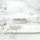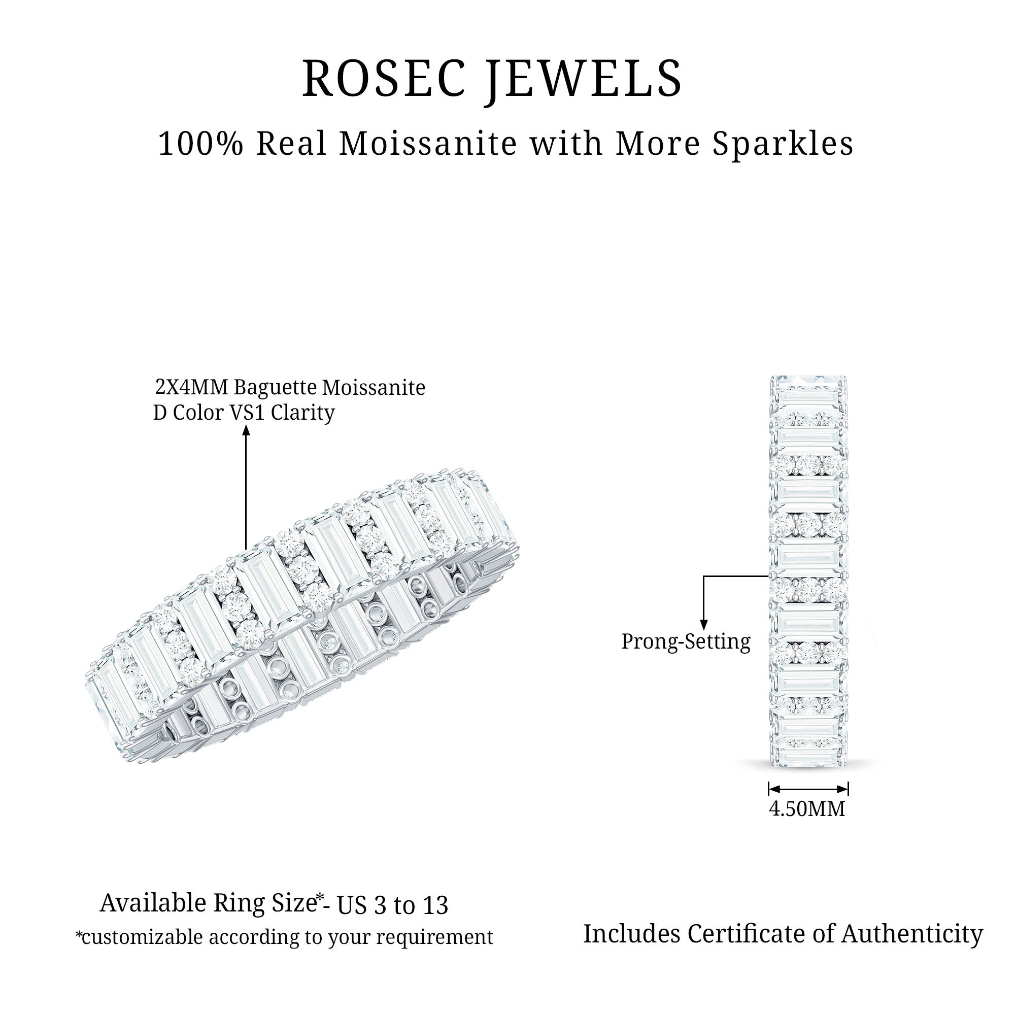 Unbroken, unending, and unforgettable - this Moissanite Wedding Band is not just a symbol, it is a promise. A timeless representation of love that never fades, this Full Eternity Band is made with exquisite brilliance and lasting elegance. It showcases a stunning mix of baguette and round cut moissanite stones, with each gem carefully chosen for its flawless D color and VS1 clarity. The outcome is a dazzling band that not only reflects light but also the depth of your commitment. With a secure prong setting, the stones are arranged to catch light from every angle, guaranteeing a bright display that draws the eye. Its elegant design allows this Wedding Anniversary Band to be worn alone for a classic look or stacked with an engagement ring or other bands for extra flair and drama. More than just jewelry, this Moissanite Eternity Band is a lasting reminder of special moments, whether you are marking a wedding, anniversary, birthday, or a significant moment of self-love. Beautifully made and eternally meaningful, this ring turns everyday wear into a celebration of what truly matters.