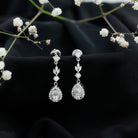 Add a touch of brilliance to your bridal glow with these Teardrop Wedding Earrings. Designed to capture the essence of luxury, each earring features a stunning cascade of moissanite stones, starting with a round cut gem, followed by marquise shaped stones that add a delicate, leaf like charm. The masterpiece of these Bridal Earrings is the 5X7 MM pear shaped moissanite drop, framed with a halo of tiny shimmering stones, enhancing its brilliance and making it the ultimate showstopper. Each stone is set in secure prong setting and designed to include sparkle in your big day. The Certified Moissanite Dangling Earrings are crafted in 14K White Gold Plated Silver with a secure screw back closure, ensuring a comfortable and snug fit throughout your special day. These Dangling Earrings come with a certificate of authenticity for gemstones and is packaged in a premium velvet pouch.
