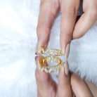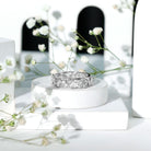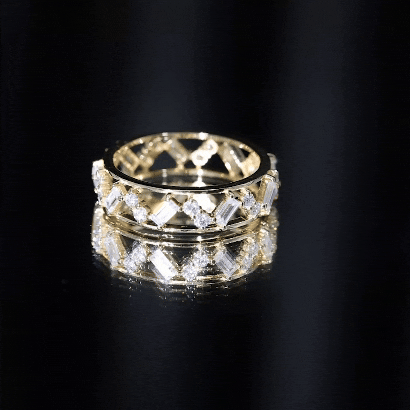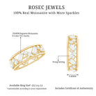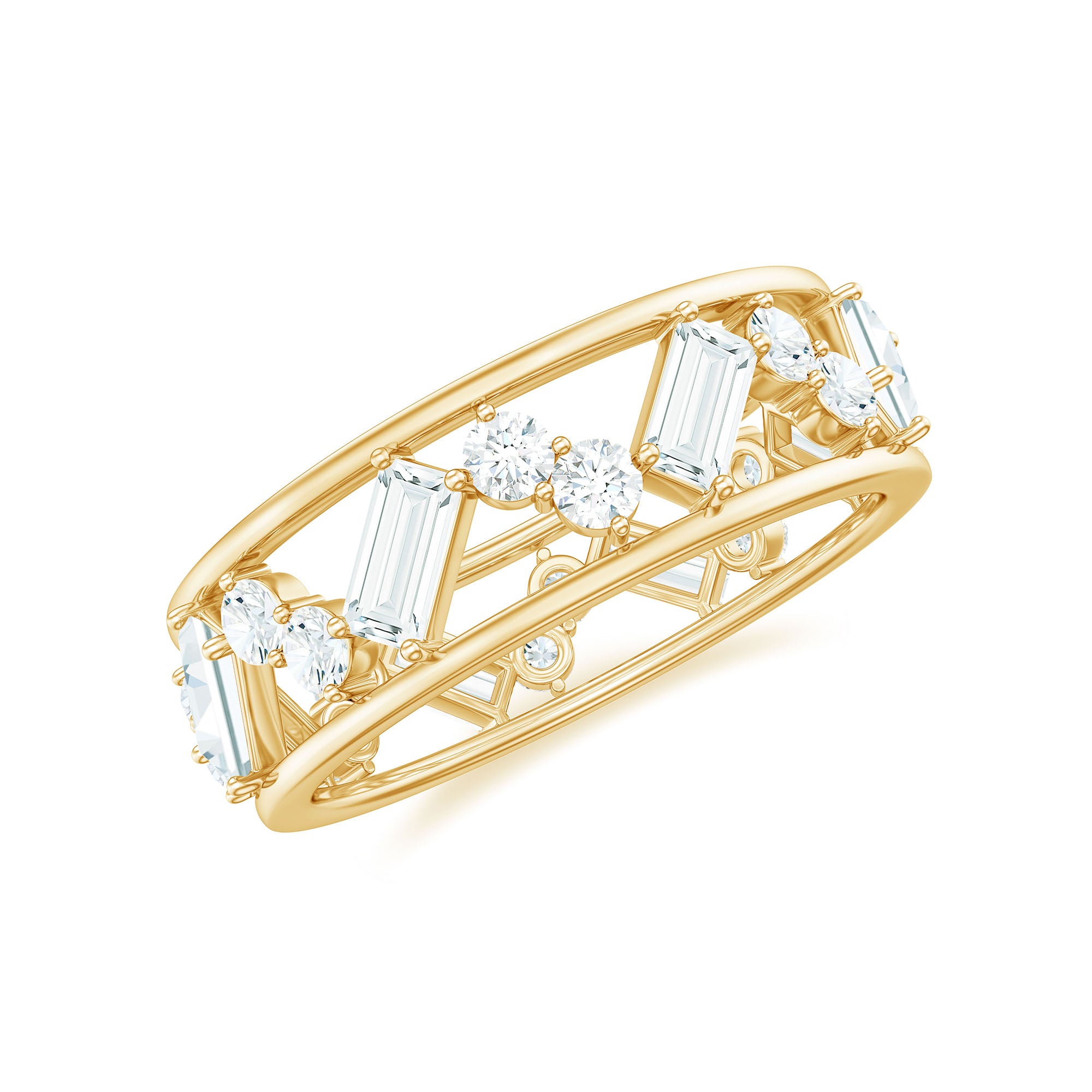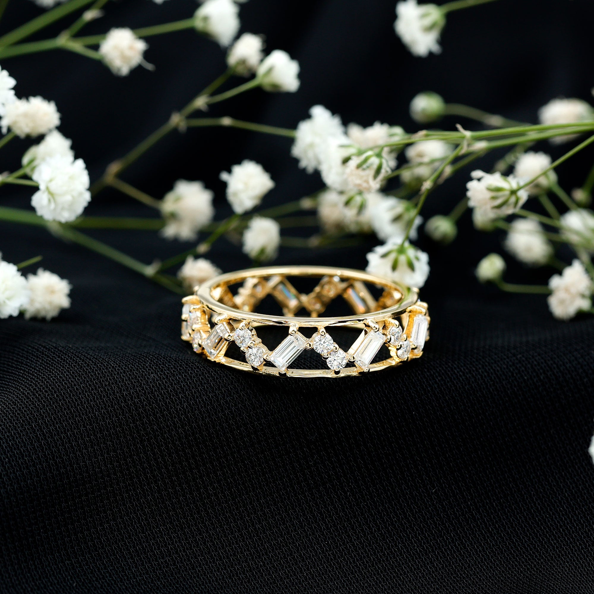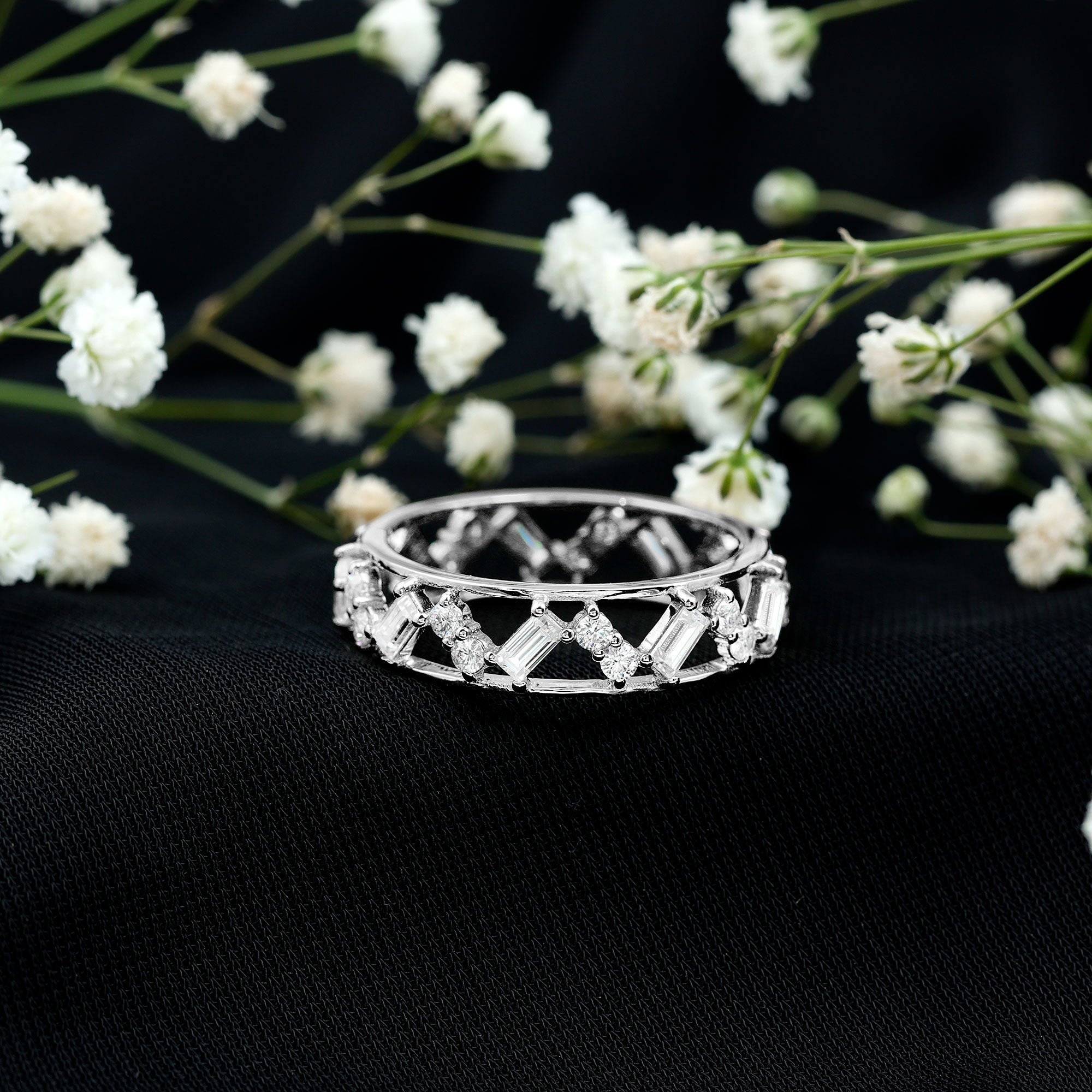 Mark your forever with a Moissanite Eternity Ring that serves as a timeless token of love. Made for the couple that likes to stand out, it features a series of Baguette and Round Cut Moissanite, held securely by a Prong Setting and brought together in a unique Zig Zag Pattern. Whats more, each Moissanite in this Wide Eternity Ring fetches a quality grade of D-VS1.