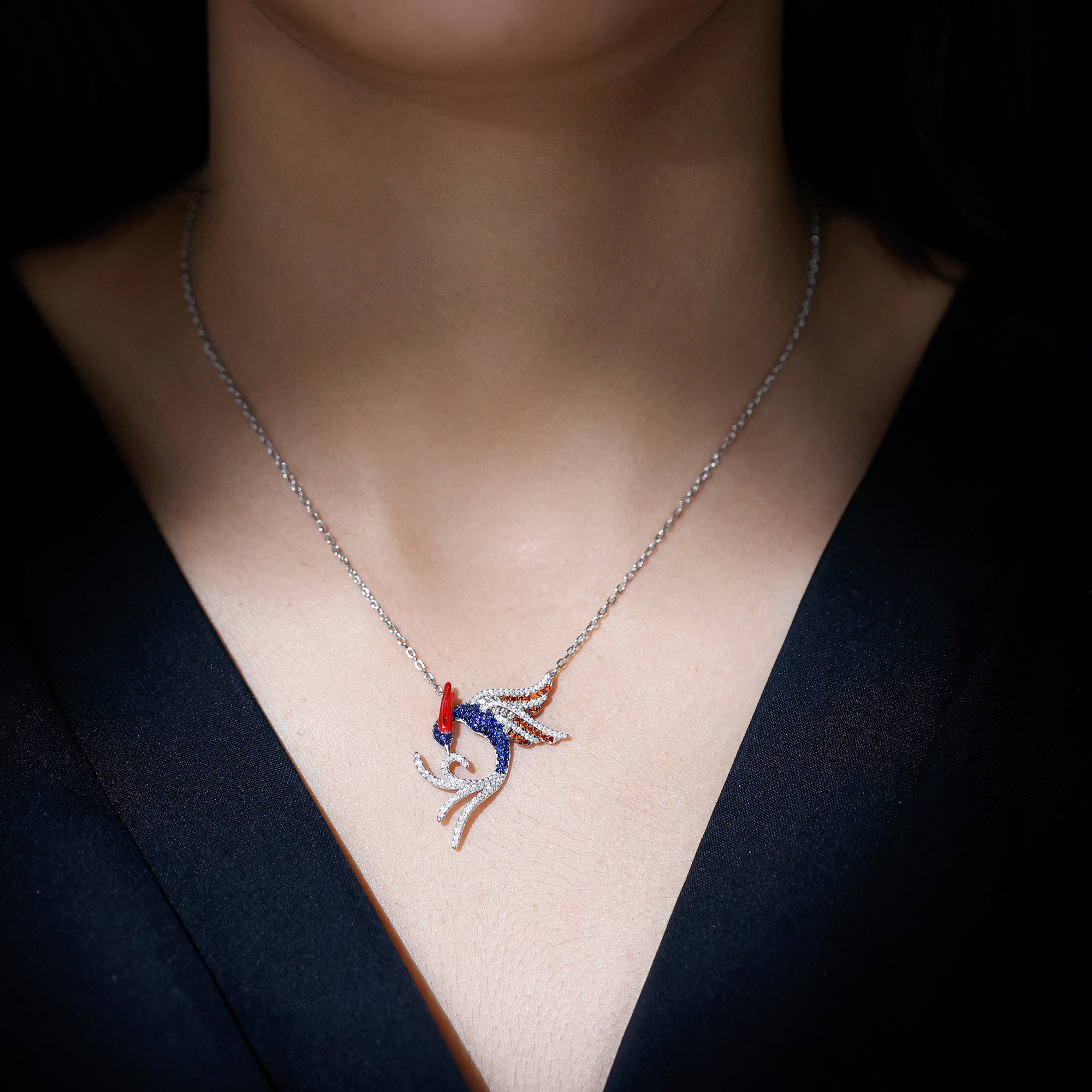 Get ready to ignite your style with this stunning Bird Necklace, a vibrant symbol of strength, renewal and fearless beauty. Crafted in gleaming 925 Sterling Silver, the phoenix design bursts to life with an array of radiant Lab Blue Sapphire, Lab Orange Sapphire, Lab Yellow Sapphire and Zircon stones, each one adding a unique splash of color that makes the piece feel bold, artistic and full of energy. The detailed wings and flowing shape create a captivating design that instantly draws attention, whether you are dressing up for a special occasion or elevating a simple everyday outfit. Pair it with a classic outfit or even a casual dress to give your look a touch of mystical charm and modern flair. Presented in an elegant jewelry box, this Multi Gemstone Necklace is ready to gift, making it a meaningful choice for birthdays, holidays, graduations or any moment when you want to celebrate someone’s inner fire. With its symbolic design and eye-catching sparkle, this Sterling Silver Bird Necklace is a statement of resilience, beauty and transformation, ready to become a treasured part of any collection.