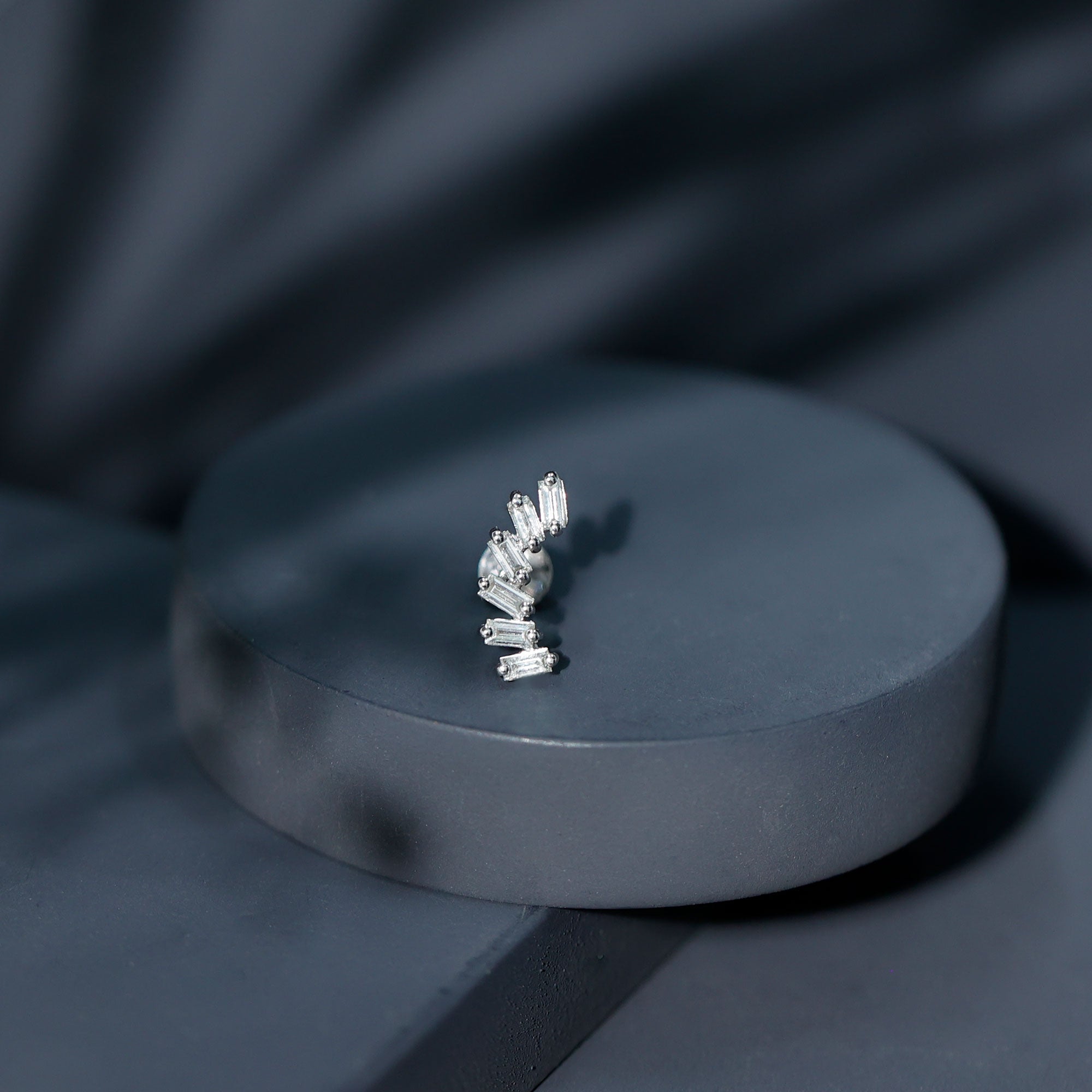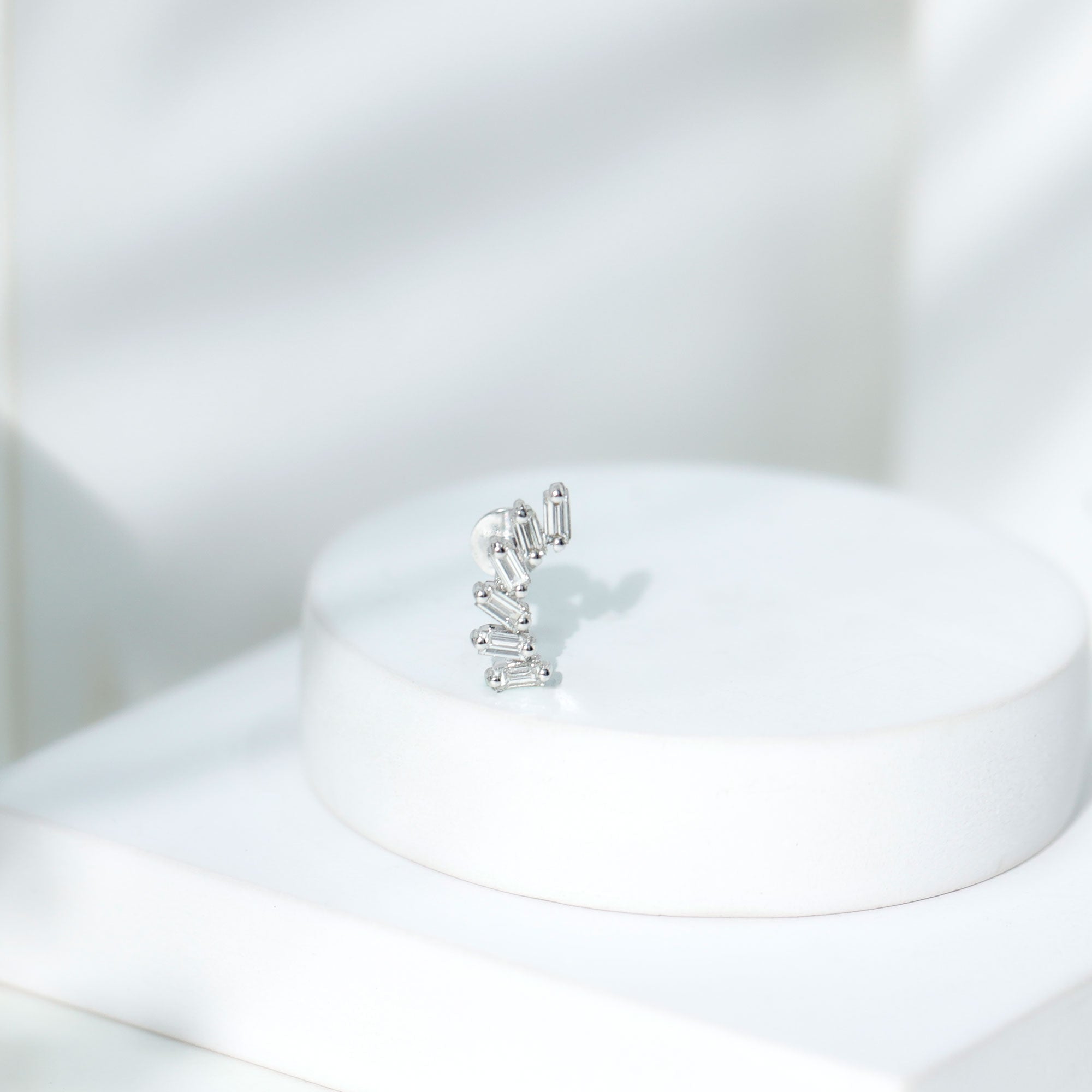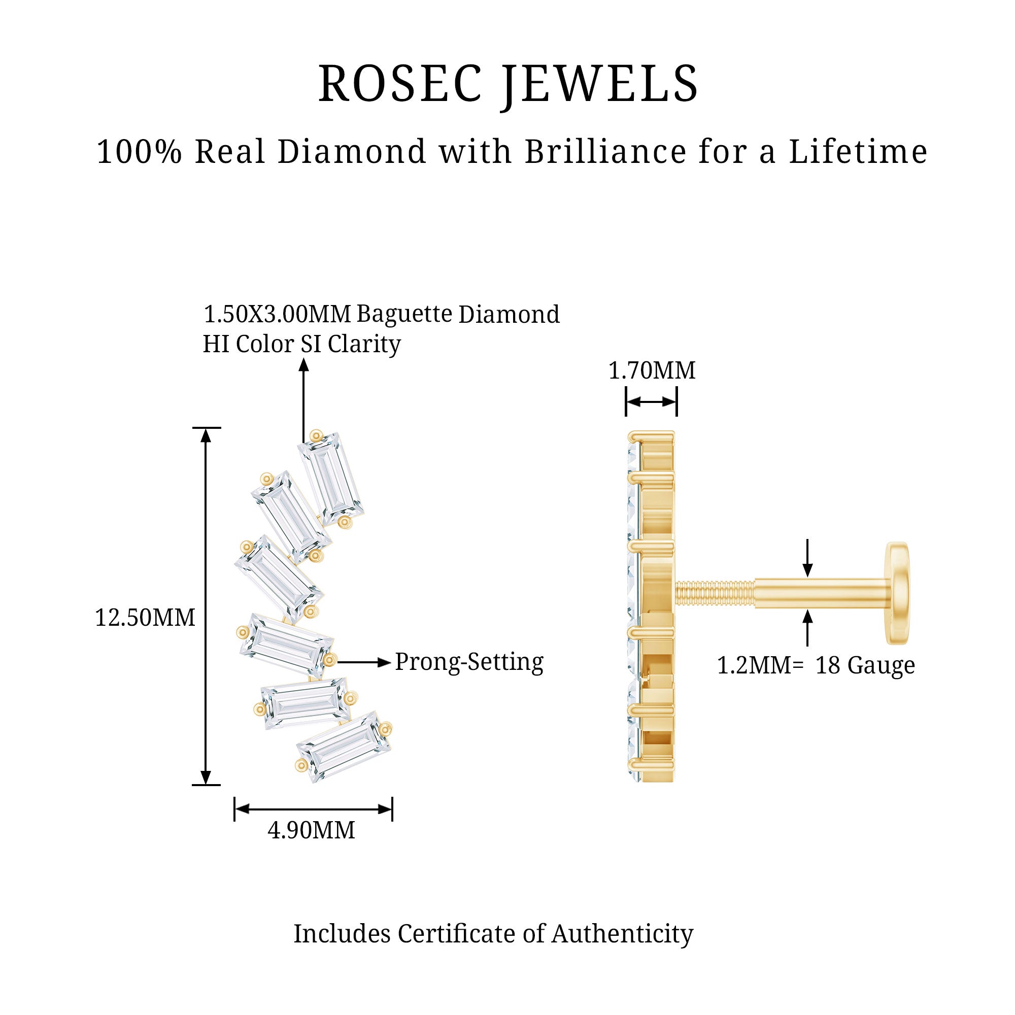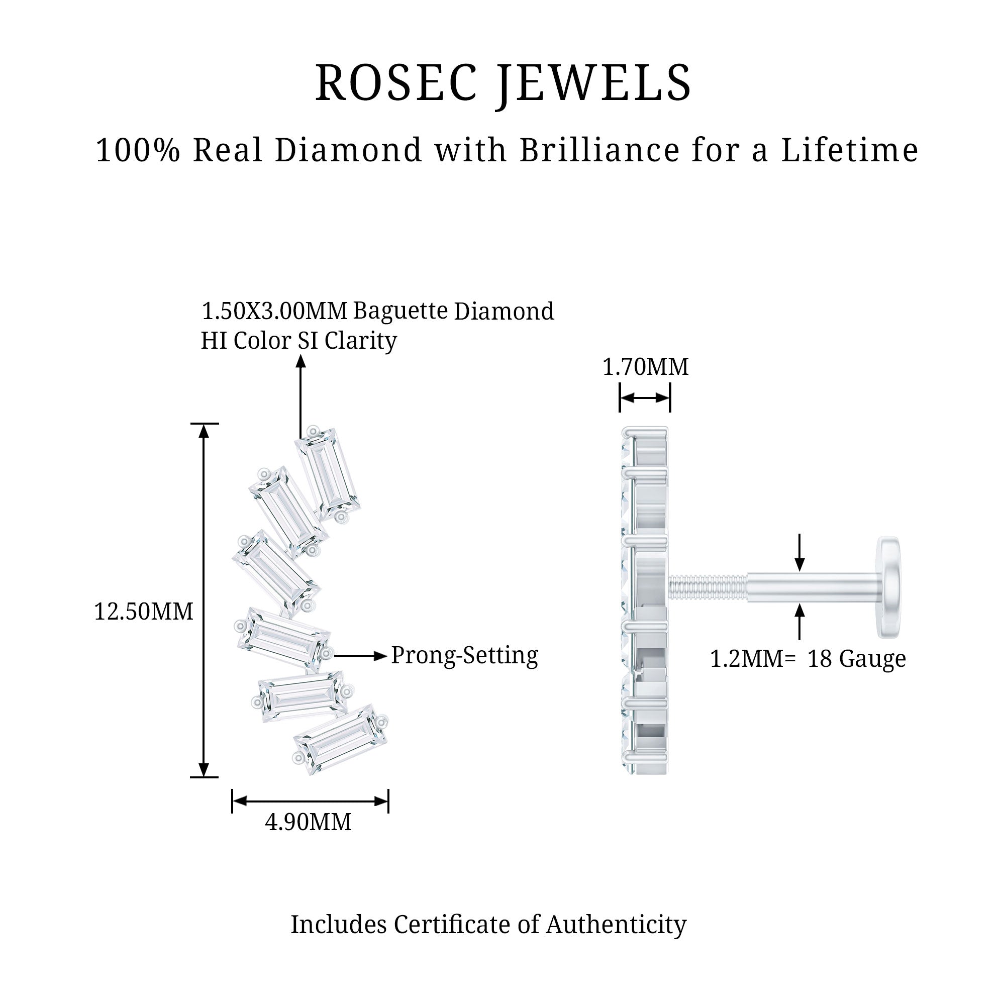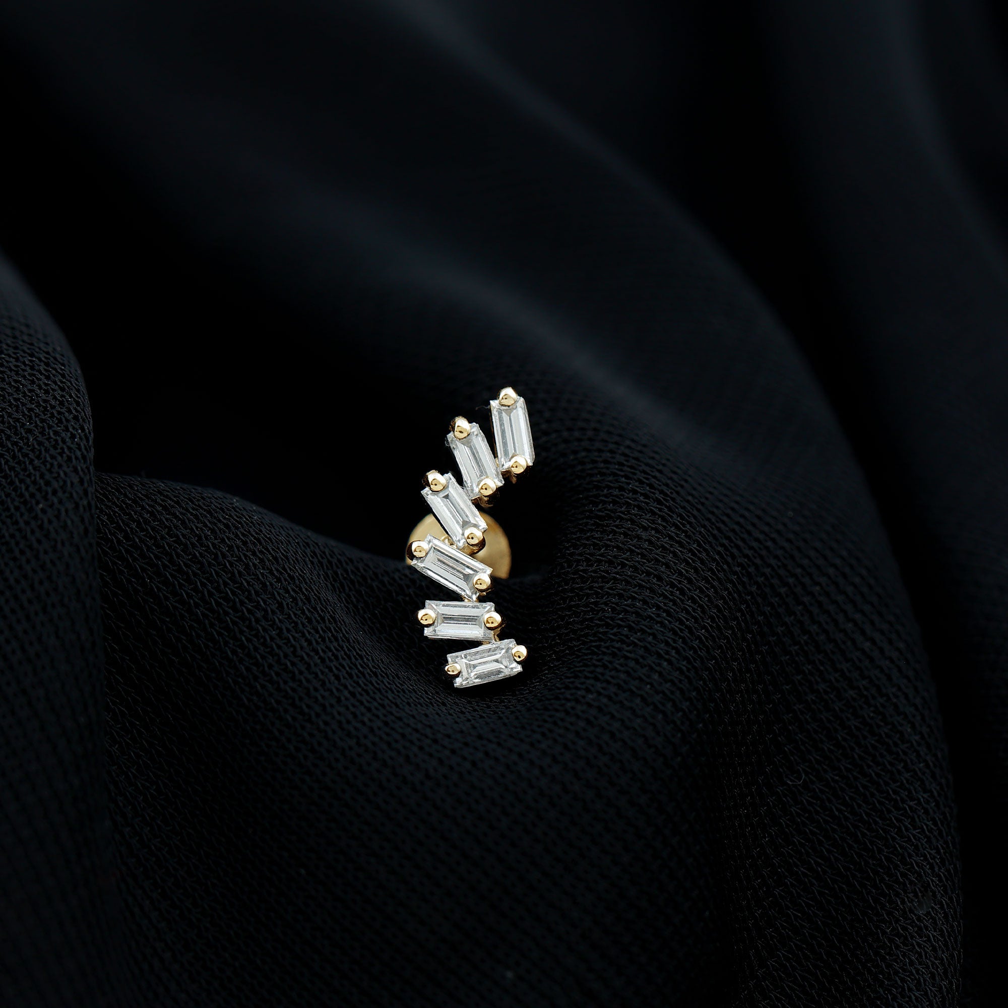 Beautify your ear with this Curved Crawler Earring, a head-turner jewelry piece that doubles your ear's real estate. This crawler earring features Baguette Cut Diamonds set in Prong Setting studded on a curved design, it is crafted with Hallmarked Metal. This Diamond Earring is the bomb accessory for all sorts of occasions. Wear it on your Helix, Cartilage, Conch, or Upper Lobe Piercings - wherever you are feeling it. Heres a tip: We suggest pairing it with simple dainty studs for a chic stacked look! Deck out for that special bash with this Diamond Earring, or gift this to your homie for their birthday. Straight fire, guarantee!