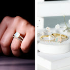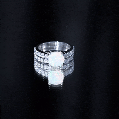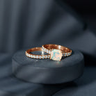 Handcrafted with perfection and attention to detail, this Wedding Engagement Ring Set is a radiant duo designed to celebrate your forever in full color. This 2 Piece Ring Set includes a dazzling Engagement Ring and Wedding Band, creating a look that is completely captivating. The star of the show is an 8 mm Cushion Cut Ethiopian Opal of AAA Quality set in Prong Setting with two Hidden Moissanite stones, glowing with magical flashes of ethereal light. Flanked by brilliant D-VS1 Moissanite side stones, the Solitaire Engagement Ring offers a romantic blend of classic sparkle and beauty. The matching Half Eternity Wedding Band continues the story with shimmering Moissanite stones set across the band, adding harmony, elegance and extra shine to your stack. Together, they create a stunning design that is timeless with a twist, perfect for the bride who wants something meaningful, unique and absolutely breathtaking. Available in a range of ring sizes and delivered in a luxe jewelry box, this Opal Engagement Ring Set is ready for proposal and perfect for the aisle.