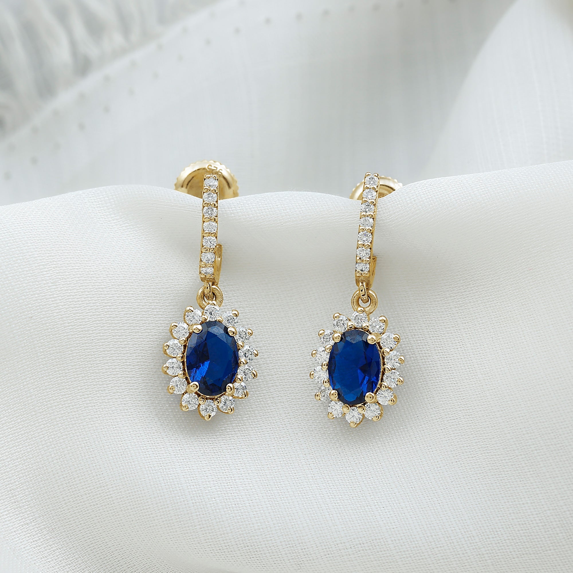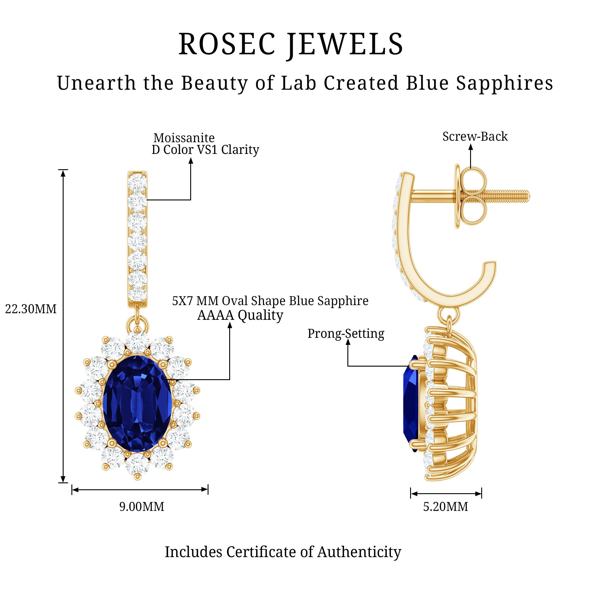 These mesmerizing Lab Grown Blue Sapphire Earrings symbolize prosperity and love. To truly elevate your special wedding day or simply to introduce a modern touch, these Hoop Drop Earrings are an excellent choice and are meticulously crafted by our skilled artisans with great attention to detail. Adorned with a 5X7 mm Oval Shape Lab Created Blue Sapphire set in Prong Setting, encircled by a Halo of Round Shape Moissanite stones, they sparkle beautifully. The J Hoop is decorated with petite Moissanite stones, making these Bridal Earrings a remarkable accessory that she will cherish forever. Contributing to a sense of royalty and sophistication, these Wedding Earrings feature a delightful detail that maintains their elegance, while their vibrant color and bold design ensure they stand out in any setting. Maximizing sparkle and brilliance, these Lab Grown Blue Sapphire Drop Earrings showcase a subtle yet elegant tone of AAAA Quality Lab Grown Blue Sapphire and D-VS1 Moissanite stones, offering exceptional brilliance.