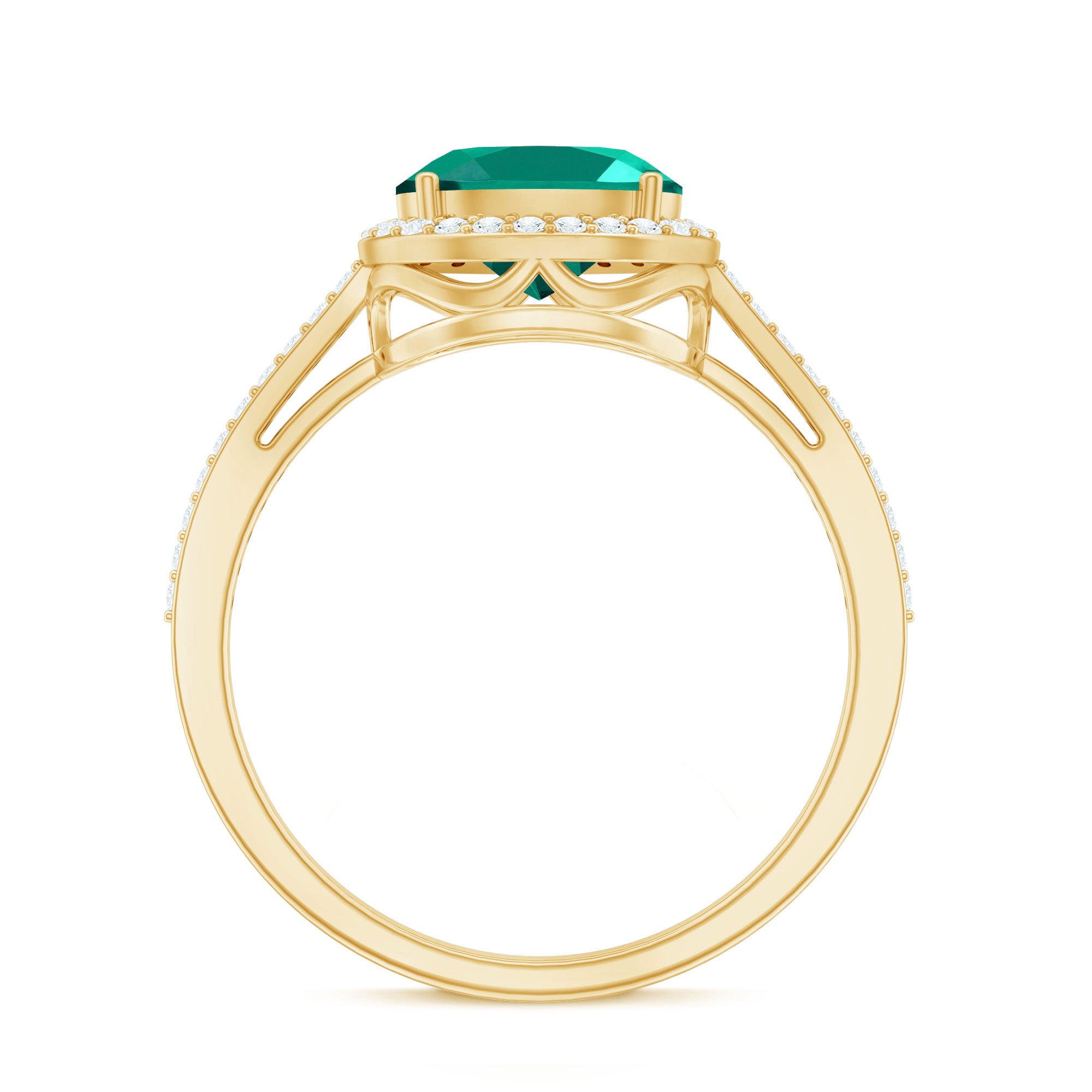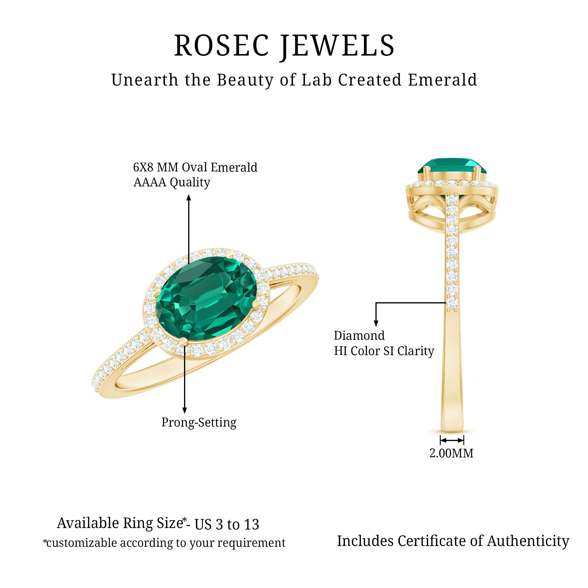 This Classic Engagement Ring is made to stand out. Featuring a beautiful 6X8 mm Oval Shape Lab Created Emerald of AAAA Quality set in an eye-catching east-west style, it is a fresh twist on the classic engagement ring. The rich green Lab Emerald is surrounded by a sparkling Halo of Diamond stones that add extra shine and sparkle. Small Diamond side stones on the band complete the look, giving it just the right amount of glam without going over the top. Designed for someone who loves timeless beauty but also wants something a little different, this Oval Engagement Ring is stylish, elegant and full of personality. The Lab Grown Emerald is stunning and an eco-friendly choice you can feel good about. Whether you are proposing or celebrating something special, this Lab Emerald Diamond Engagement Ring comes in a signature jewelry box, ready to gift or unbox in a moment you will never forget. Simple and stunning, this Lab Grown Emerald Engagement Ring is the perfect ring for a love that is one of a kind.