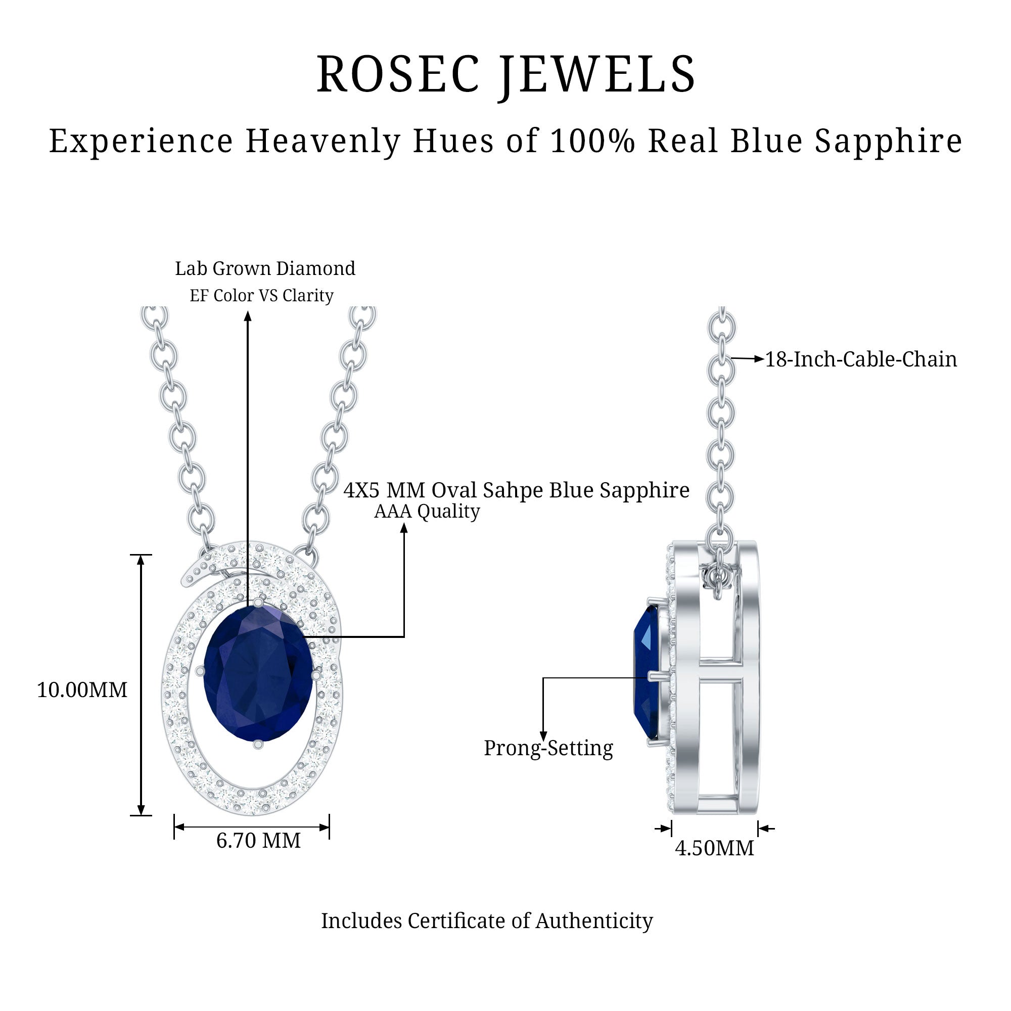 Elevate your elegance with this stunning Blue Sapphire Pendant, a perfect blend of sophistication and timeless beauty. The dazzling 4X5 mm Oval Shape Blue Sapphire of AAA Quality, renowned as the stone of royalty, is beautifully set in an Open Oval Shaped frame lined with shimmering Lab Grown Diamond stones, creating a captivating contrast that draws every eye. The deep blue hue of the Sapphire symbolizes wisdom and loyalty, making it a meaningful and regal addition to your jewelry collection. Beyond its breathtaking appearance, the Blue Sapphire is believed to promote mental clarity, emotional balance, and calming energy, ideal for those seeking both beauty and positive vibes. This Blue Sapphire Diamond Necklace hangs gracefully from a delicate chain, offering a versatile piece that complements any special occasion, from weddings and anniversaries to elegant parties or formal events. Presented in an elegant signature jewelry box, this Real Sapphire Pendant is ready to gift or keep as a cherished personal treasure. Whether worn as a statement piece or layered with other accessories, this Sapphire Blue Necklace brings an air of royalty and positive energy, making every moment shine a little brighter.
