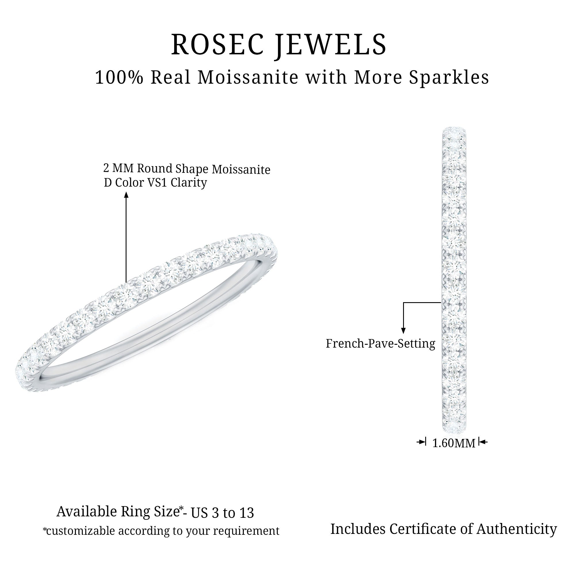 If you have a taste for the finer things in life, you absolutely must take a look at this Minimalist Band Ring. This gorgeous Eternity Ring for Women is made from 14K White Gold Plated Silver and showcases a continuous line of dazzling round cut certified Moissanite (D-VS1 quality), elegantly set in french pave setting across the band. Whether you are indulging yourself or looking for the ideal gift, this Moissanite Stackable Ring is a genuine emblem of sophistication. Additionally, it includes a quality assurance certificate, ensuring its craftsmanship and authenticity. With its understated elegance, this Simple Eternity Ring exudes a beauty that is sure to draw attention. Minimalist yet refined, this Pave Eternity Ring can be paired with other bands or an engagement ring, or simply worn alone. It is perfect as a wedding band, a considerate anniversary gift, or a charming way to celebrate any special occasion. This Stackable Eternity Ring is destined to become a cherished addition to her jewelry collection for many years ahead.