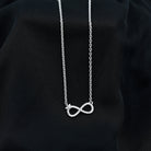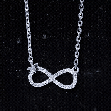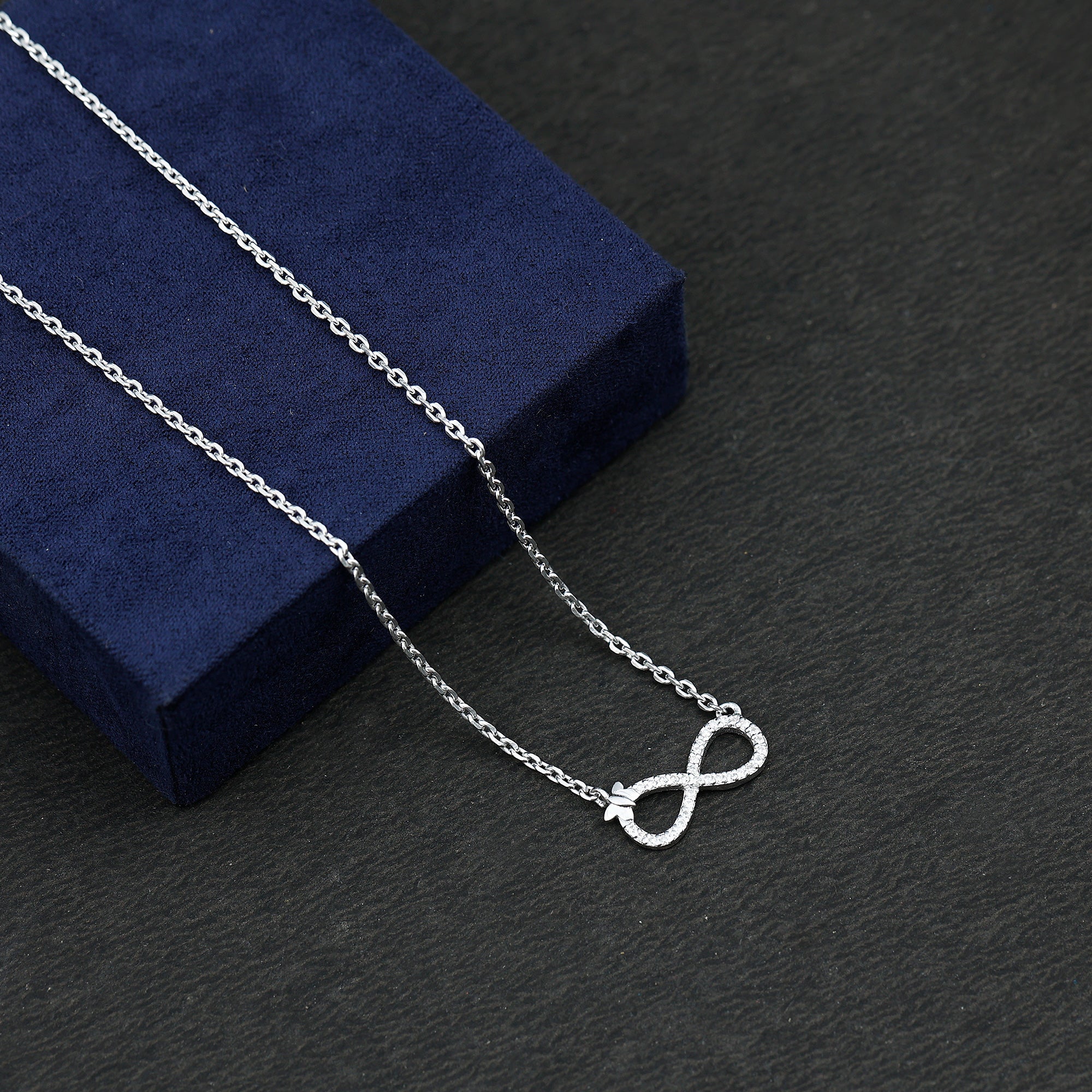 Introducing our 14K White Gold Plated Silver Infinity Necklace - a mesmerizing blend of elegance and sophistication. Elevate your style with this timeless piece. In this Forever Necklace, a cute silver butterfly landed on the infinity symbol that is adorned with a series of pave set shimmering round cut moissanite stones, symbolizing everlasting beauty and freedom. The butterfly is a popular symbol of rebirth and renewal. Many view it as a representation of the soul. When combined with the infinity symbol, the Butterfly Infinity Pendant becomes a beautiful way to honor your loved one. It hangs from a delicate cable chain, which is finished with a lobster clasp closure for a secure fit. This Infinity Pendant Necklace comes in a pretty signature velvet pouch. Its beautiful to wear and makes a wonderful gift, perfect for women of all ages. An ideal present for yourself, your girlfriend, close friends, daughter, mother, brides, and for occasions like Valentines Day, anniversaries, birthdays, weddings, special events, Mothers Day, Christmas, graduations, and more. A truly special gift for someone whom you want to show your love.