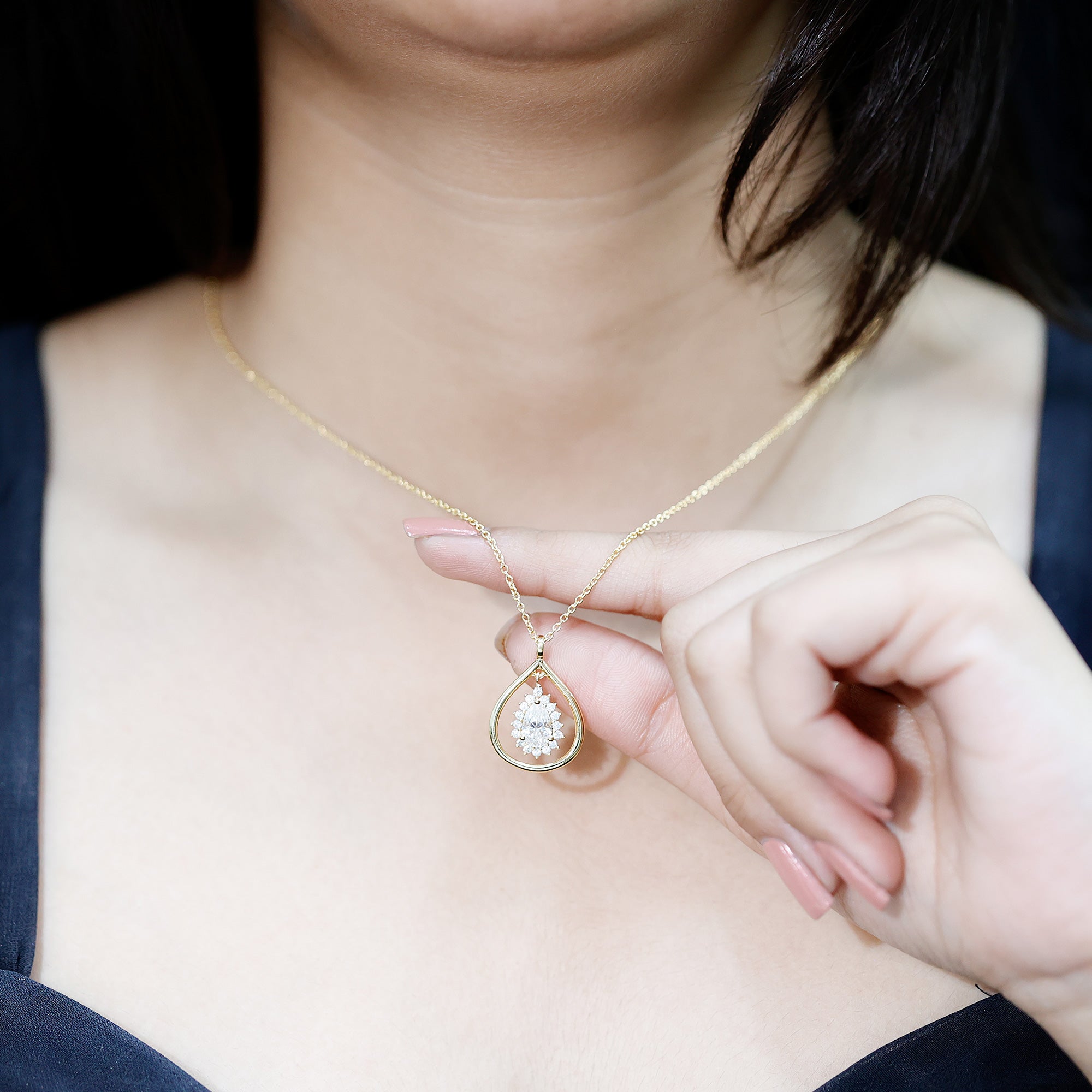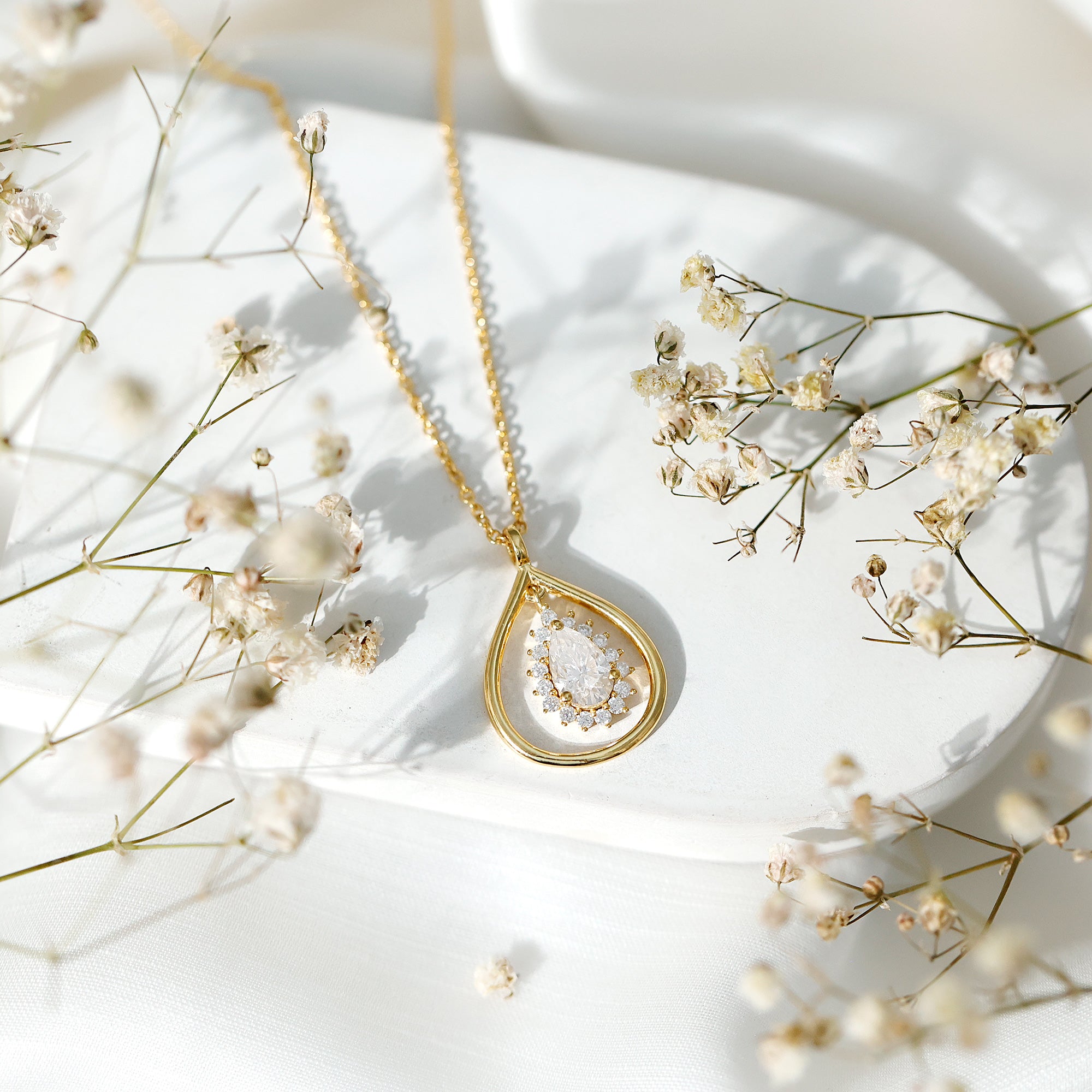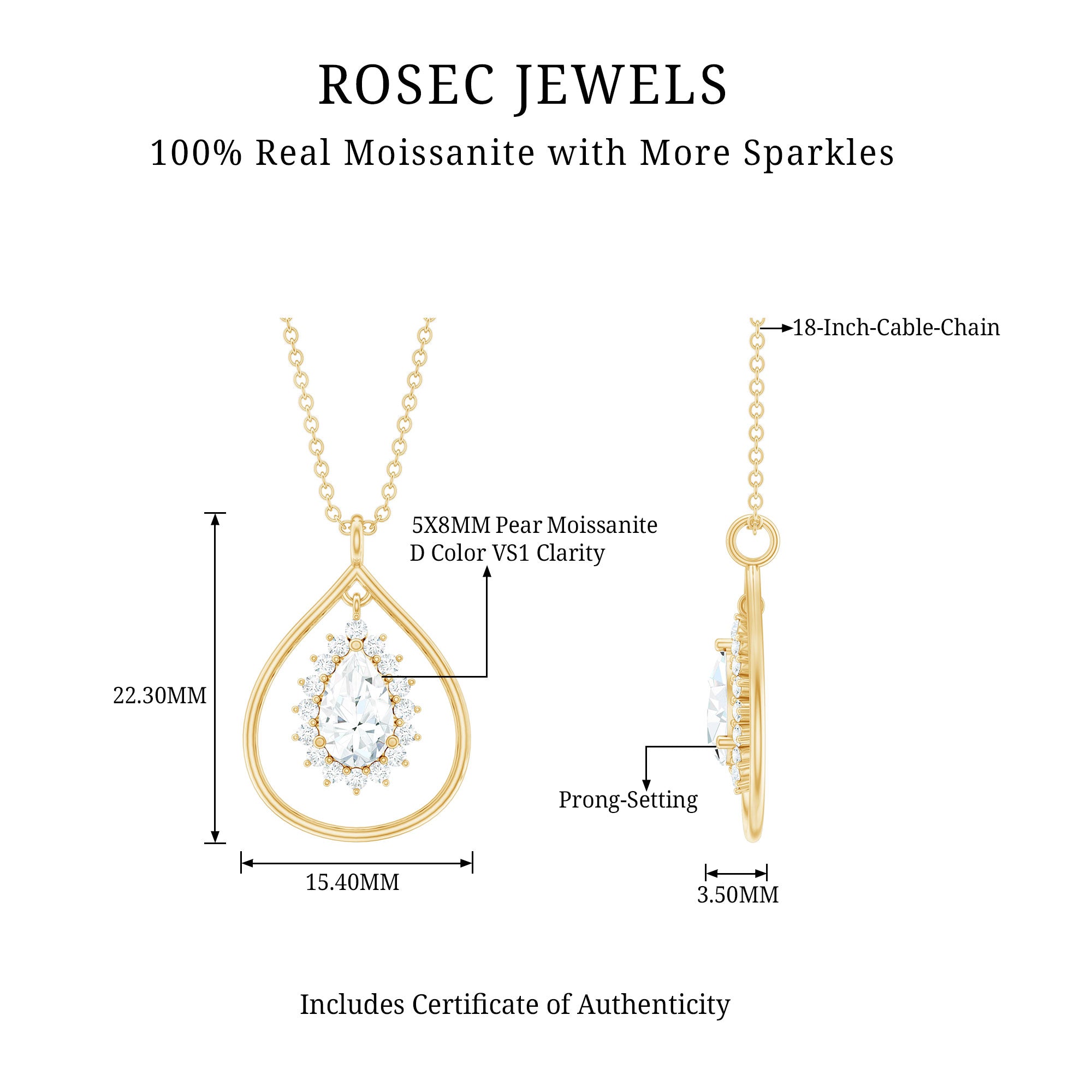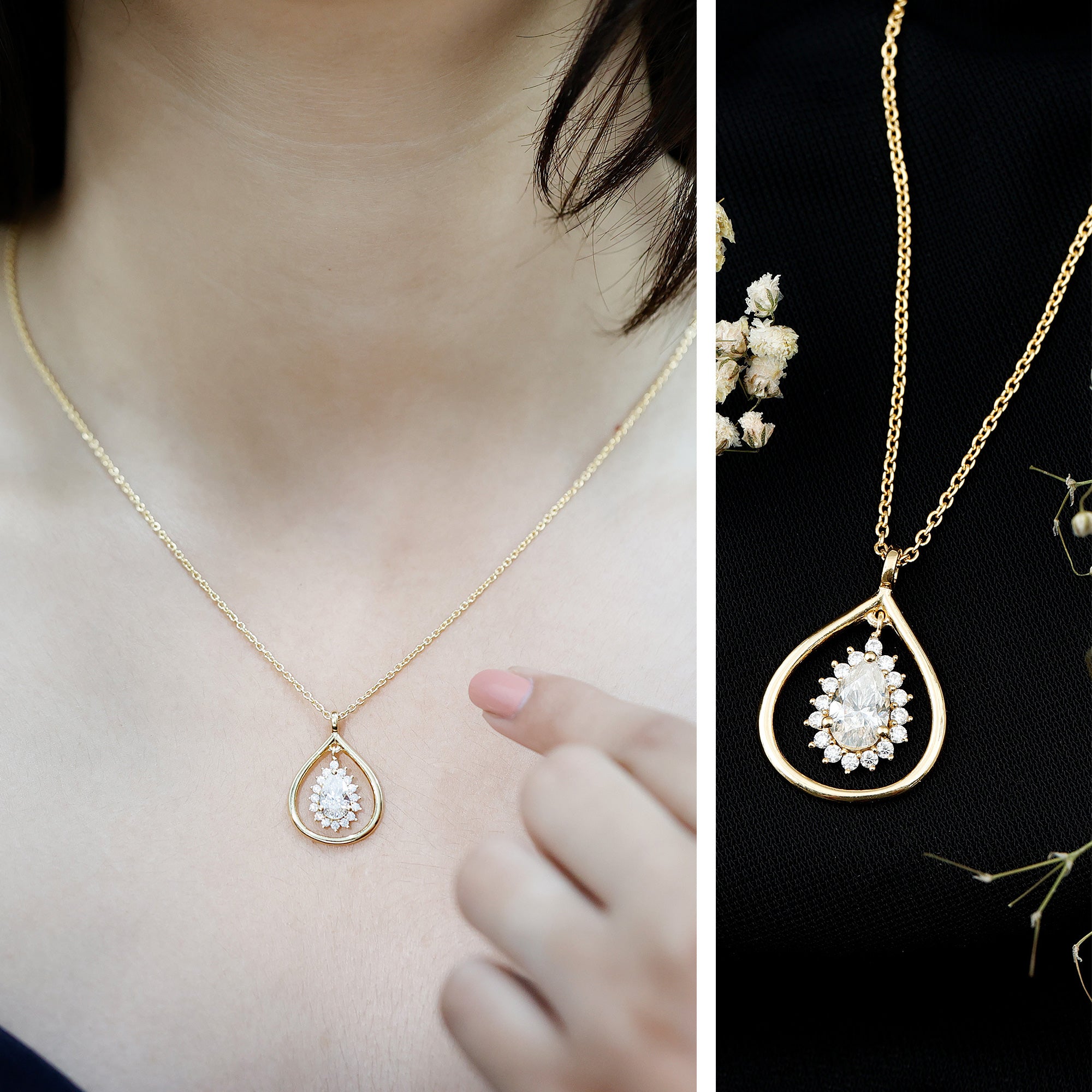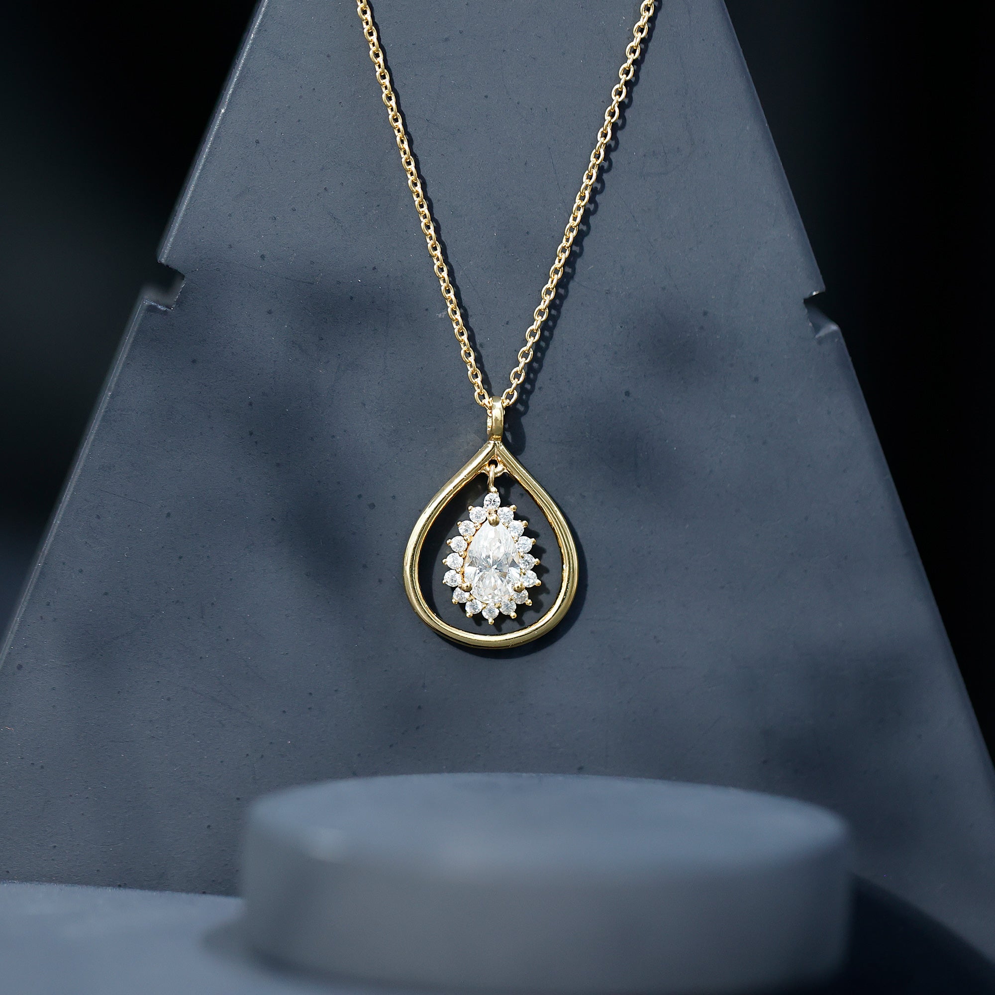 Radiating brilliance and charm, this Moissanite Pendant Necklace is designed to captivate from the very first glance. Handcrafted in 14k yellow gold plated silver, it features a stunning 5X8 MM pear shaped moissanite, graded D color and VS1 clarity, known for its unmatched sparkle and fire. Set securely in prong setting, the center stone is beautifully framed by a halo of round cut moissanites, enhancing its brilliance and giving the pendant a radiant glow. Adding to its visual appeal, the design features a graceful open teardrop frame that offers both elegance and modernity. The unique silhouette is further elevated by a refined, polished bail that adds a sophisticated finishing touch. Suspended from an adjustable chain, this Teardrop Necklace offers versatile styling, wear it solo for understated elegance or layer it with other pieces for a bolder, trend-forward look. Whether you are headed to a casual coffee date, a formal dinner, or simply dressing up your day, this Pear Shaped Moissanite Necklace seamlessly complements every outfit with its timeless yet fresh aesthetic. It arrives in a chic jewelry box, ready to gift or treasure. Perfect as a thoughtful gift for birthdays, anniversaries, Valentine’s Day, or simply as a treat to yourself, this Moissanite Chain with Pendant is a celebration of style, confidence, and joy. Because the best jewelry doesnt just complete your look, it reflects your glow and elevates your presence, wherever life takes you.