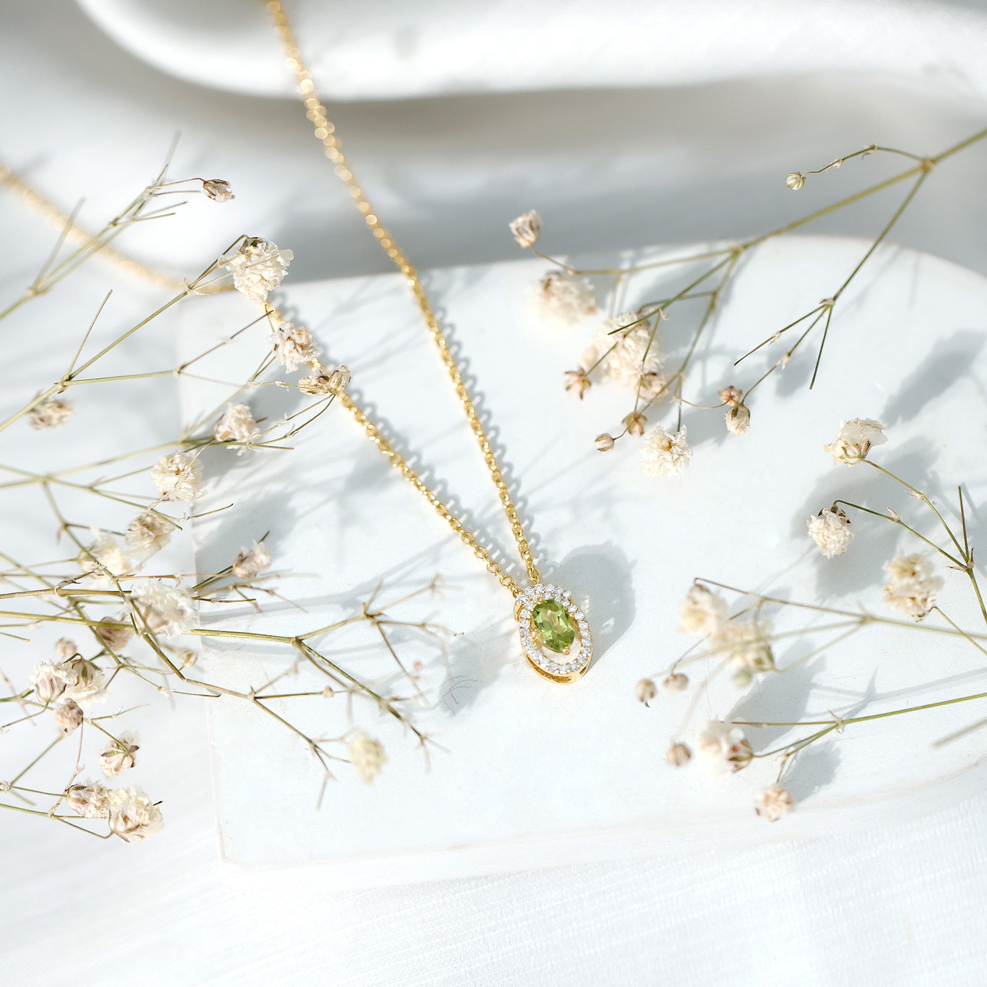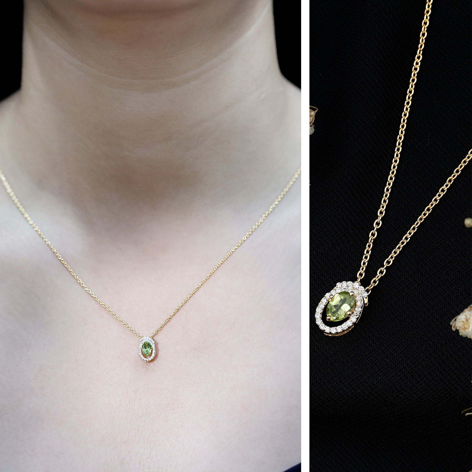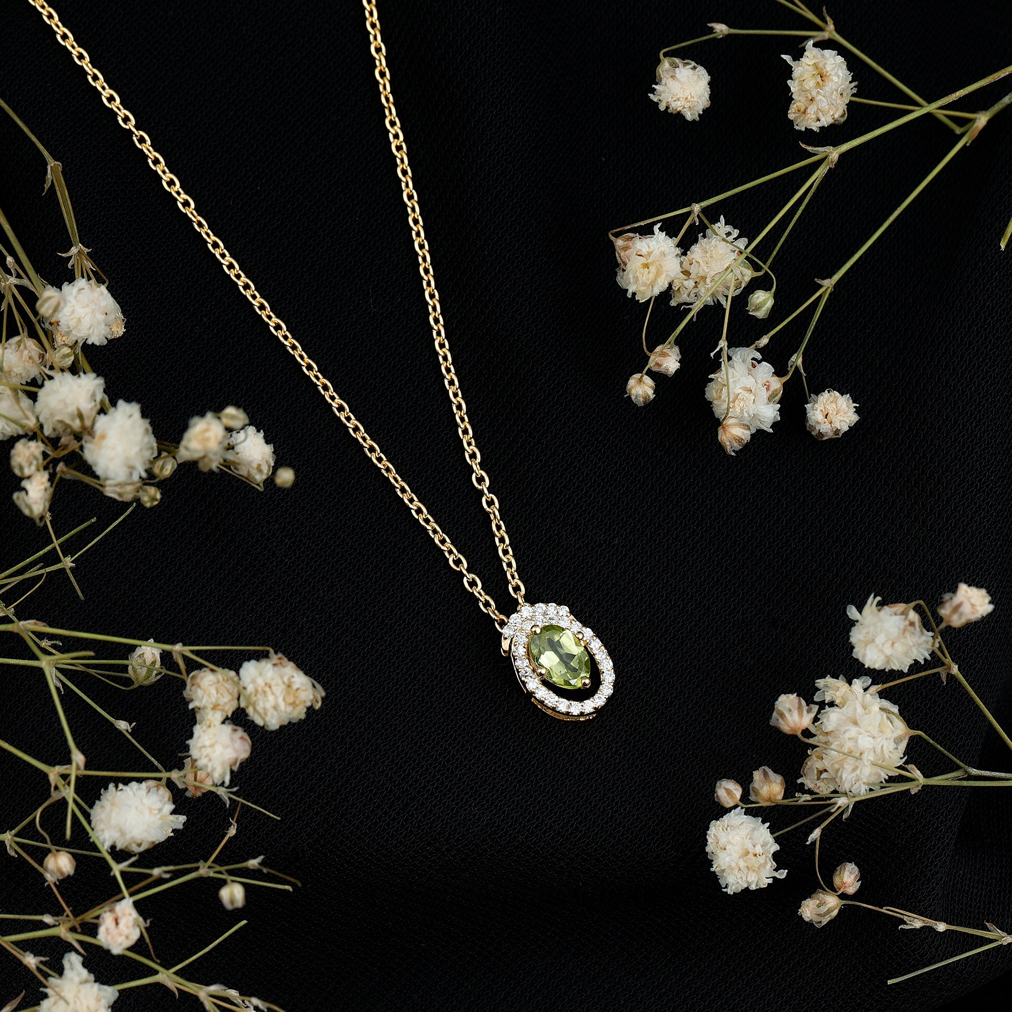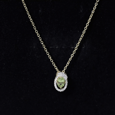 Just like life’s beautiful twists and turns, this swirl design wraps around the center stone with warmth and grace. Handcrafted in 14k yellow gold plated silver, the Peridot Pendant Necklace showcases a beautiful blend of thoughtful craftsmanship and timeless appeal. At the center, a stunning 4X5 MM oval shaped Peridot is gracefully set in safe prong setting. Surrounding the center stone is a swirl style halo made of round lab grown diamonds, each hand placed to form a flowing, spiral pattern that brings movement and sophistication to the piece. The elegant swirl creates a visual dance of curves and sparkle, making this Peridot and Diamond Necklace a conversation starter. The Oval Pendant hangs from a sleek and durable cable chain, giving it a modern finish while maintaining comfort and wearability. The Swirl Necklace features an AAA quality Peridot, paired with EF color VS clarity lab grown diamonds, offering exceptional sparkle and clarity. It arrives in a signature jewelry box, along with a gemstone certificate to assure you of its quality and authenticity. Elegant and meaningful, this necklace is made to shine with you, every step of the way.