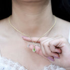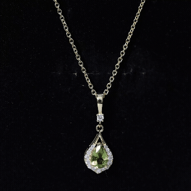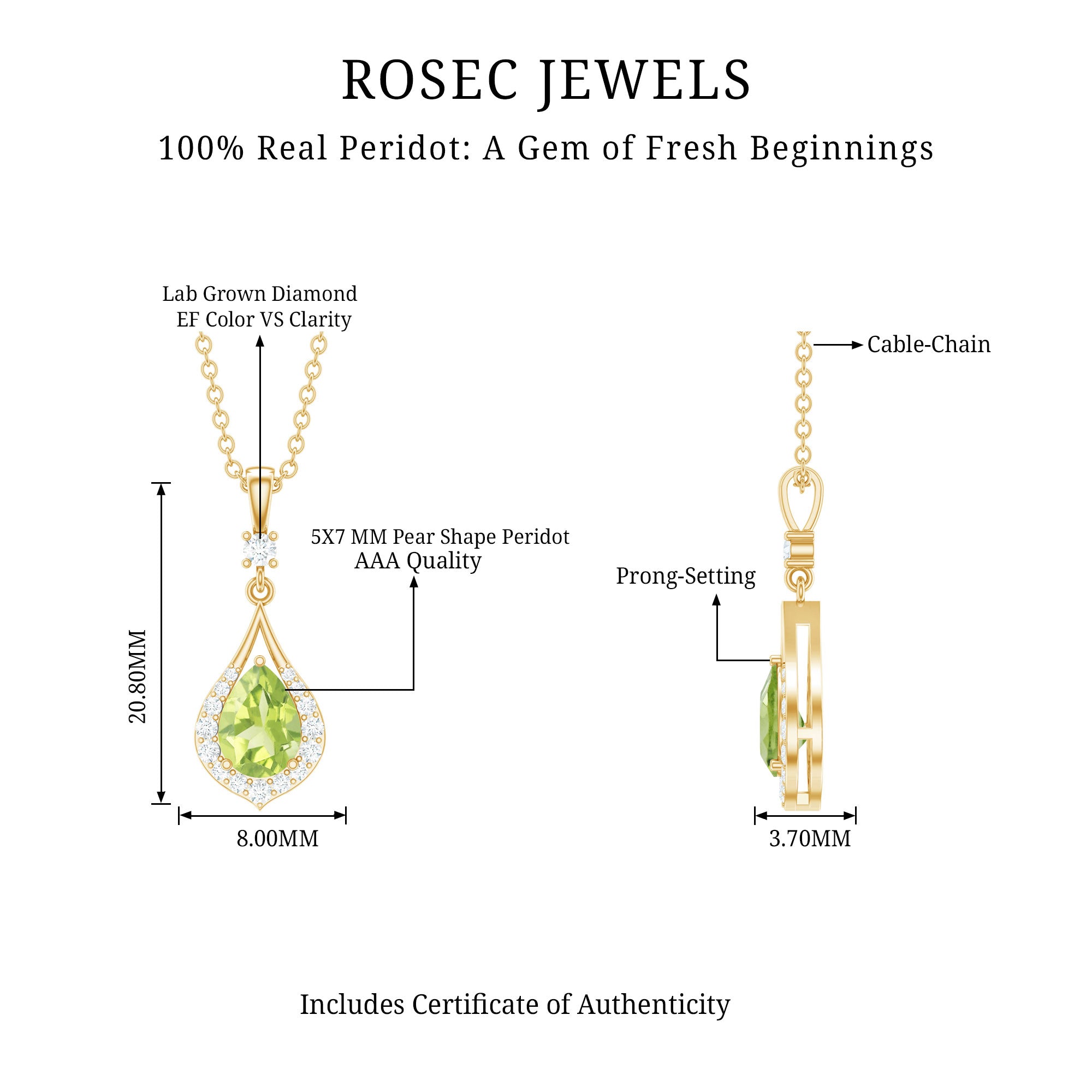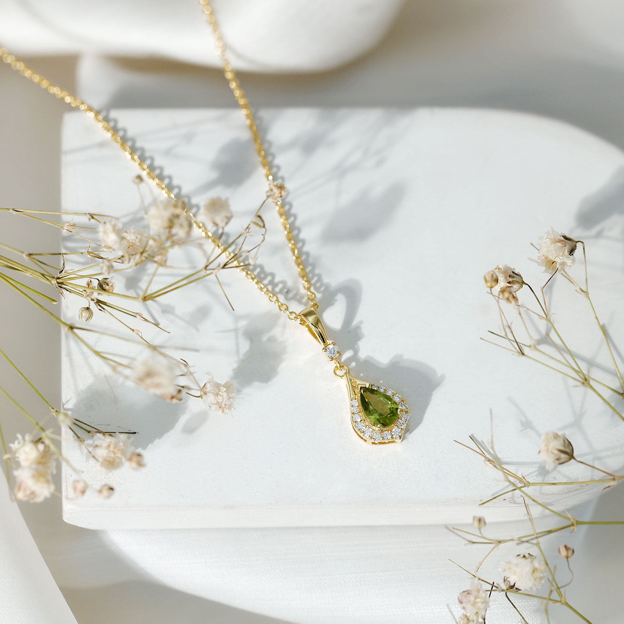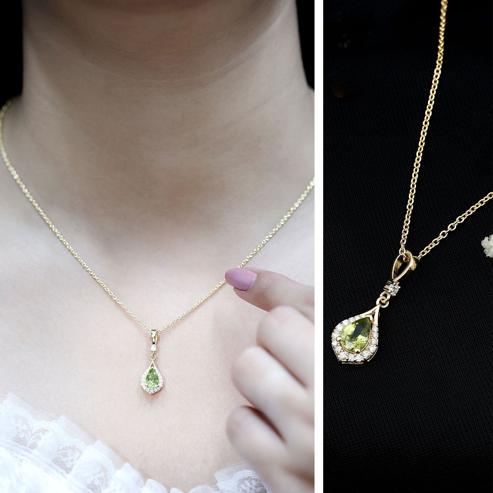 Make her heart smile with the refreshing glow of this Peridot Necklace, a beautiful piece that brings charm and meaning to every moment. Thoughtfully crafted in yellow gold plated silver, this Teardrop Pendant features a 5X7 MM pear shaped Peridot nestled in secure prong setting. The elegant teardrop frame is adorned with shimmering lab grown diamonds, adding a touch of brilliance that enhances the natural beauty of the centerpiece. Another delicate round diamond at the top connects the pendant to a graceful bail, allowing it to dangle effortlessly and catch the light with every move. The AAA quality Peridot and EF-VS quality lab grown diamond bring a perfect balance of vibrant color and sparkling brilliance, making this Wedding Drop Necklace a subtle showstopper for both casual days and special evenings. The smooth curves of the teardrop design offer timeless elegance, while the bright green stone adds a refreshing twist that is easy to fall in love with. Whether you are celebrating an August birthday, marking a meaningful milestone, or simply treating someone special, this Peridot and Diamond Necklace is a thoughtful and stylish gift.