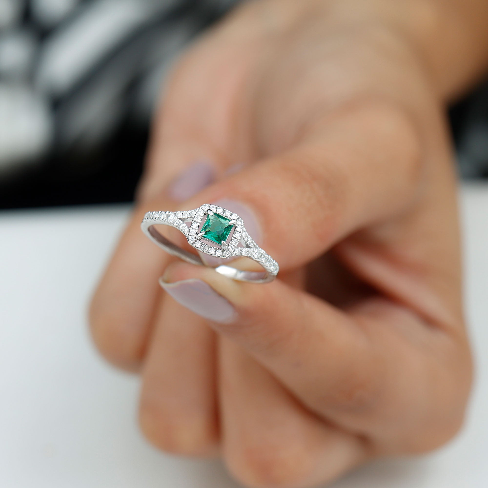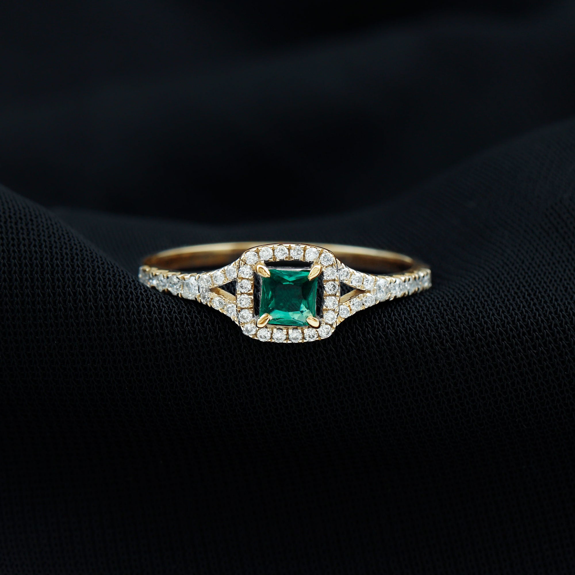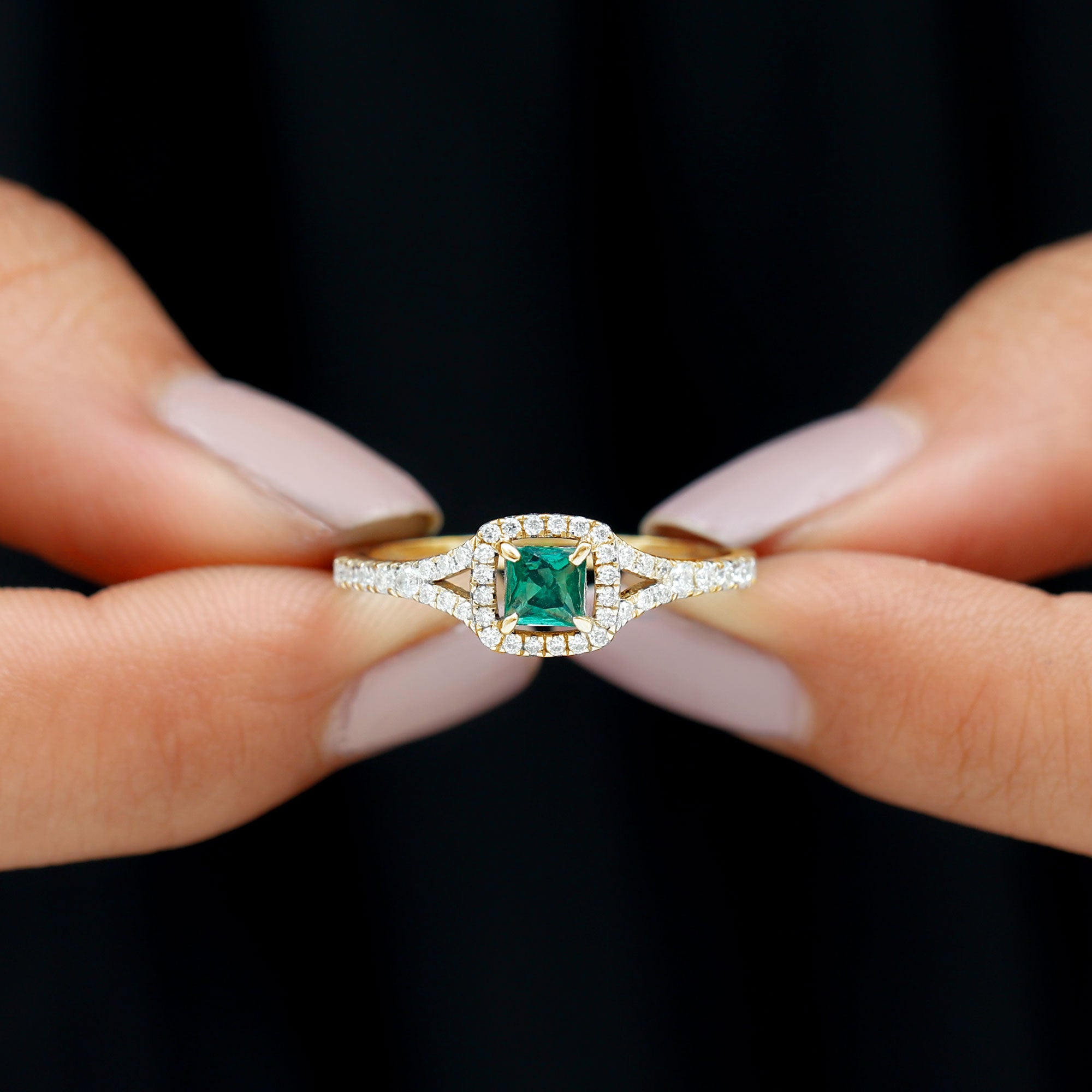A promise is a beautiful vow, a heartfelt commitment to stand by someone through every moment, big or small. This Lab Grown Emerald Ring is the perfect symbol of that special promise, representing love, trust, and a bright future together. At the center of this stunning Proposal Ring is a 4 mm Lab Grown Emerald in a Princess Cut, surrounded by a sparkling Halo of Diamond gemstones that enhance its vibrant green glow. The Lab Emerald symbolizes growth, hope, and harmony, making this Emerald Diamond Ring a meaningful choice for expressing your deep connection. The Split Shank Band adds an elegant touch, adorned with delicate Diamond that catch the light and add extra brilliance to the design. This thoughtful arrangement creates a graceful look, perfect for both everyday wear and special occasions. Available in various ring sizes, this Princess Cut Emerald Ring offers a comfortable fit and is designed to be cherished for a lifetime. This Emerald Halo Ring comes beautifully packaged in a jewelry box, ready to be gifted as a meaningful token of your love. Whether it is to celebrate a special milestone, an anniversary, or simply a promise of forever, this Promise Engagement Ring is the ideal choice to show your love timelessly and elegantly.