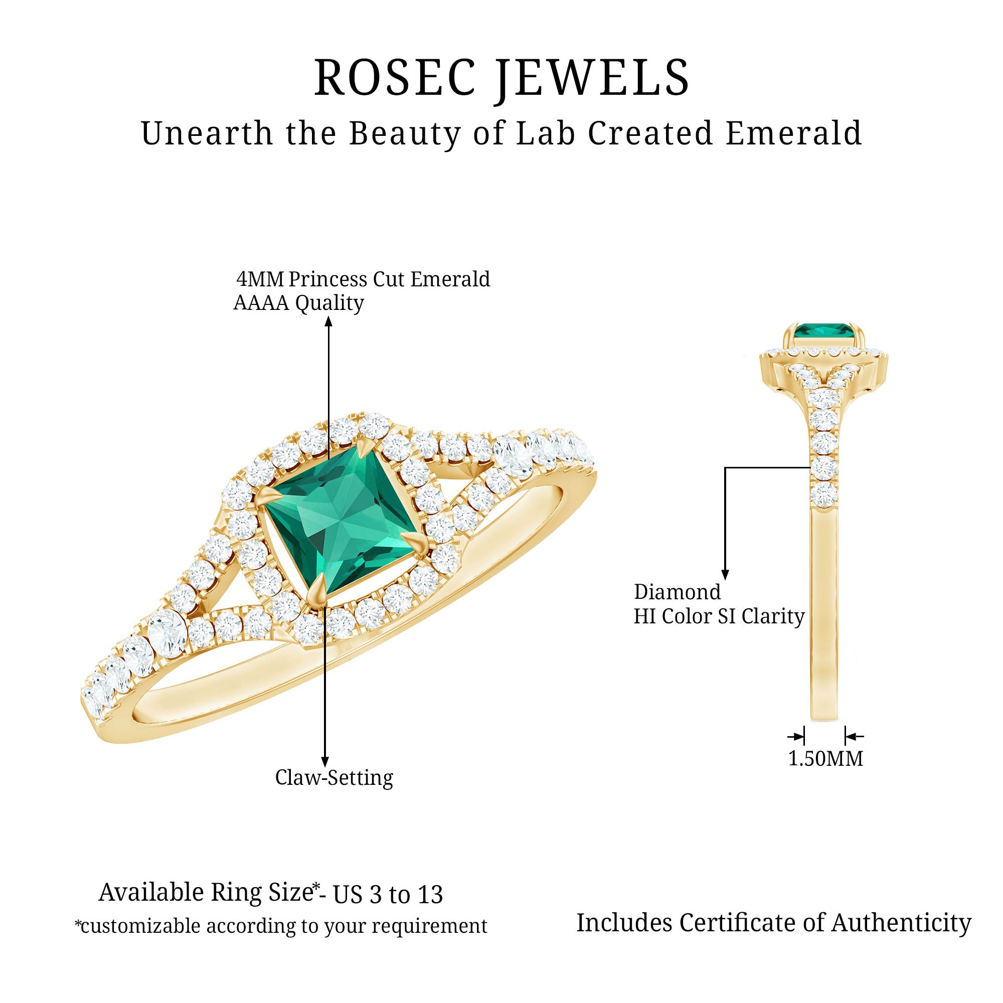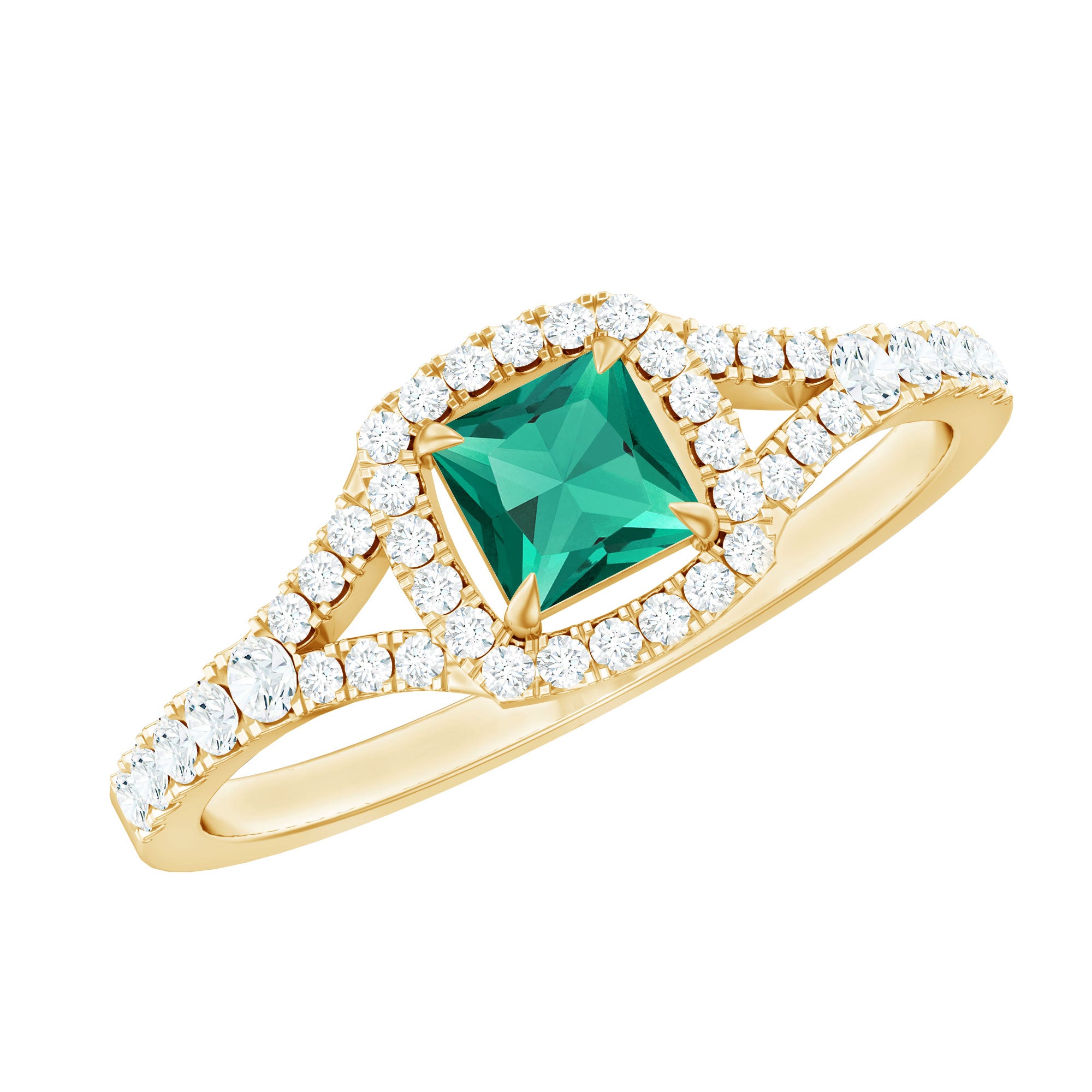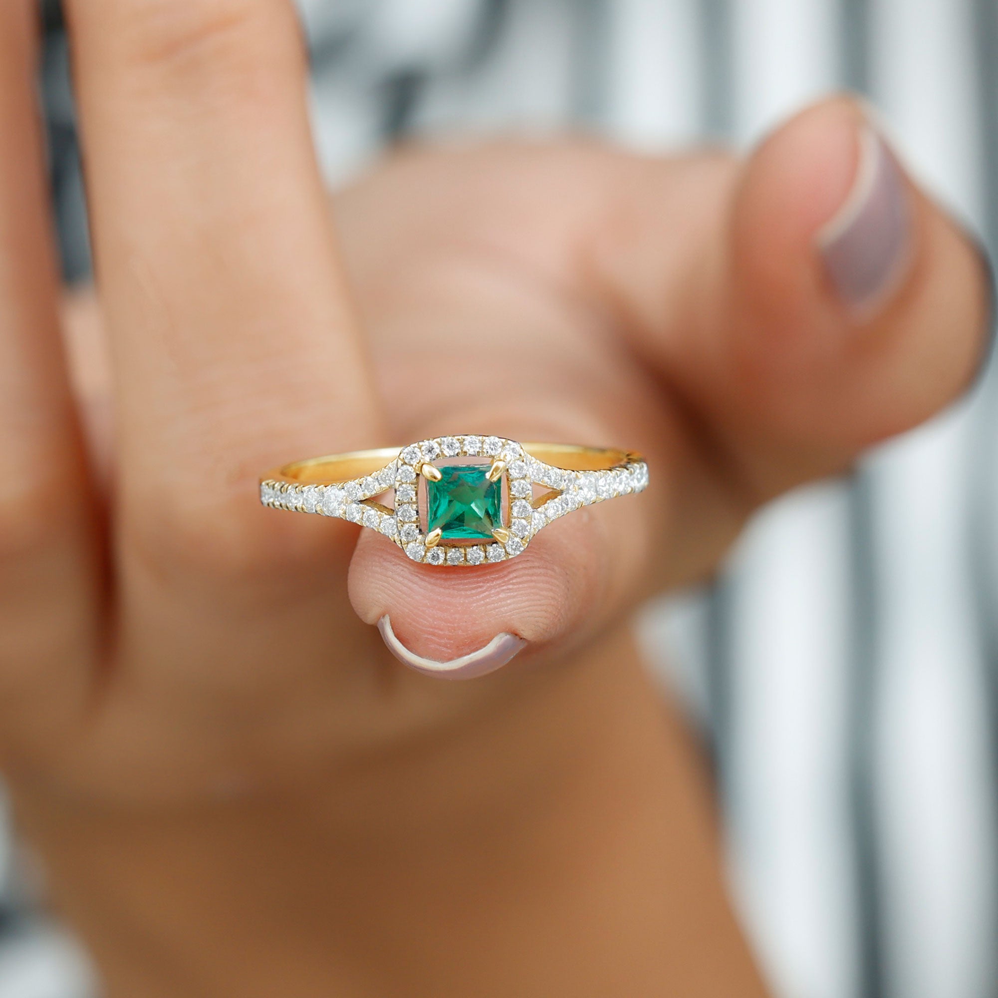 A promise is a beautiful vow, a heartfelt commitment to stand by someone through every moment, big or small. This Lab Grown Emerald Ring is the perfect symbol of that special promise, representing love, trust, and a bright future together. At the center of this stunning Proposal Ring is a 4 mm Lab Grown Emerald in a Princess Cut, surrounded by a sparkling Halo of Diamond gemstones that enhance its vibrant green glow. The Lab Emerald symbolizes growth, hope, and harmony, making this Emerald Diamond Ring a meaningful choice for expressing your deep connection. The Split Shank Band adds an elegant touch, adorned with delicate Diamond that catch the light and add extra brilliance to the design. This thoughtful arrangement creates a graceful look, perfect for both everyday wear and special occasions. Available in various ring sizes, this Princess Cut Emerald Ring offers a comfortable fit and is designed to be cherished for a lifetime. This Emerald Halo Ring comes beautifully packaged in a jewelry box, ready to be gifted as a meaningful token of your love. Whether it is to celebrate a special milestone, an anniversary, or simply a promise of forever, this Promise Engagement Ring is the ideal choice to show your love timelessly and elegantly.