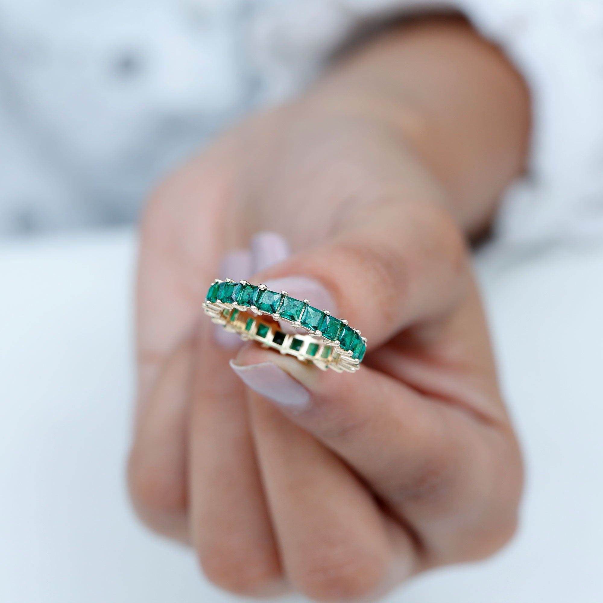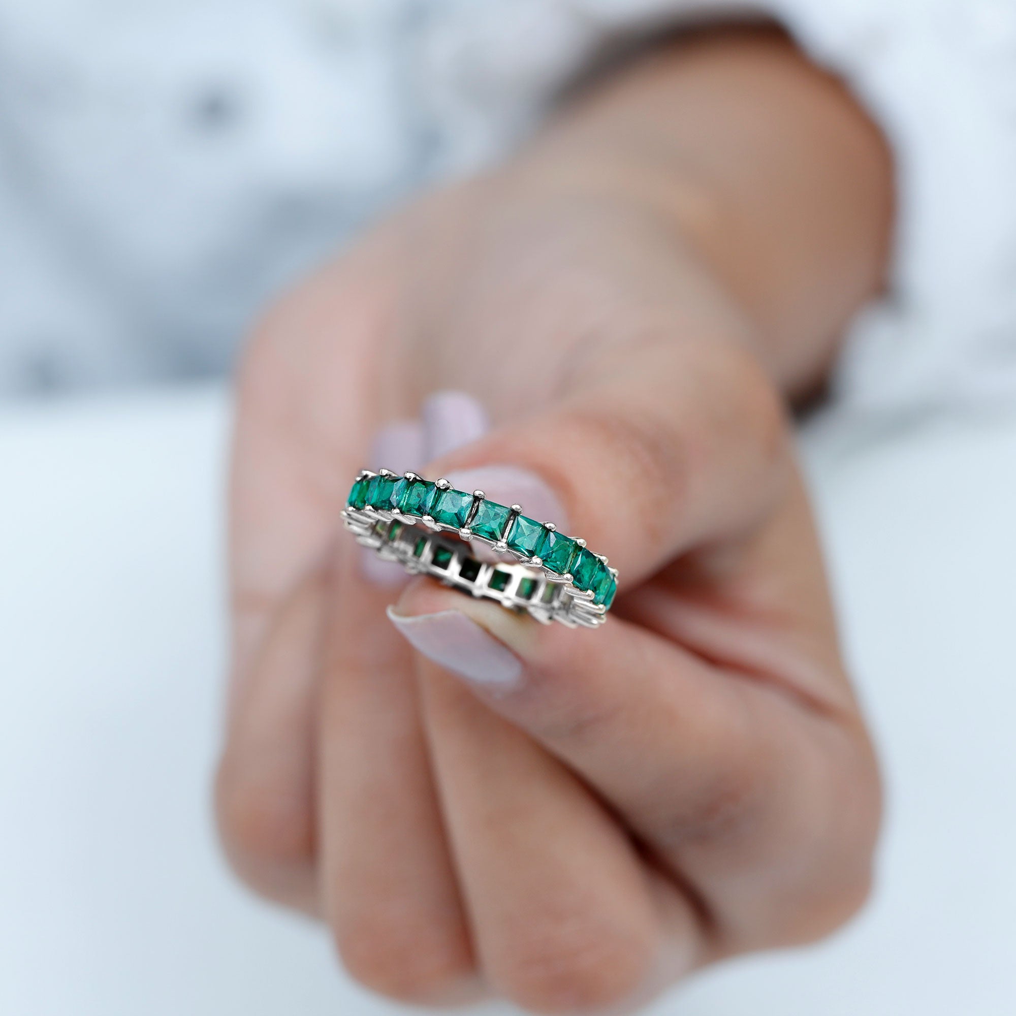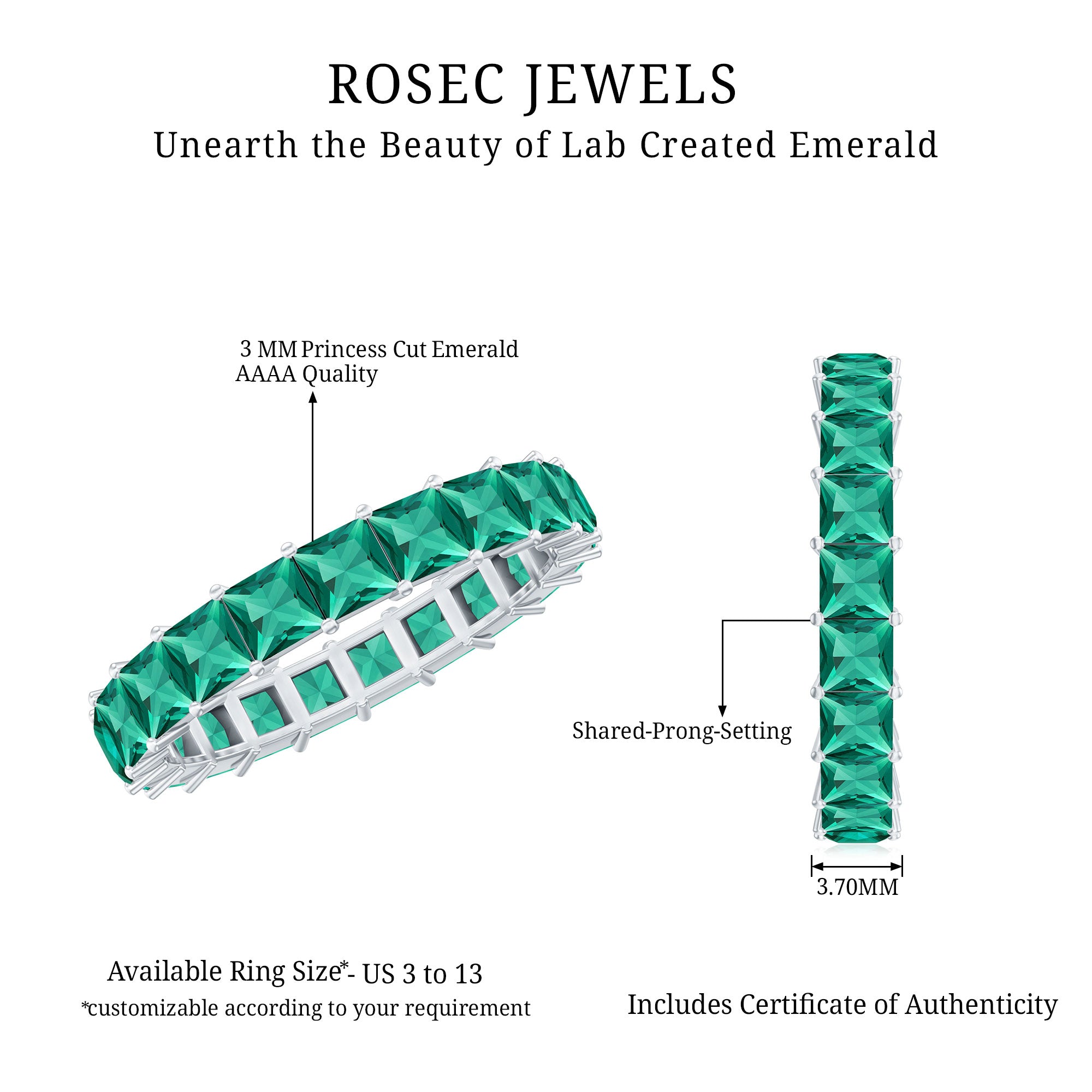 Celebrate everlasting love with this Eternity Wedding Band, a stunning blend of modern elegance and meaningful symbolism. Featuring 3 mm Princess Cut Lab Created Emerald stones in Shared Prong Setting, this Full Eternity Band radiates a vibrant green glow, symbolizing growth, harmony and renewal, perfect for a couple beginning their lifelong journey together. This Lab Grown Emerald Ring is designed to sit comfortably on the finger while adding a touch of bold sophistication. Lab grown for ethical and sustainable brilliance, each Lab Emerald offers exceptional clarity and color, that makes this Lab Emerald Wedding Band a radiant and responsible choice. Whether worn alone for minimalist elegance or paired with an engagement ring for added sparkle, this Princess Cut Wedding Band makes a timeless statement of devotion. Available in various US ring sizes, this Princess Cut Eternity Band ensures the perfect fit for every bride or groom. Rosec Jewels presents this handcrafted Wedding Band, thoughtfully packaged in a Signature Jewelry Box, ready to symbolize your unique love story and cherish forever.