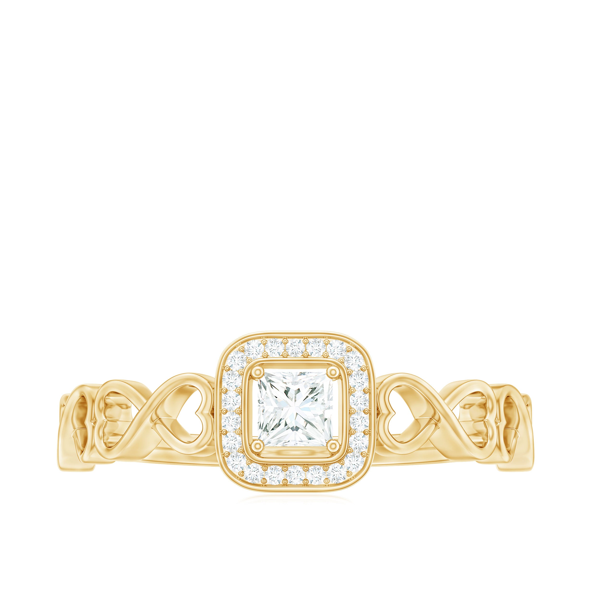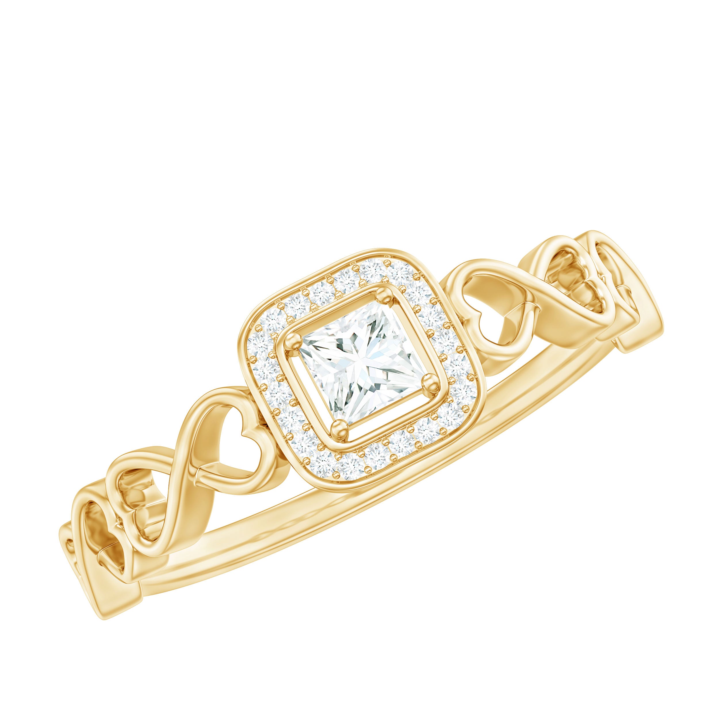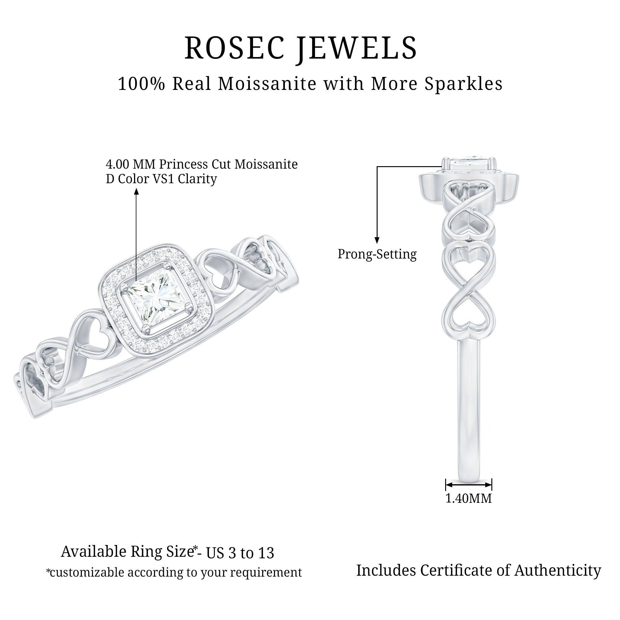 Celebrate your love with this beautiful Moissanite Promise Ring, designed to symbolize commitment, connection, and forever. At the center of this Promise Engagement Ring is a sparkling 4 MM Princess Cut Moissanite (D Color VS1 Clarity). Set in secure prong setting, the center stone shines brightly and catches the light from every angle. Surrounding the center stone is a floating halo of small round moissanite stones that add extra sparkle and elegance to the design. The band is crafted with a unique and romantic twist, a series of heart infinity symbols, beautifully blended to show everlasting love and heartfelt promise. This meaningful design makes the Infinity Band Engagement Ring a perfect choice for engagements, anniversaries, or simply to show your love. It is ideal for someone who loves delicate details, shine, and symbolic jewelry. Available in US sizes 3 to 13, it offers a comfortable fit for everyday wear. It arrives in an elegant jewelry box, ready to gift and treasure forever. Let this Princess Cut Moissanite Ring be the shining symbol of your love story.