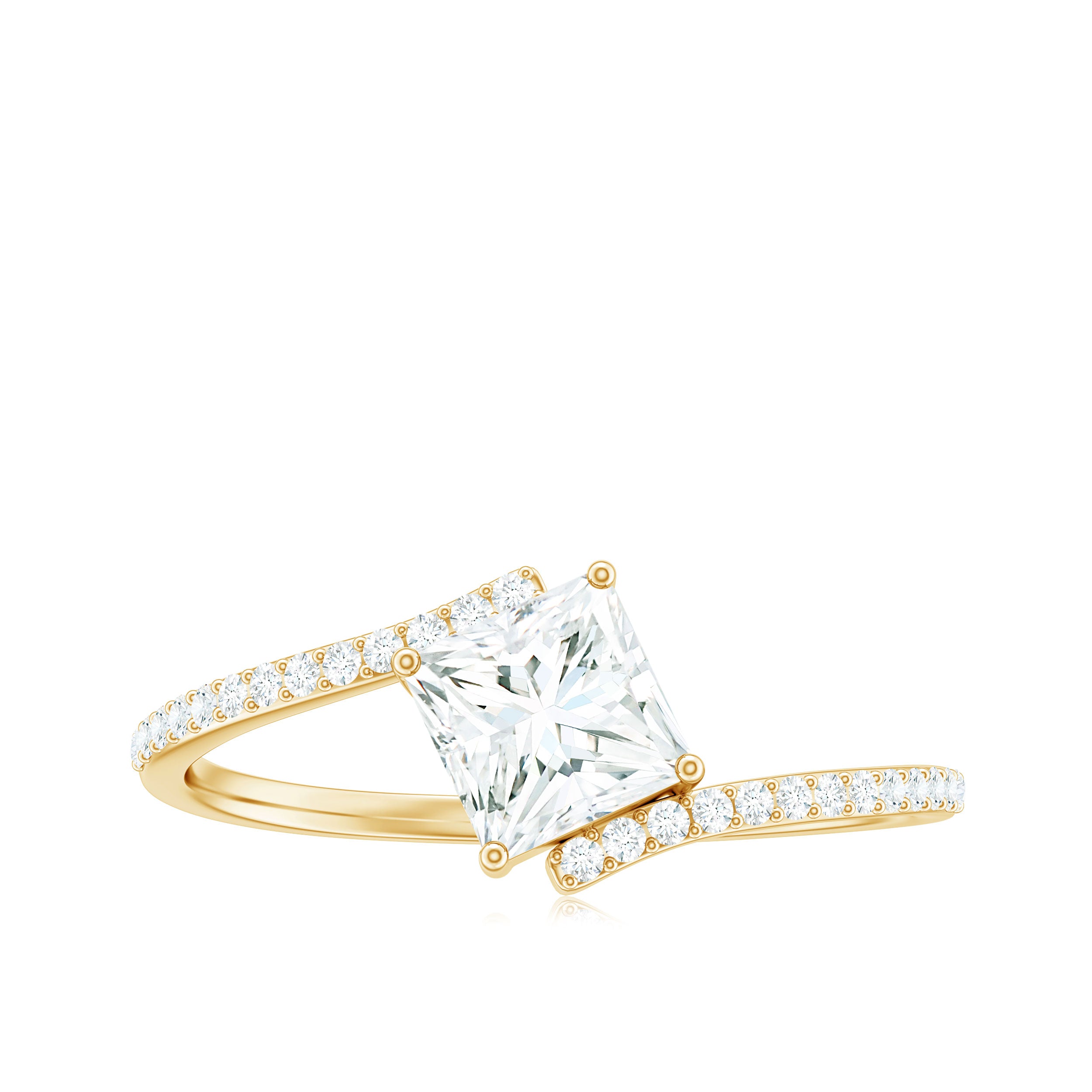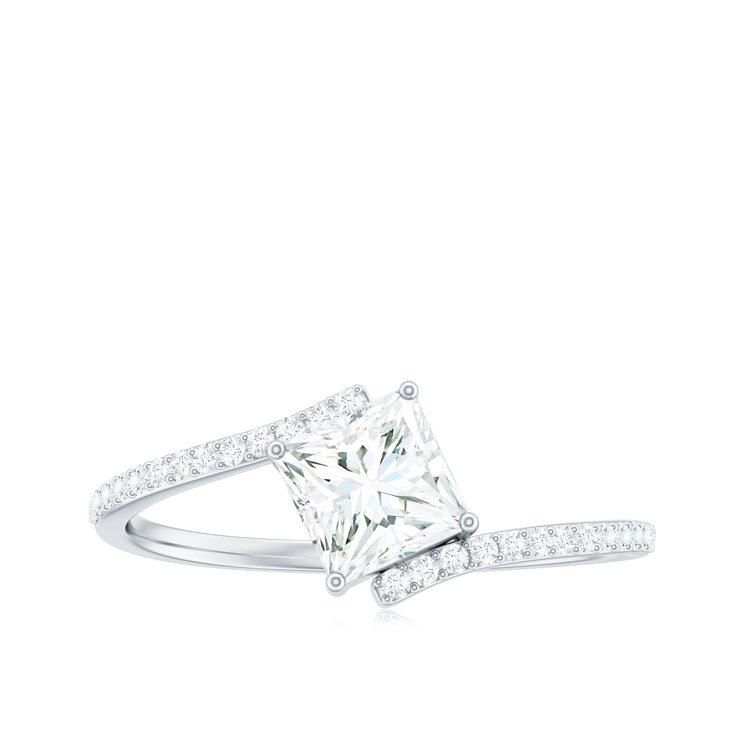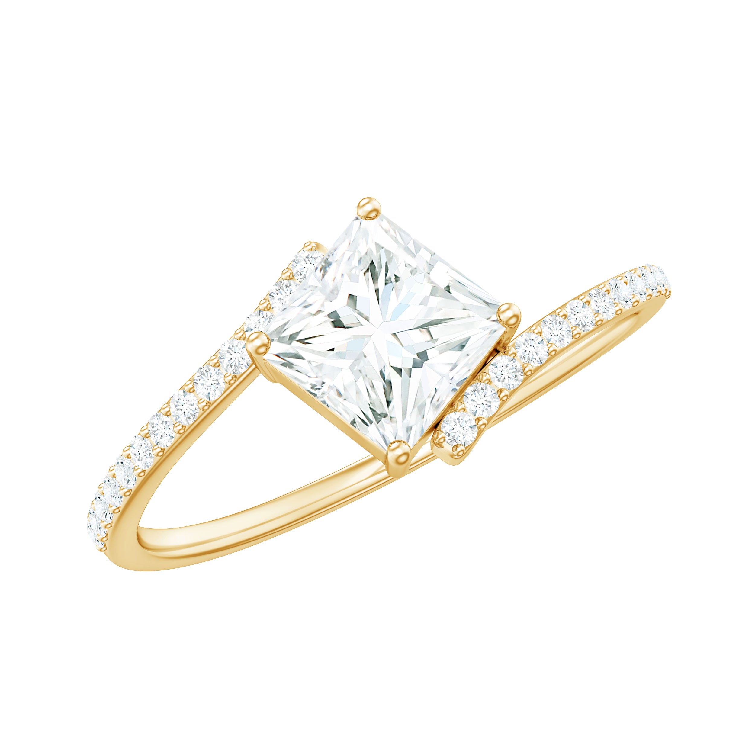 Designed with elegance and charm, and cherished by everyone who gazes upon it, this opulent enchanted Engagement Ring boasts a radiant sparkle that may surpass even a true loves kiss. This Solitaire Bypass Ring showcases a 5 mm princess cut Moissanite prominently set in a prong setting in a tilted style. What makes this Square Engagement Ring more special is, its bypass shank which is embellished with tiny round shape moissanite stones. A ring of such exquisite design and truly dazzling brilliance is sure to make your princess heart flutter. The elegant and minimalist bypass shank gracefully curves to embrace the shimmering heart, merging traditional allure with a contemporary form that not only provides a modern look but also safeguards the stone, making this 1 Carat Moissanite Ring ideal for regular wear with all necessary precautions. Meticulously handcrafted, this Princess Cut Moissanite Ring is available in various high-quality metal purity options and colors. Moreover, it comes in US standard sizes ranging from 3 to 13, ensuring a perfect fit for every hand. Whether it is for a proposal, an anniversary, or a special moment shared between the two of you, this Solitaire Moissanite Ring is a timeless treasure that she will cherish for a lifetime. A classic design intended to evoke feelings — just as yours did when you found your soulmate.